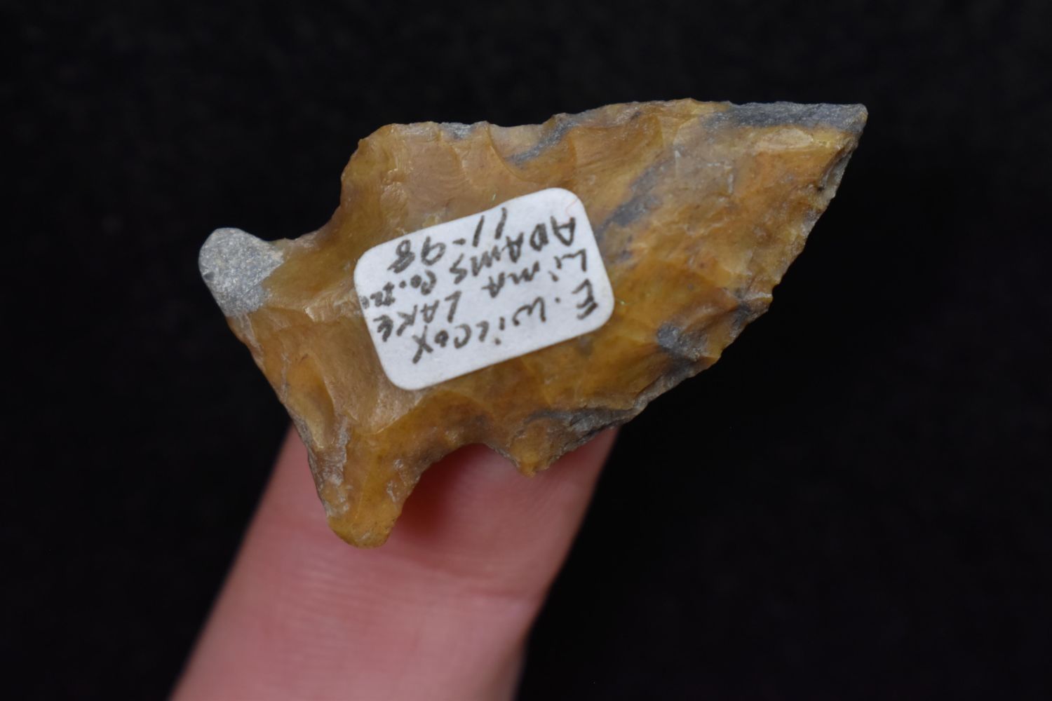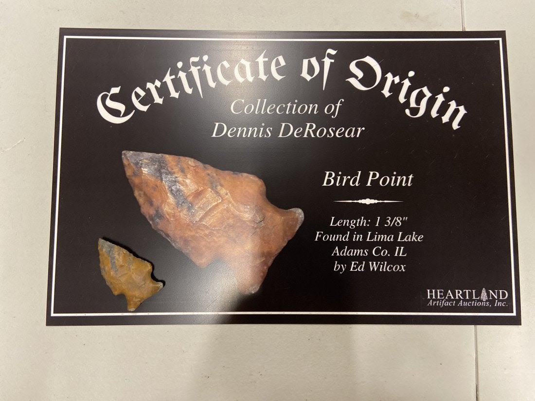 1 3/8" Bird Point Found in Lima Lake, Adams County IL by Ed Wilcox in 1998. Native American Artifact