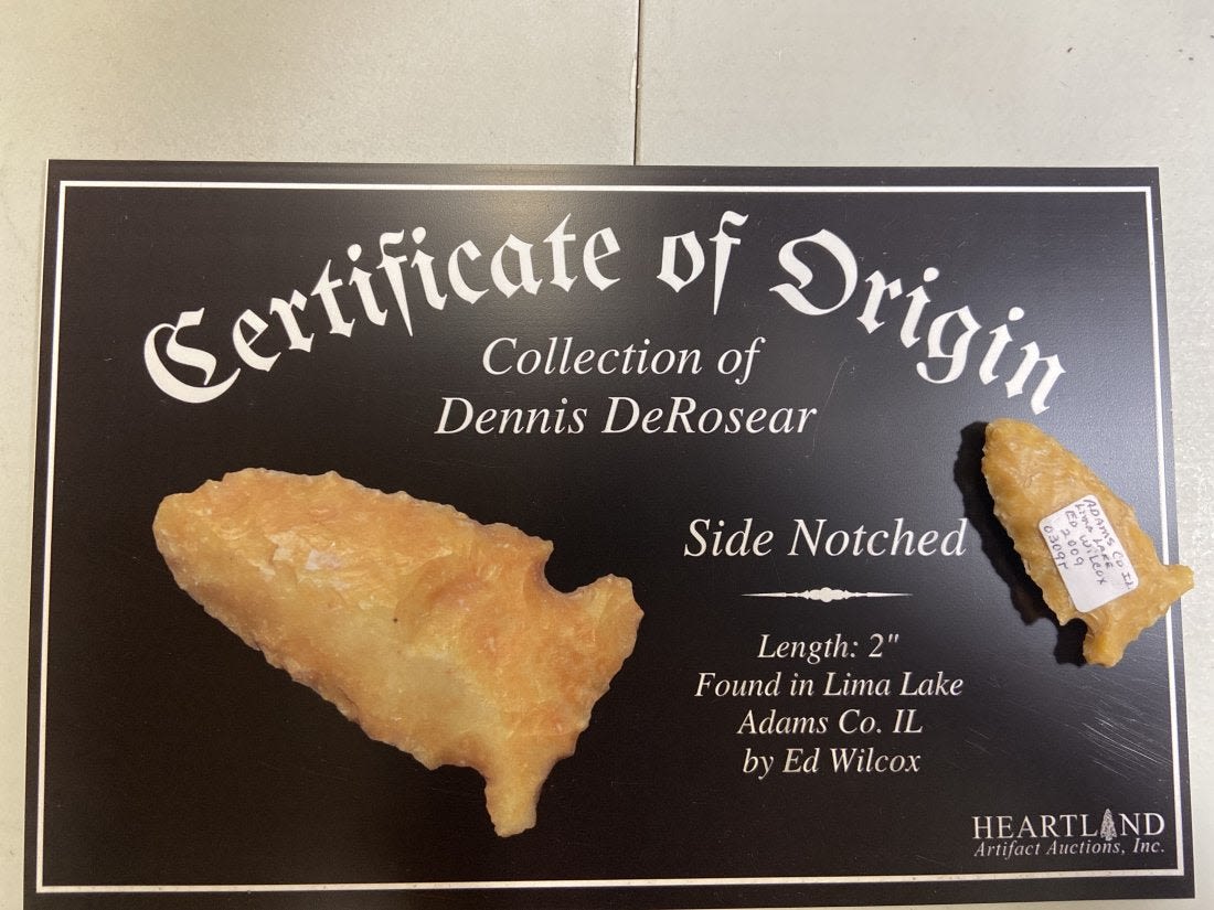 2" Side Notched Point Found in Lima Lake, Adams County IL by Ed Wilcox in 2009. Native American Artifact