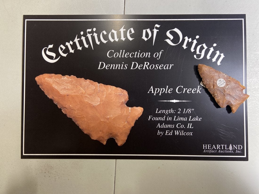 2 1/8" Apple Creek Point Found in Lima Lake, Adams County IL by Ed Wilcox in 1996. Native American Artifact