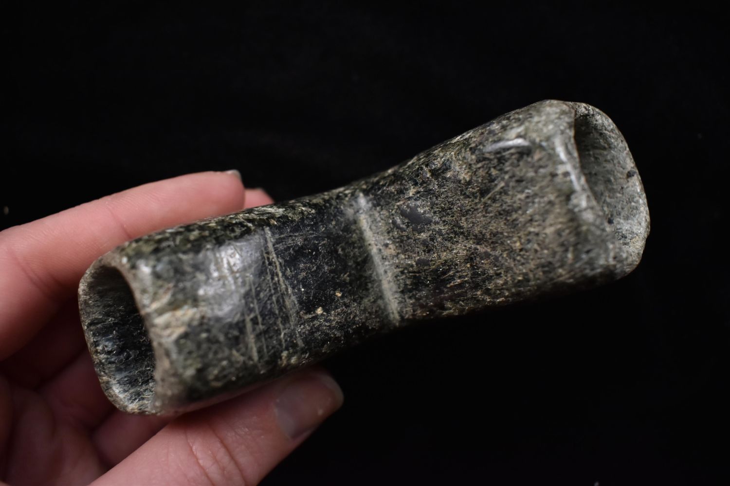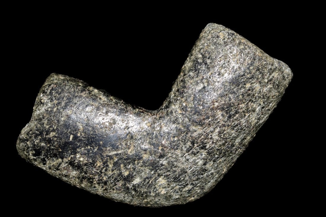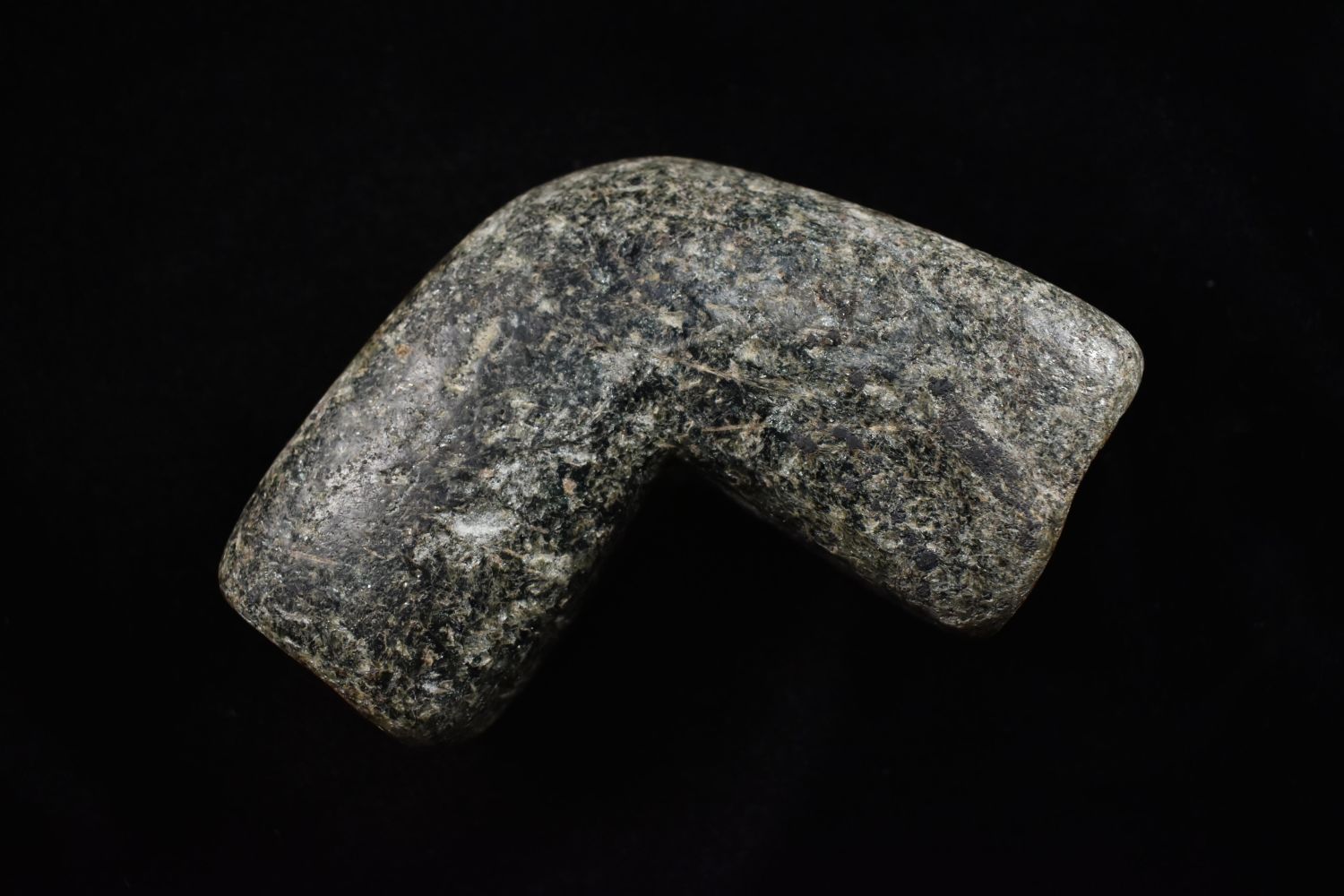 3 1/2" steatite elbow Pipe with excellent polish, and use wear hand engraving. Found on the East Coast, Native American Artifact