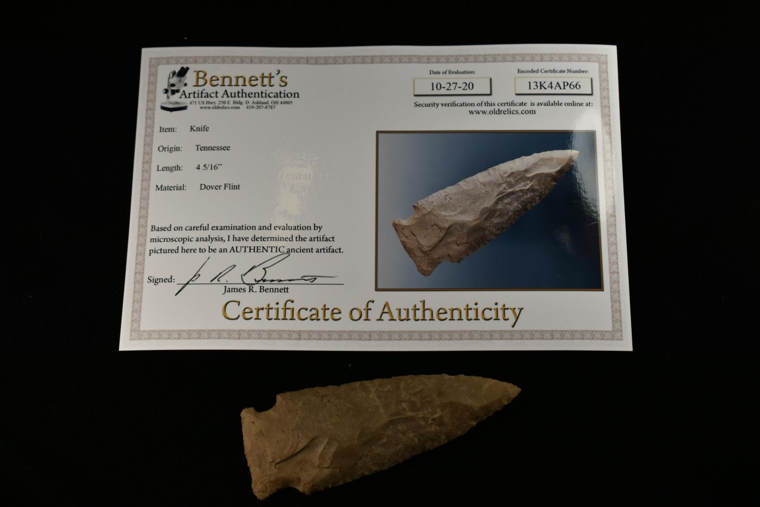 4 5/16" Side Notched Knife, Dover Flint, TN, Bennet COA, Native American Artifact