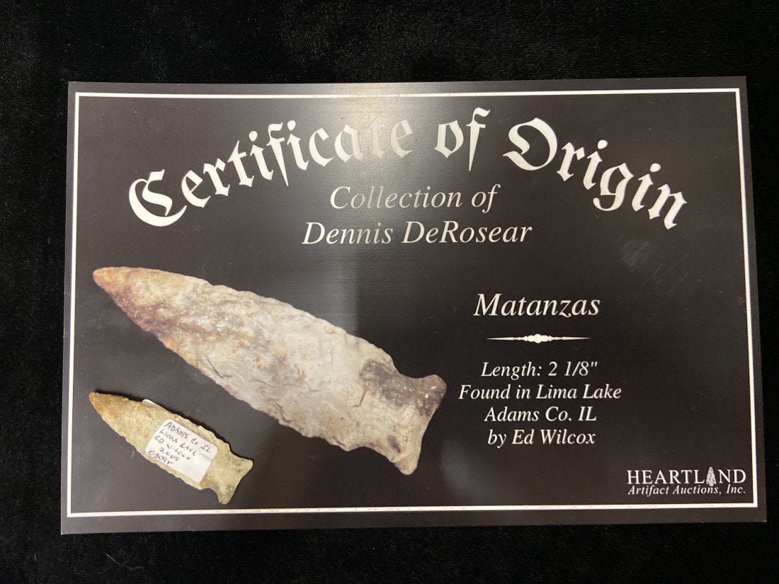 2 1/8" Matanzas Point Found in Lima Lake, Adams County IL by Ed Wilcox in 2009. Native American Artifact
