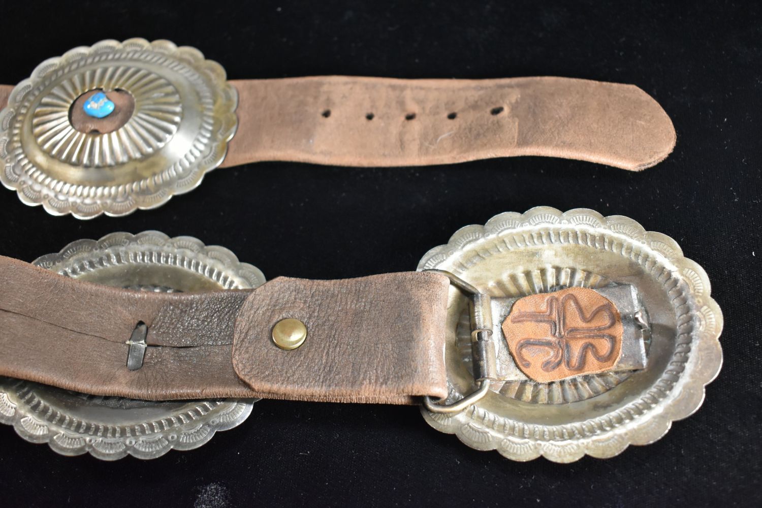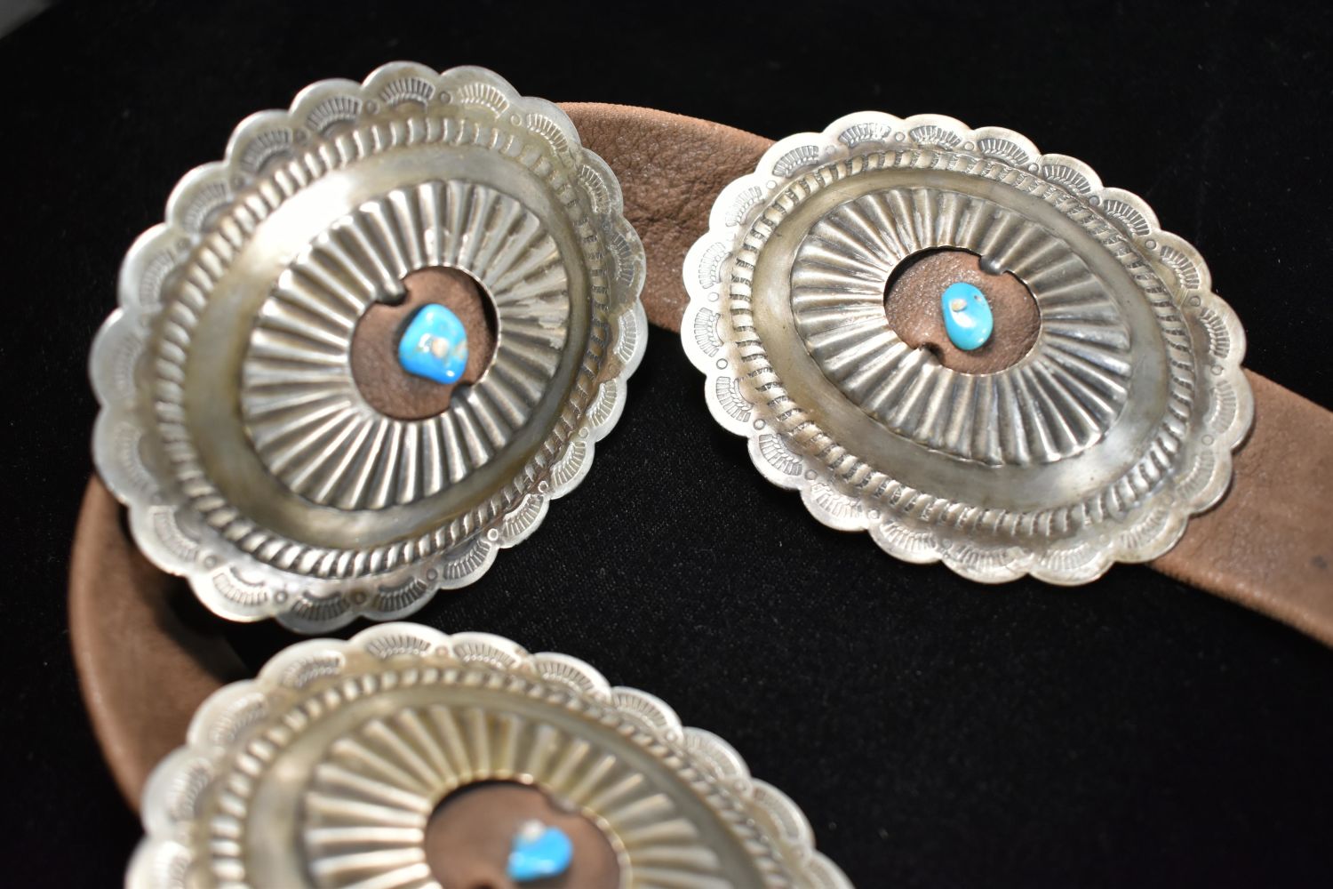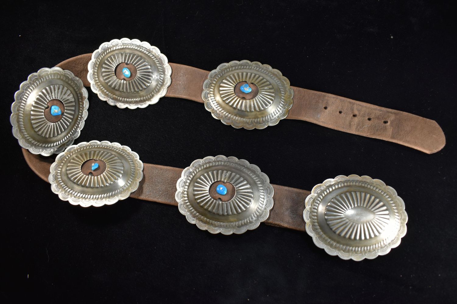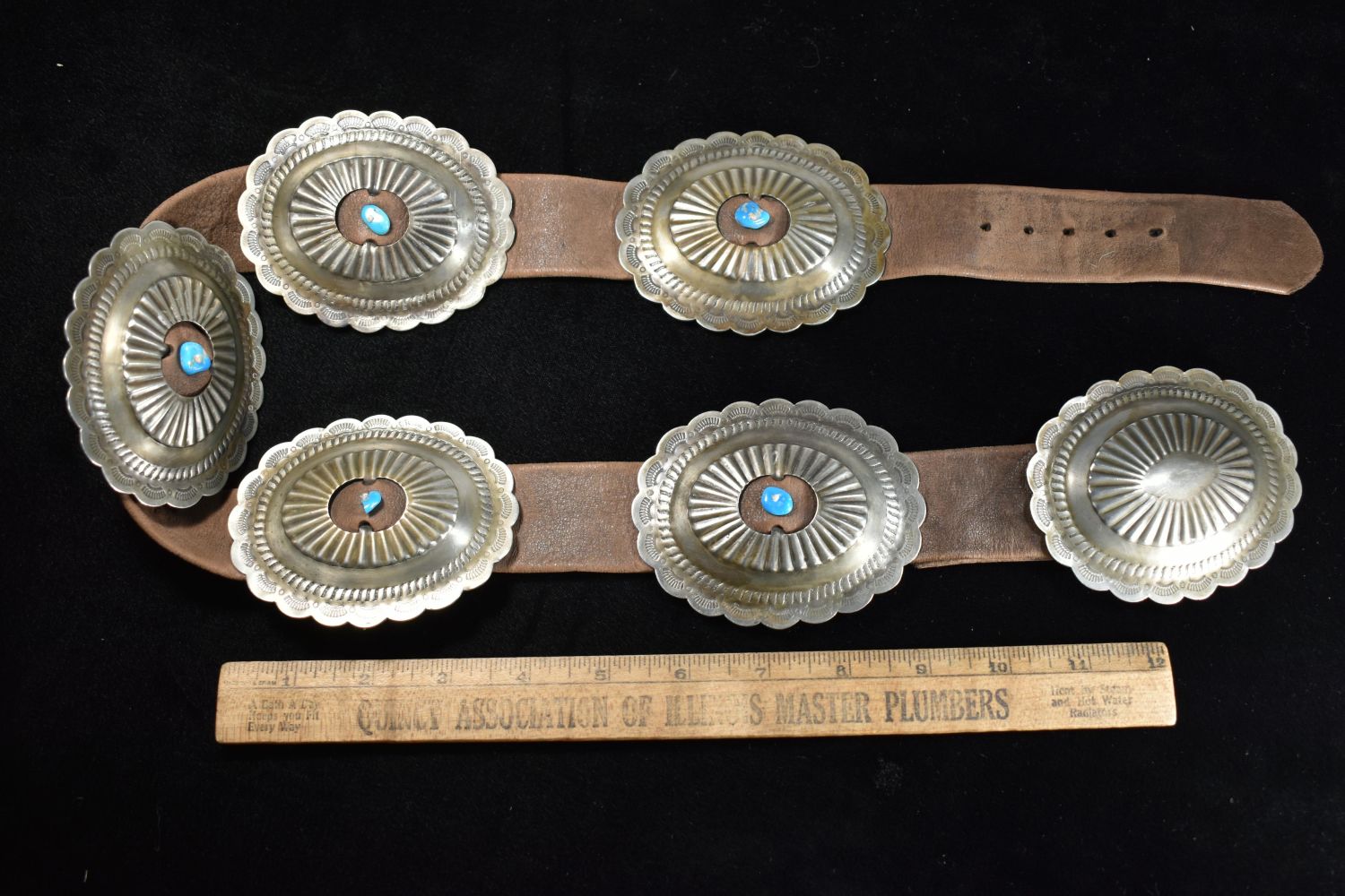 Vintage Native American Concho Belt with Inlaid Turquoise, Coral, in Silver Artist T.C., Belt Size 36