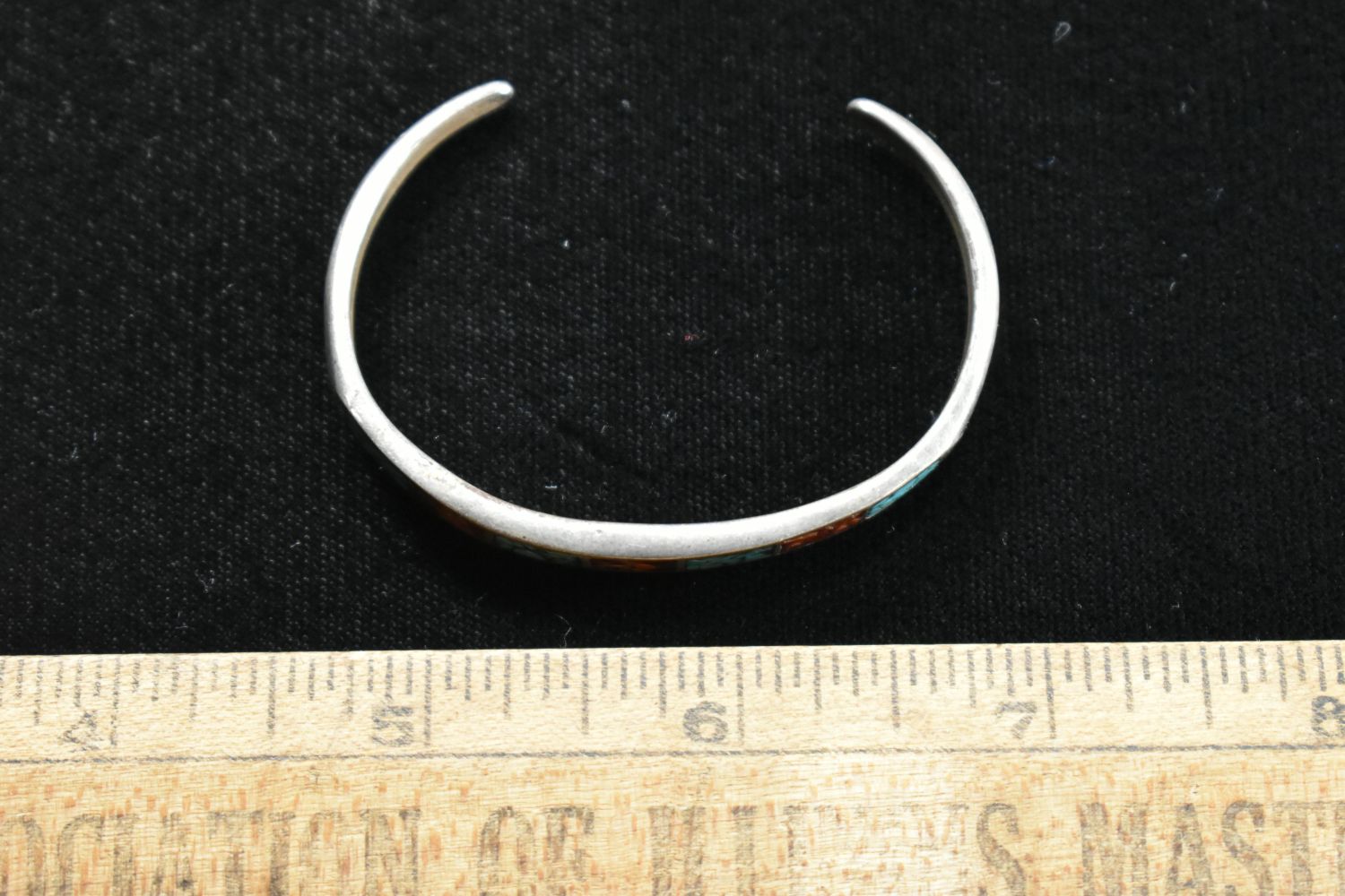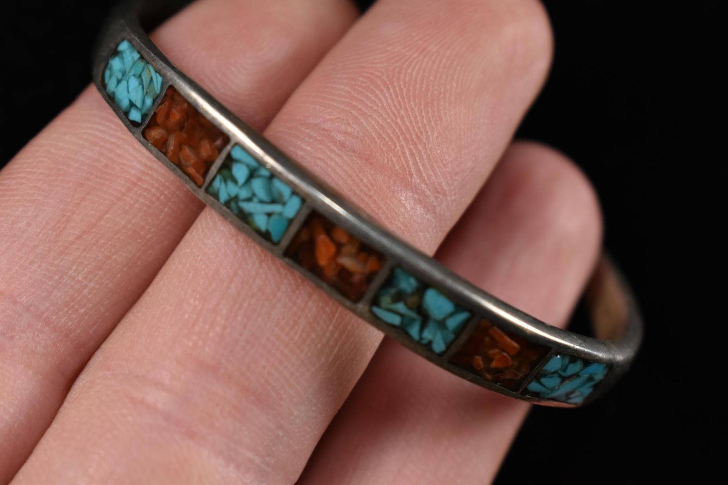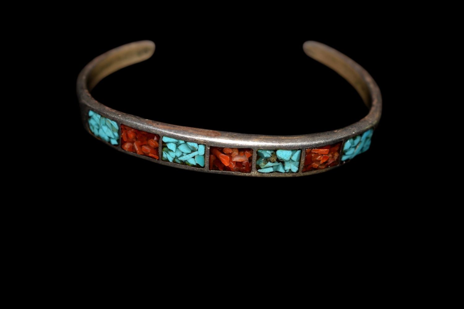 Vintage Native American Bracelet, Inlaid Coral, Turquoise in Silver, Jewelry