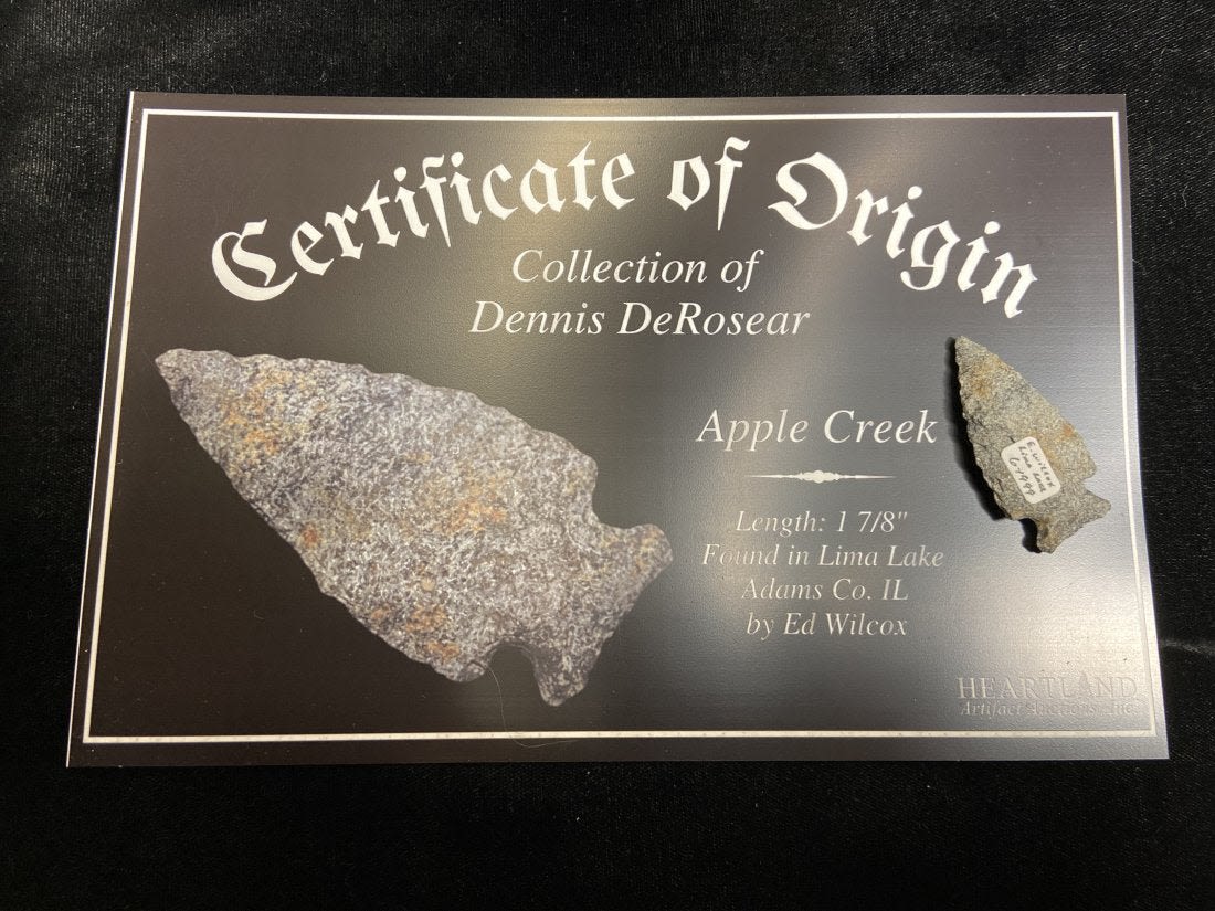 1 7/8" Apple Creek Point Found in Lima Lake, Adams County IL by Ed Wilcox in 1999. Native American Artifact