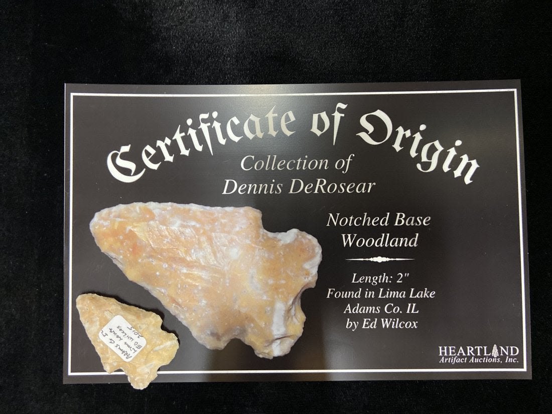 2" Notched base woodland Point Found in Lima Lake, Adams County IL by Ed Wilcox in 2015. Native American Artifact
