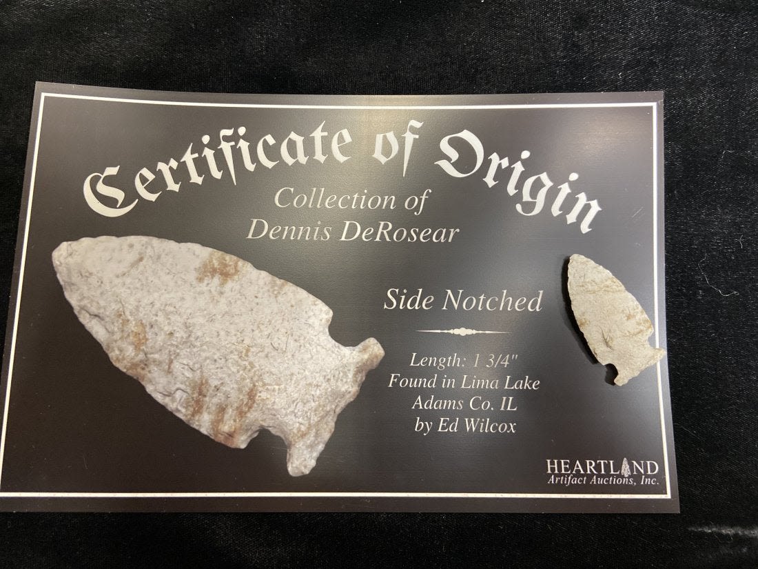 1 3/4" Side Notched Point Found in Lima Lake, Adams County IL by Ed Wilcox. Native American Artifact