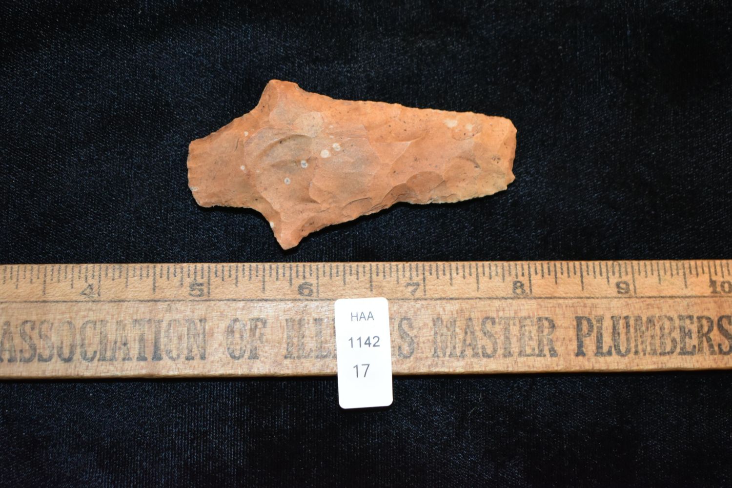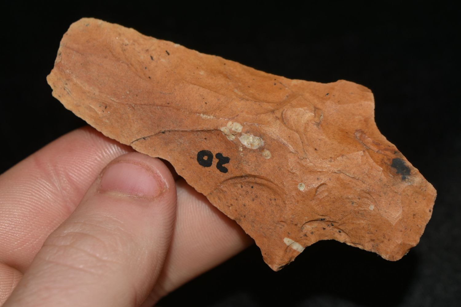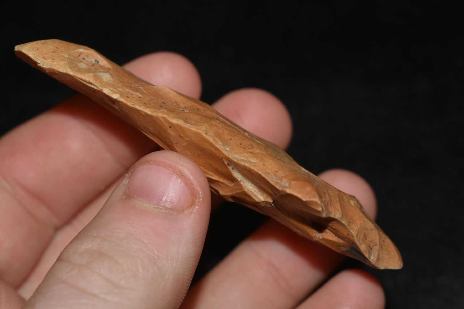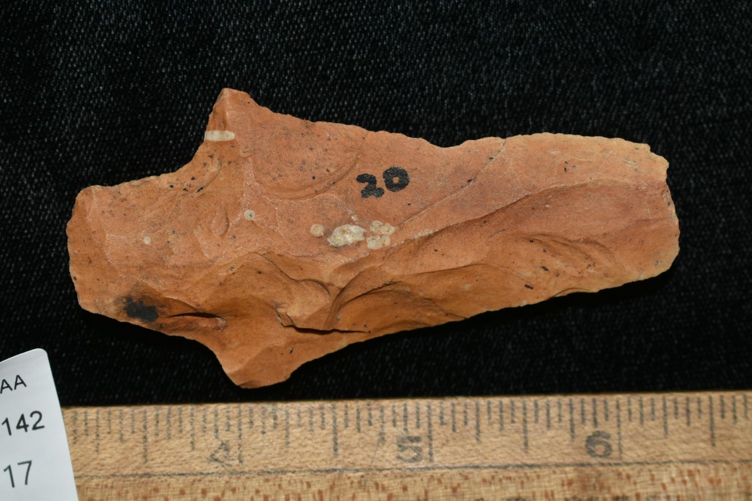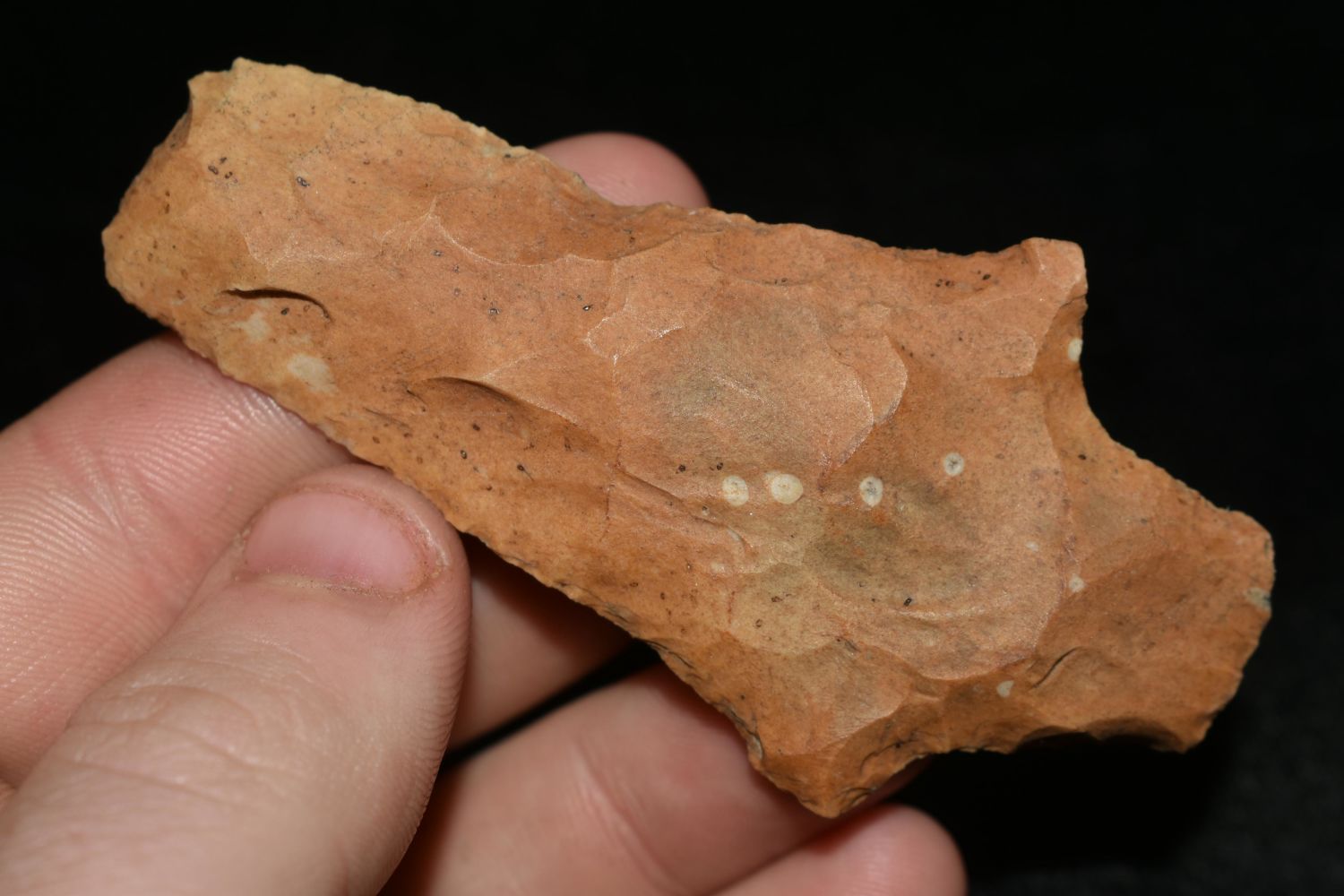 3 1/4" LONG COLORFUL CHISEL TIPPED PICKWICH HAFTED SCRAPER FOUND IN THE BENTON / HUMPHREYS COUNTY TENNESSEE AREA BY E.J. SIMS