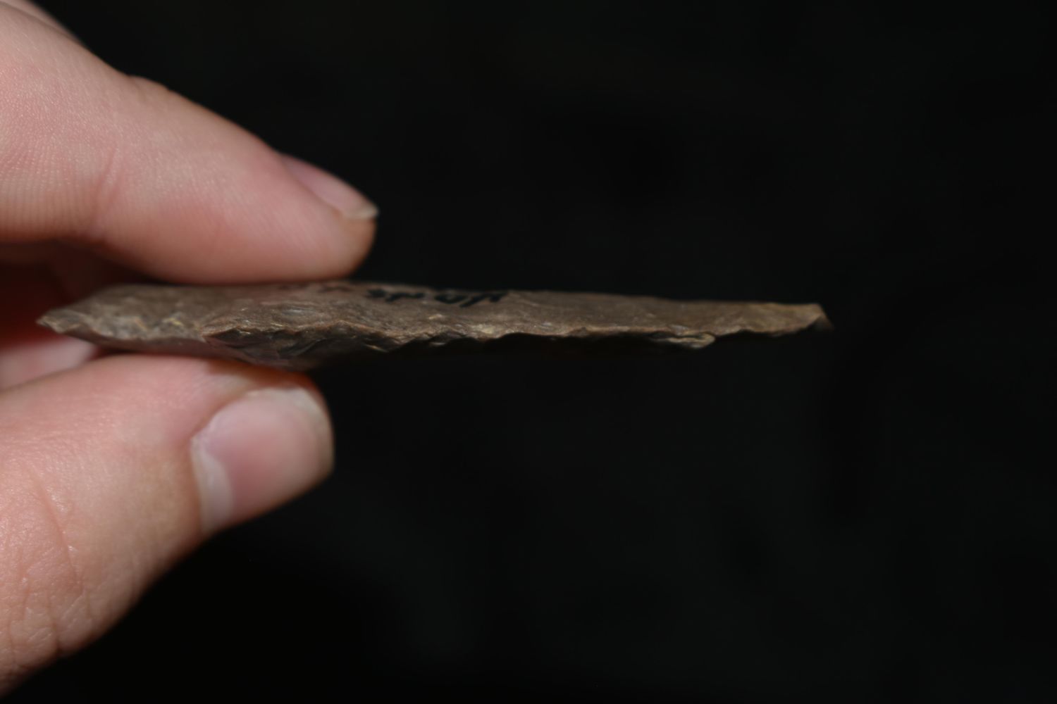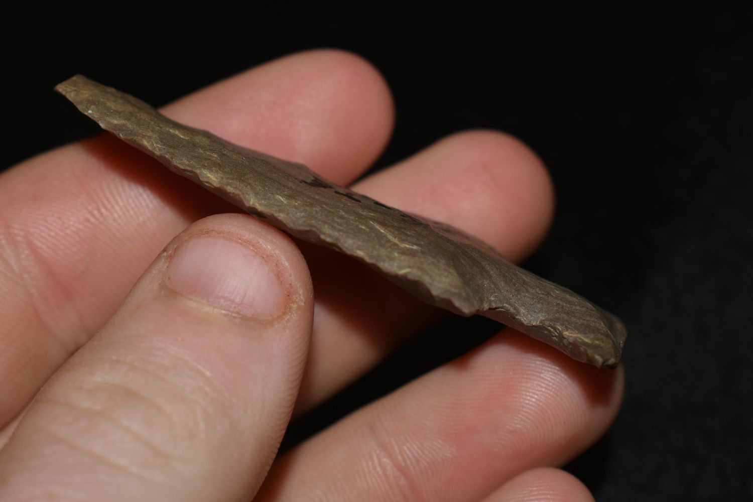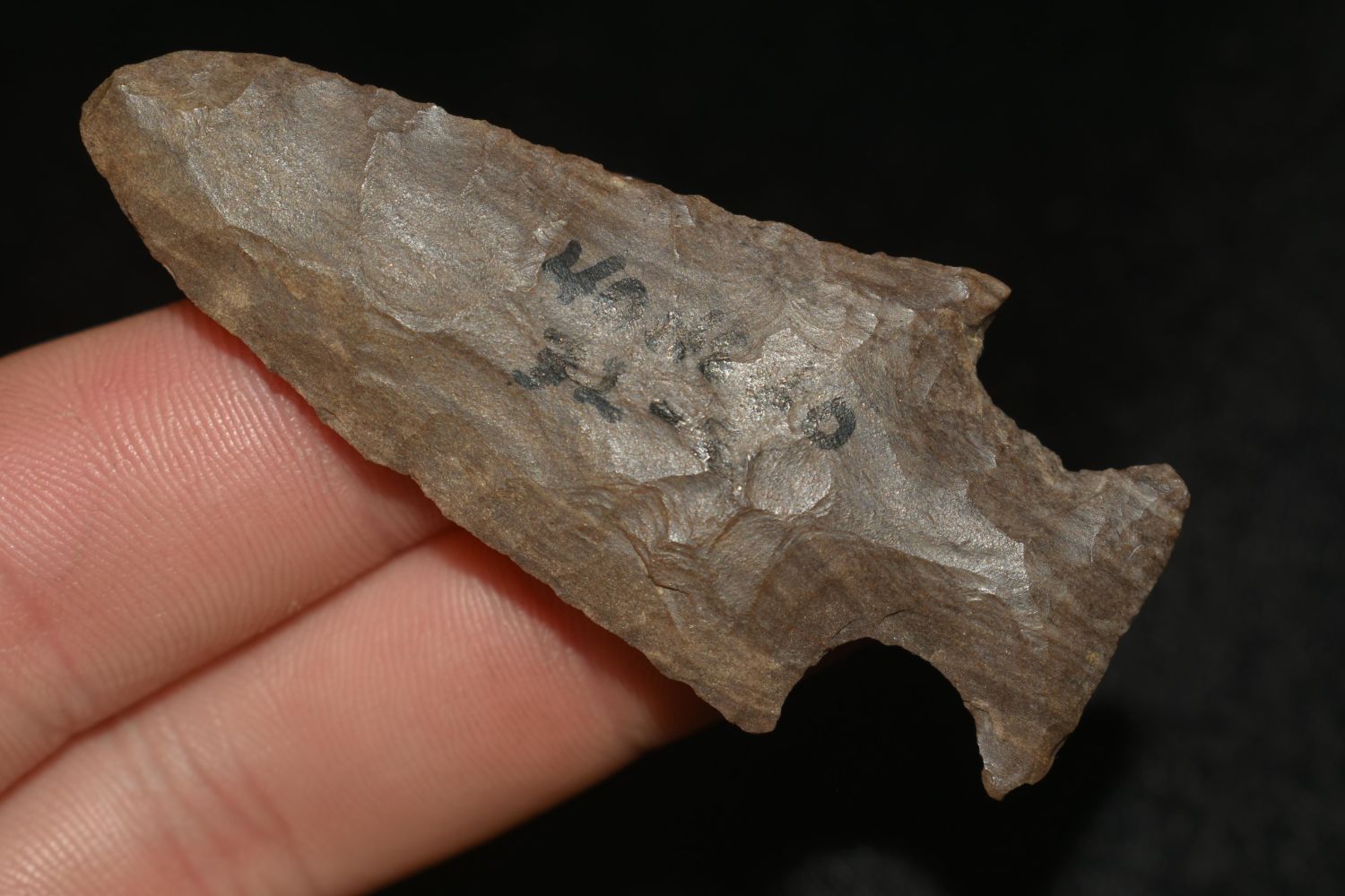 STRIPED FLINT 2 1/2" LONG MOTLEY, VERY THIN, FOUND IN THE BENTON / HUMPHREYS COUNTY TENNESSEE AREA BY E.J. SIMS, INDIAN ARROWHEAD, ARTIFACT