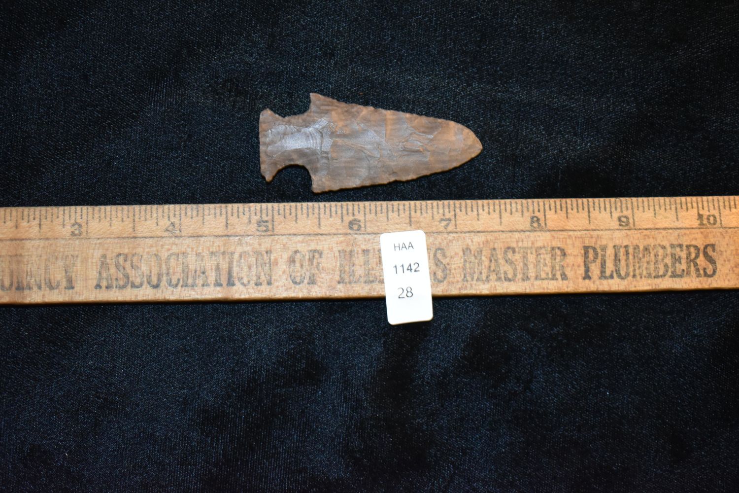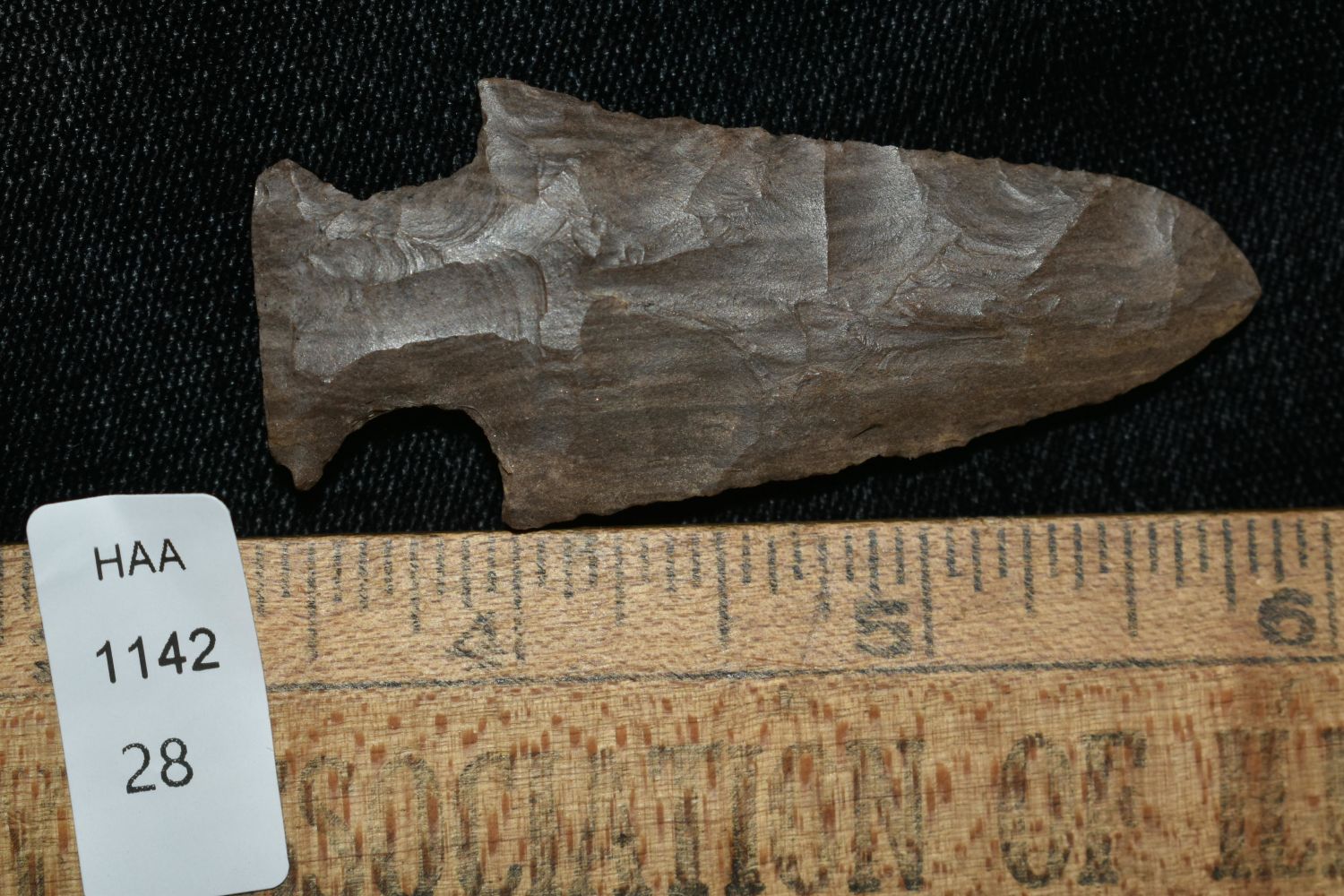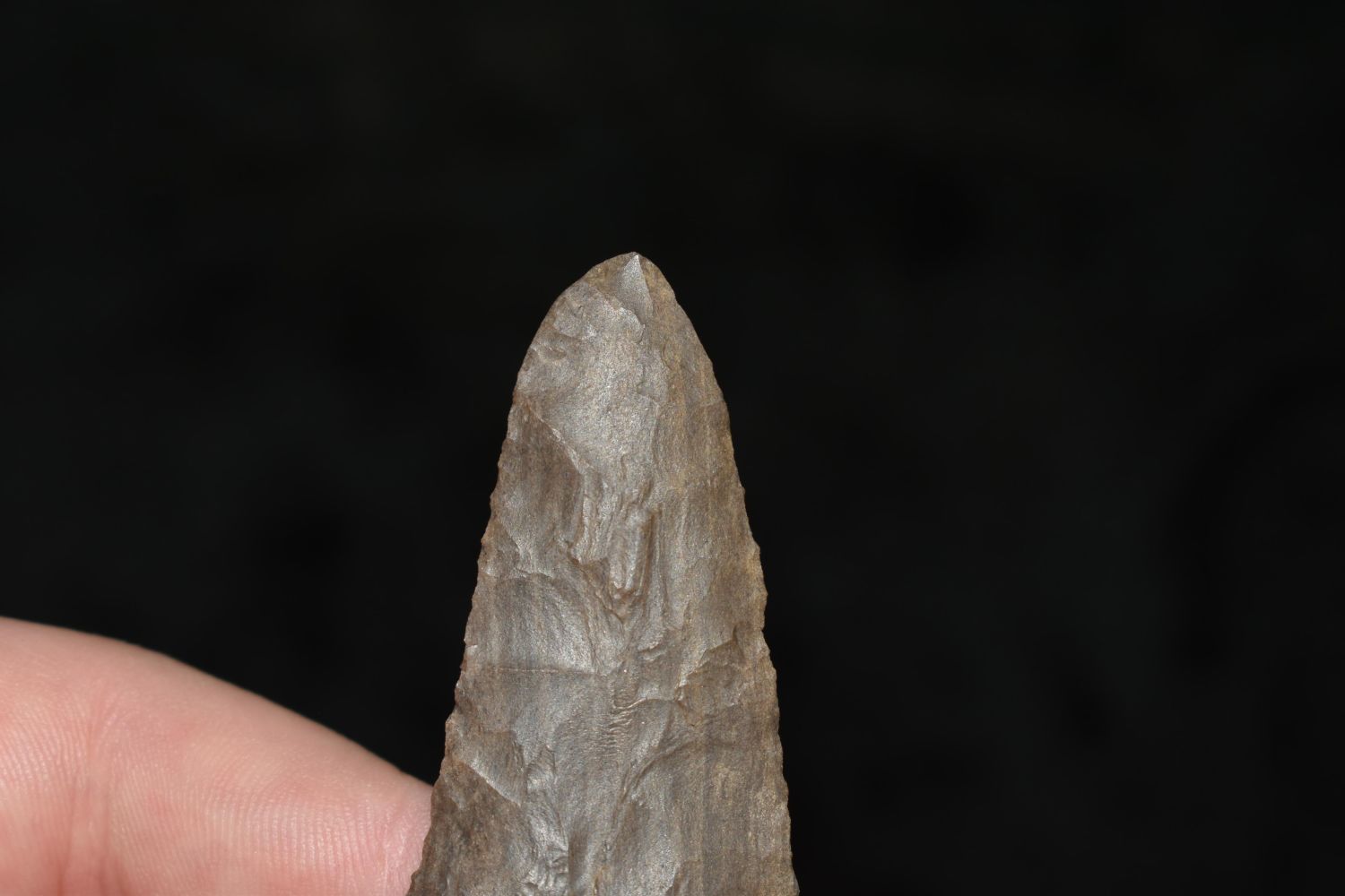 STRIPED FLINT 2 1/2" LONG MOTLEY, VERY THIN, FOUND IN THE BENTON / HUMPHREYS COUNTY TENNESSEE AREA BY E.J. SIMS, INDIAN ARROWHEAD, ARTIFACT