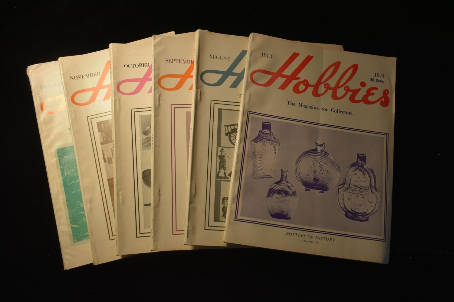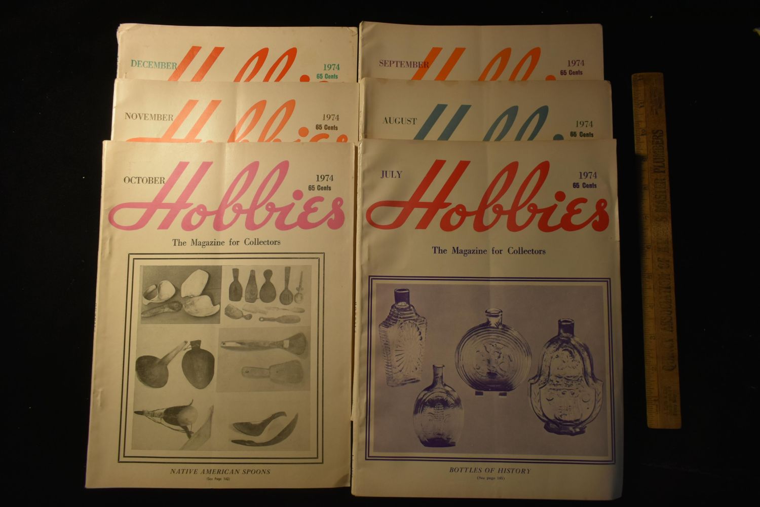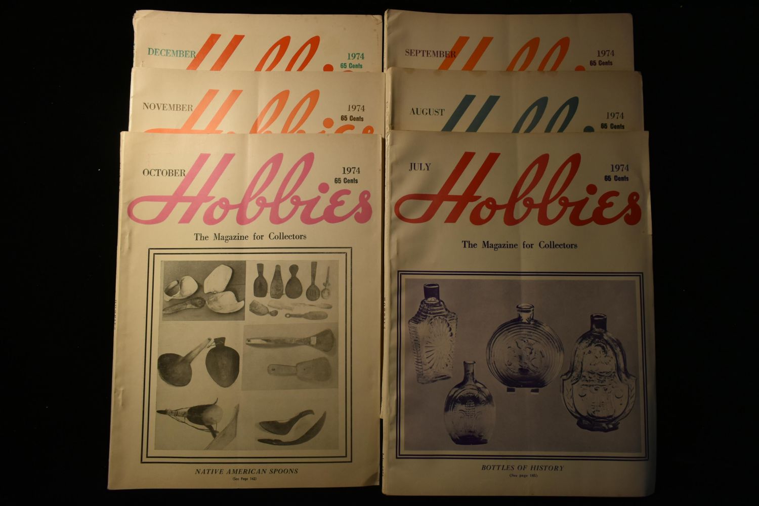 LOT OF 6 HOBBIES MAGAZINES FROM 1974, EACH ONE 130 PAGES, AND EACH ONE HAS A SECTION ON INDIAN ARTIFACTS
