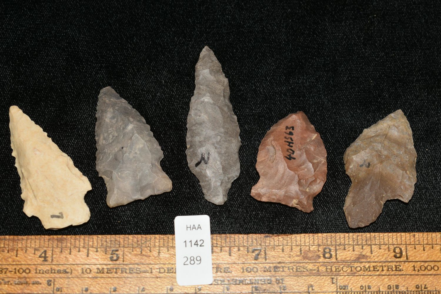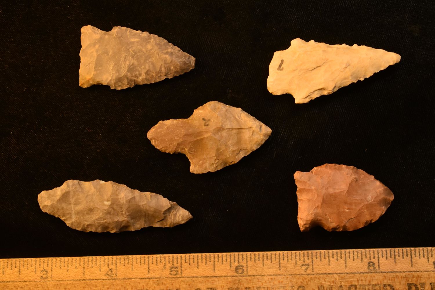 LOT OF 5 MOSTLY ARCHAIC POINTS FOUND IN THE BENTON / HUMPHREYS COUNTY TENNESSEE AREA BY E.J. SIMS, INDIAN ARROWHEAD, ARTIFACT
