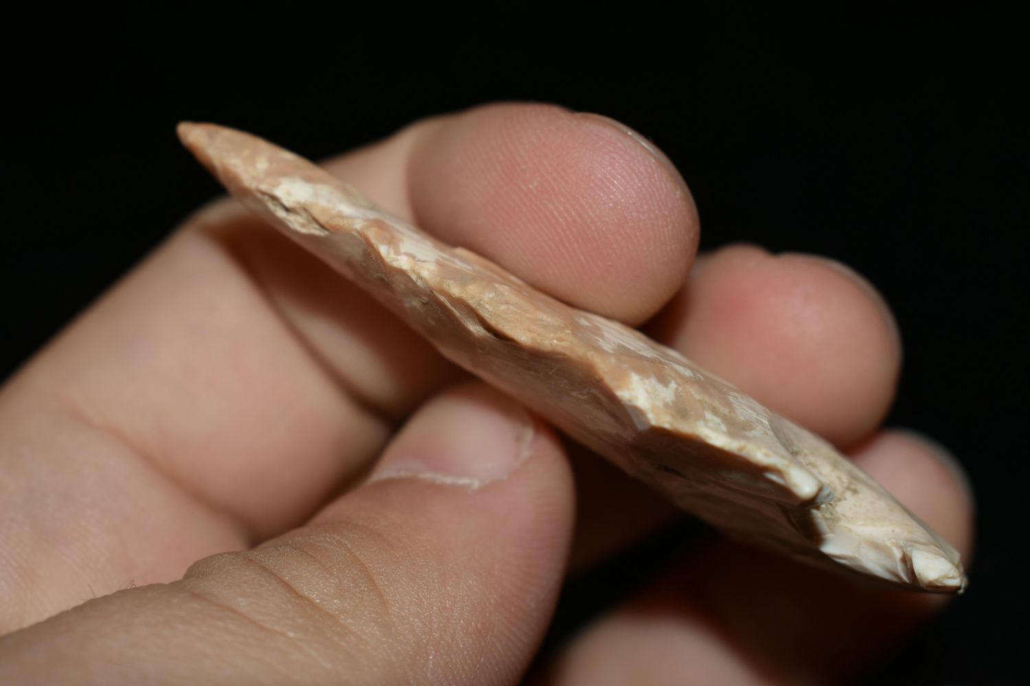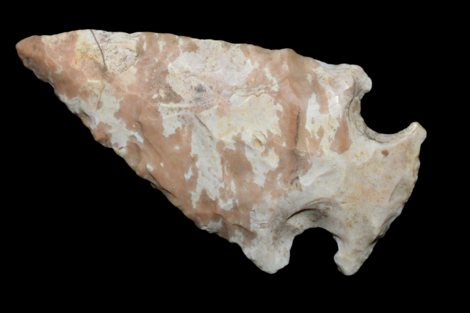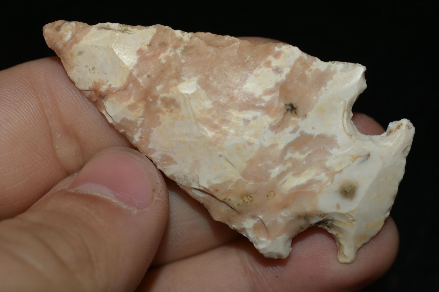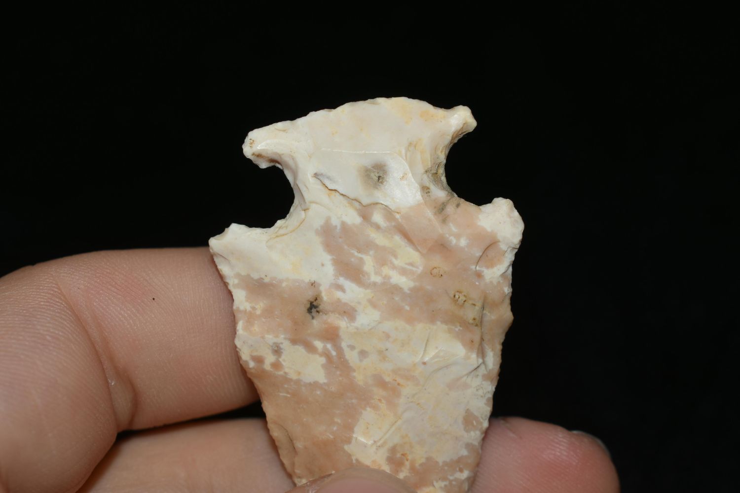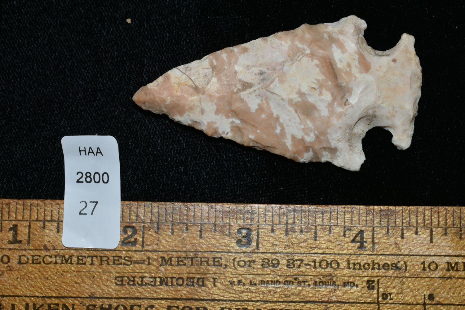 2 5/8" Colorful Gibson, Classic Form, Found by Delbert Roush. Delbert Hunted Artifacts Around Winchester & Bluffs, Illinois. Delbert Passed Away March of 1982. His Daughter Then Inherited His Collection Which is What We Are Now Selling In This Auction., Native American Artifacts