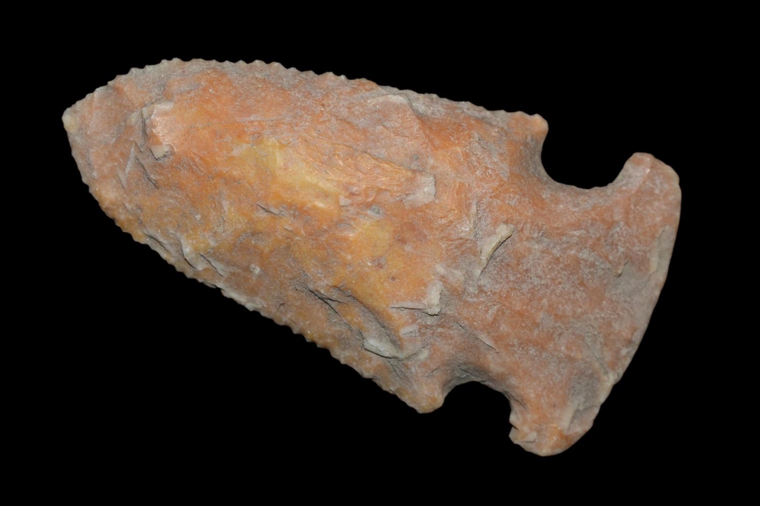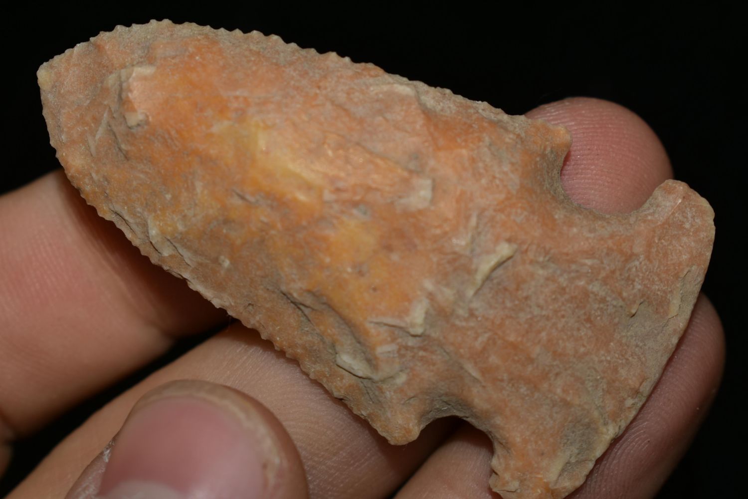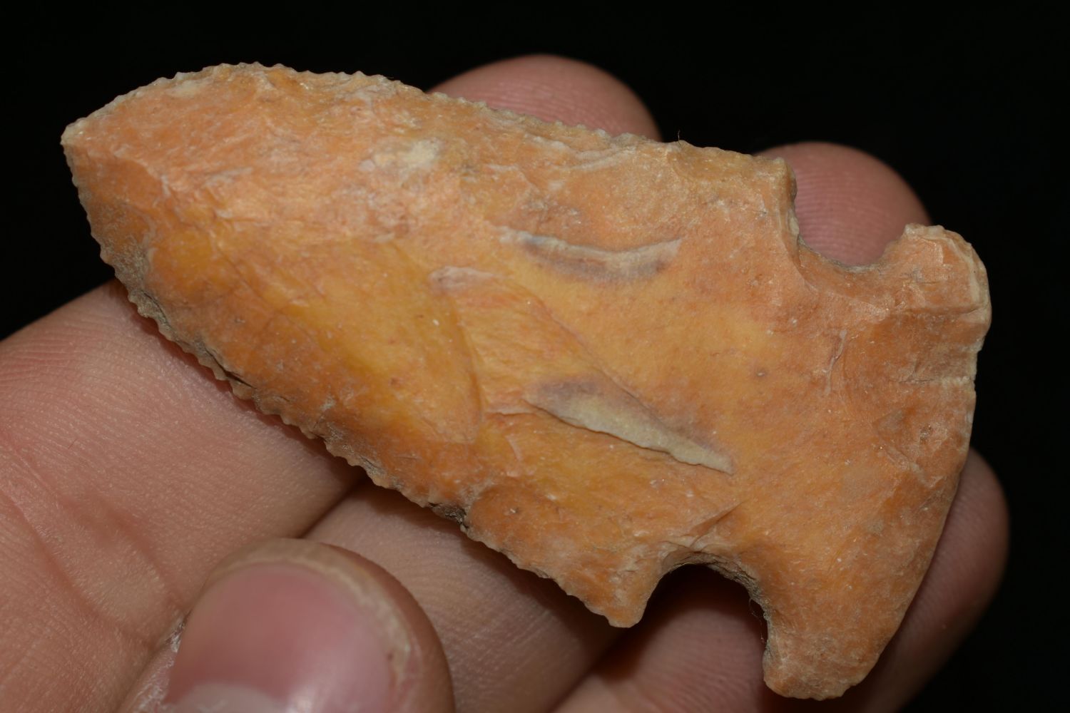 Outstanding 2 1/4" Creek Stained Gibson, Micro Serrated, Found by Delbert Roush. Delbert Hunted Artifacts Around Winchester & Bluffs, Illinois. Delbert Passed Away March of 1982. His Daughter Then Inherited His Collection Which is What We Are Now Selling In This Auction., Native American Artifacts