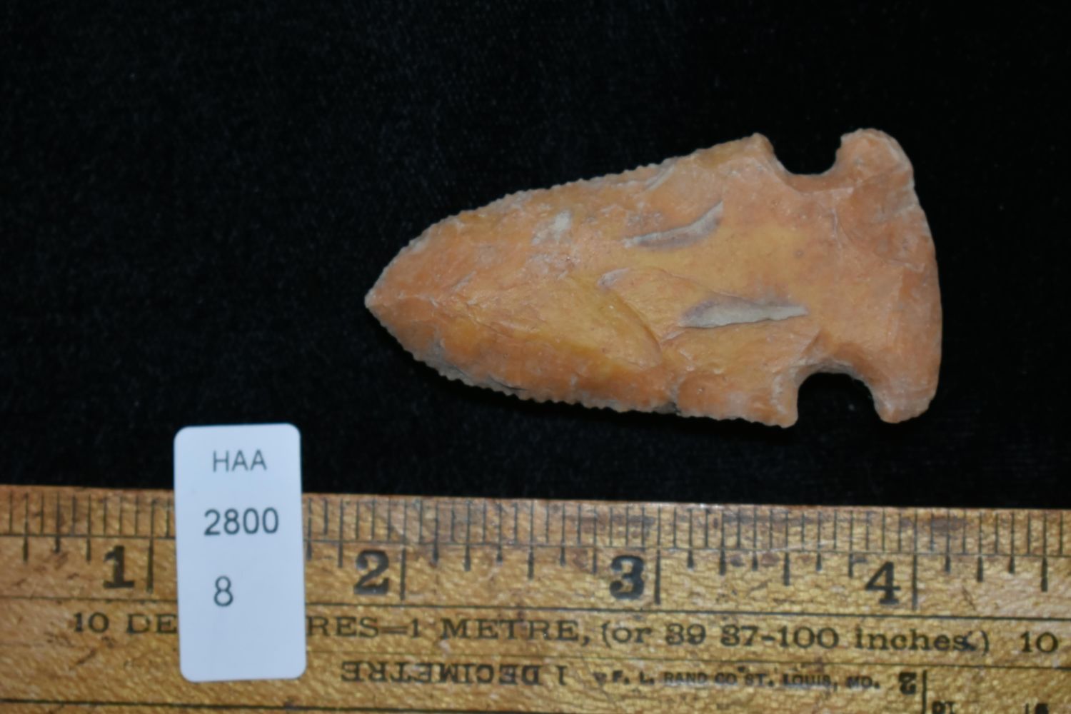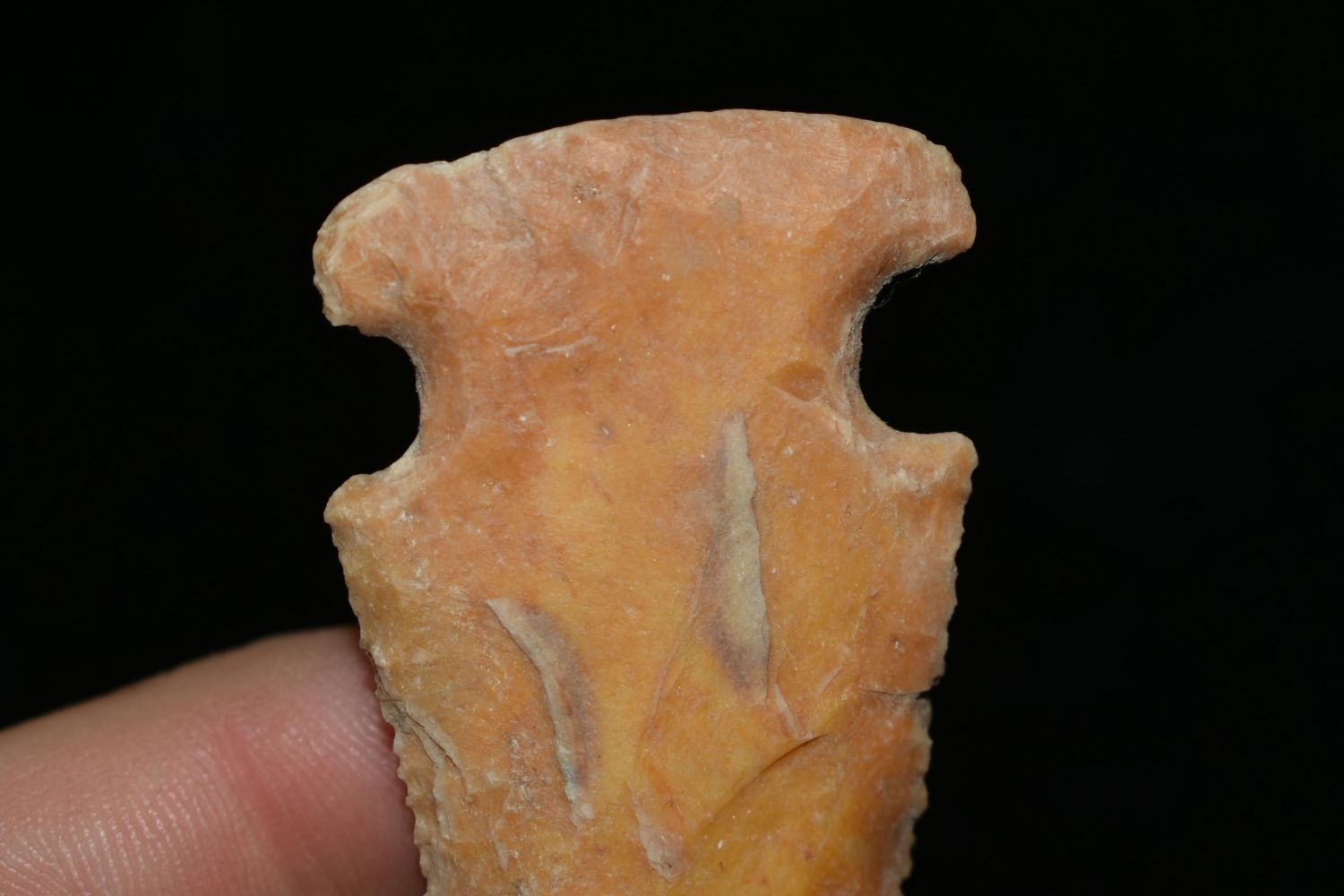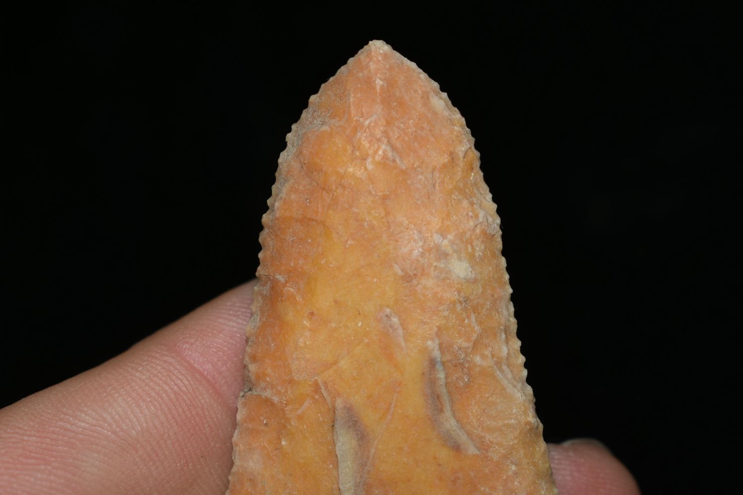Outstanding 2 1/4" Creek Stained Gibson, Micro Serrated, Found by Delbert Roush. Delbert Hunted Artifacts Around Winchester & Bluffs, Illinois. Delbert Passed Away March of 1982. His Daughter Then Inherited His Collection Which is What We Are Now Selling In This Auction., Native American Artifacts