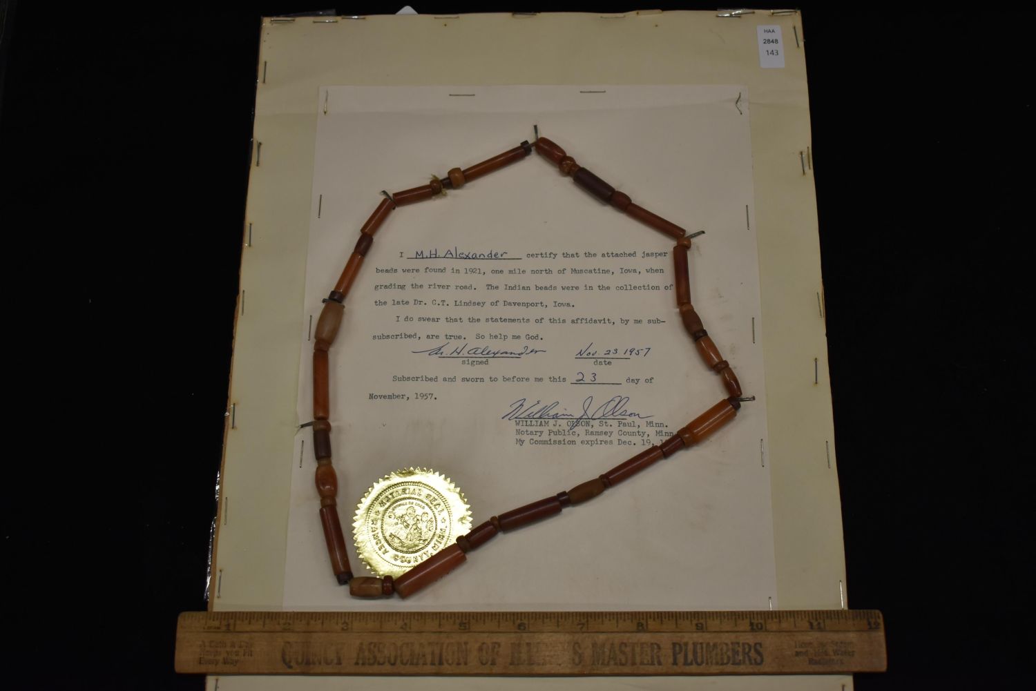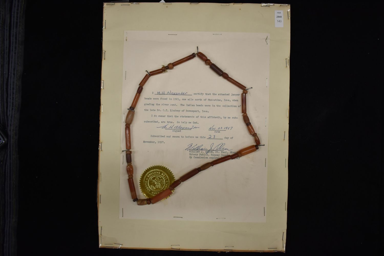 Strand of Jasper Beads Found in 1921 One Mile North of Muscatine, Iowa while grading the River Road, collected by Dr. CT Lindsey of Davenport IA