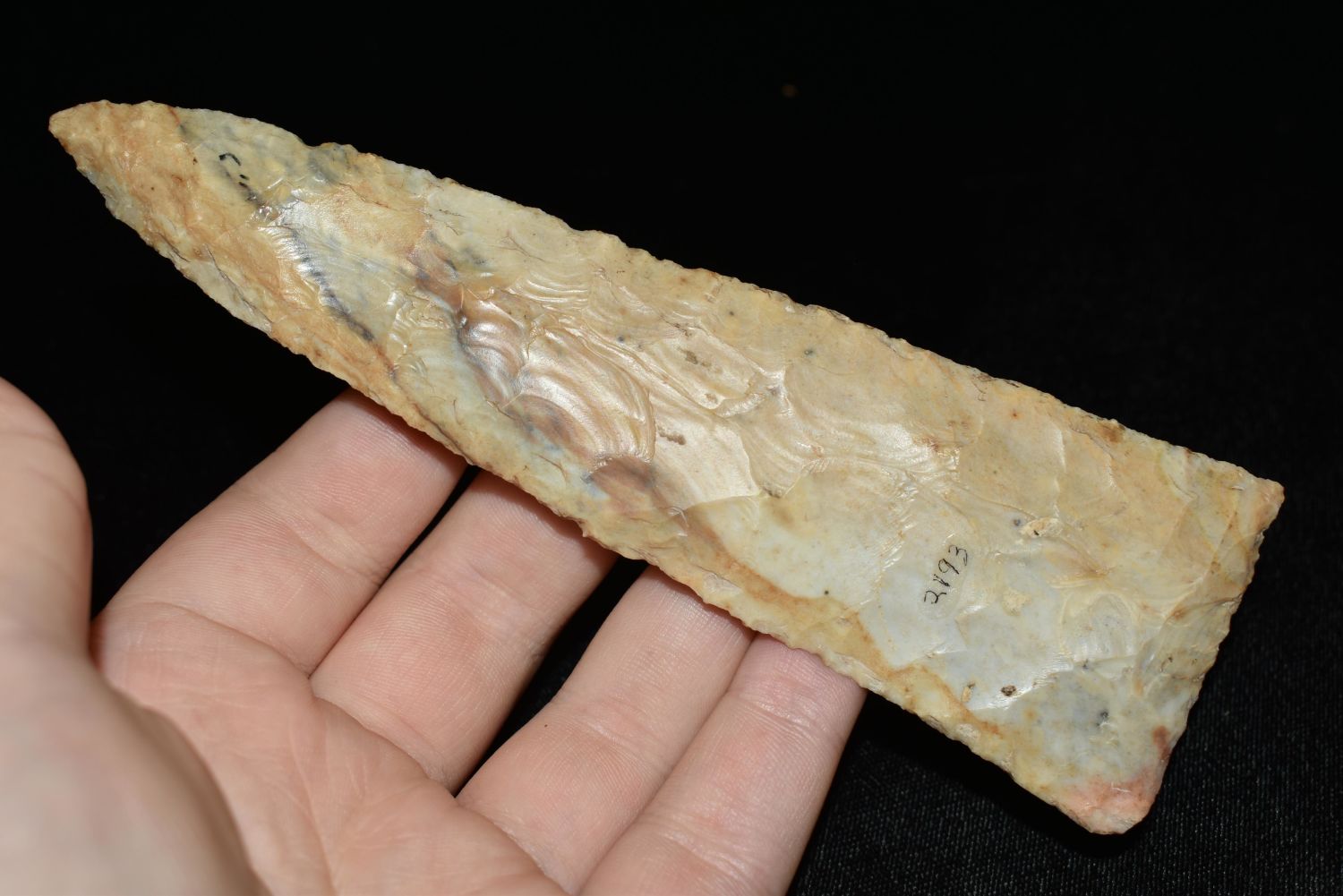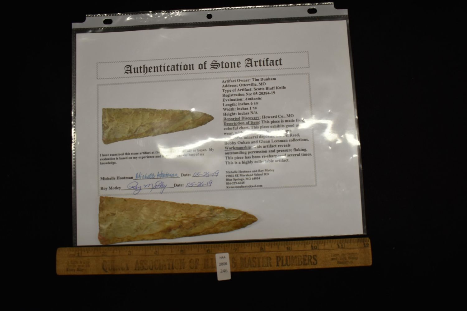 6 1/8" Scottsbluff Knife, Motley COA, Found in Howard Co. MO, Ex Dr. Reed, Bobby Onken, Glenn Leesman, Native American Artifacts