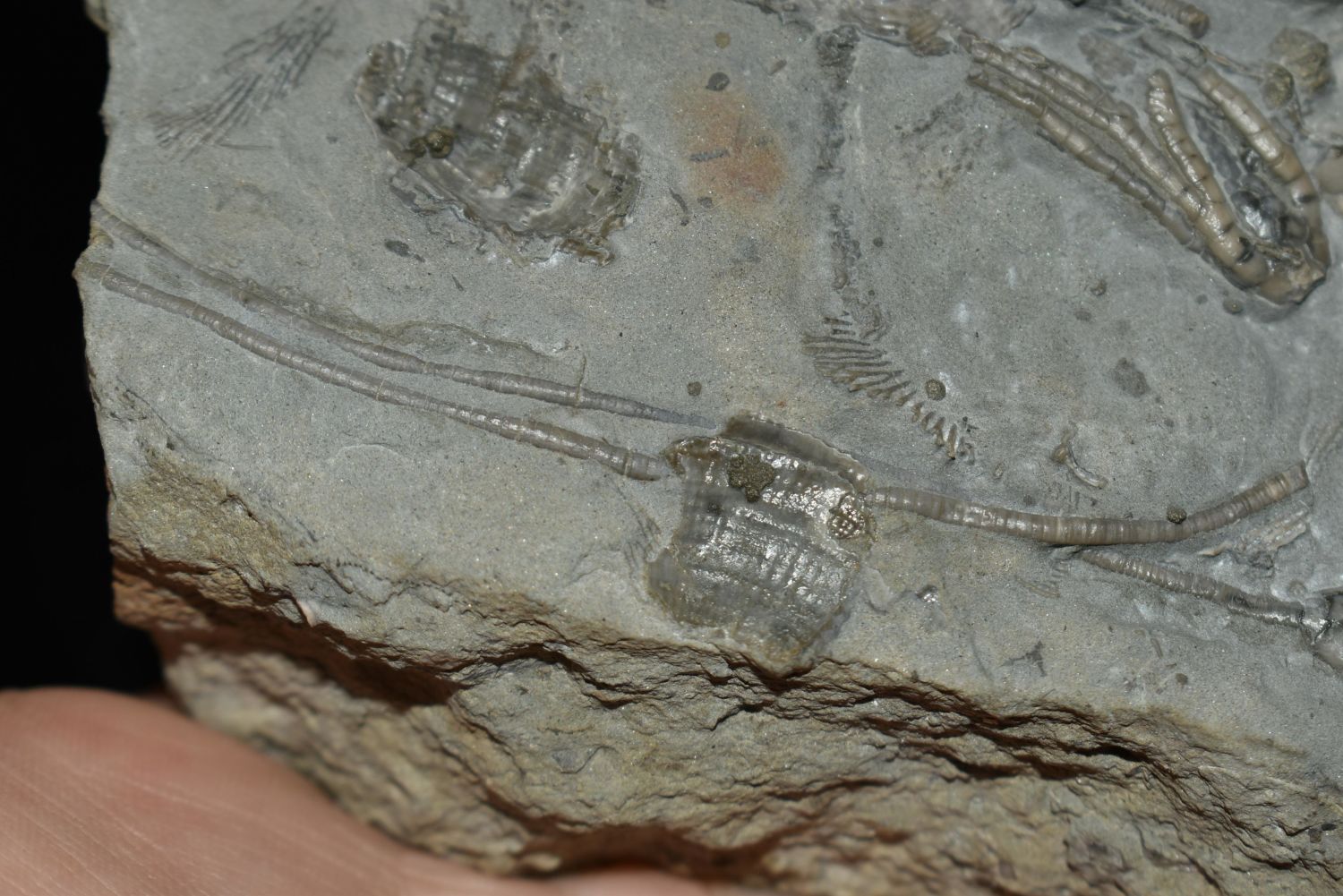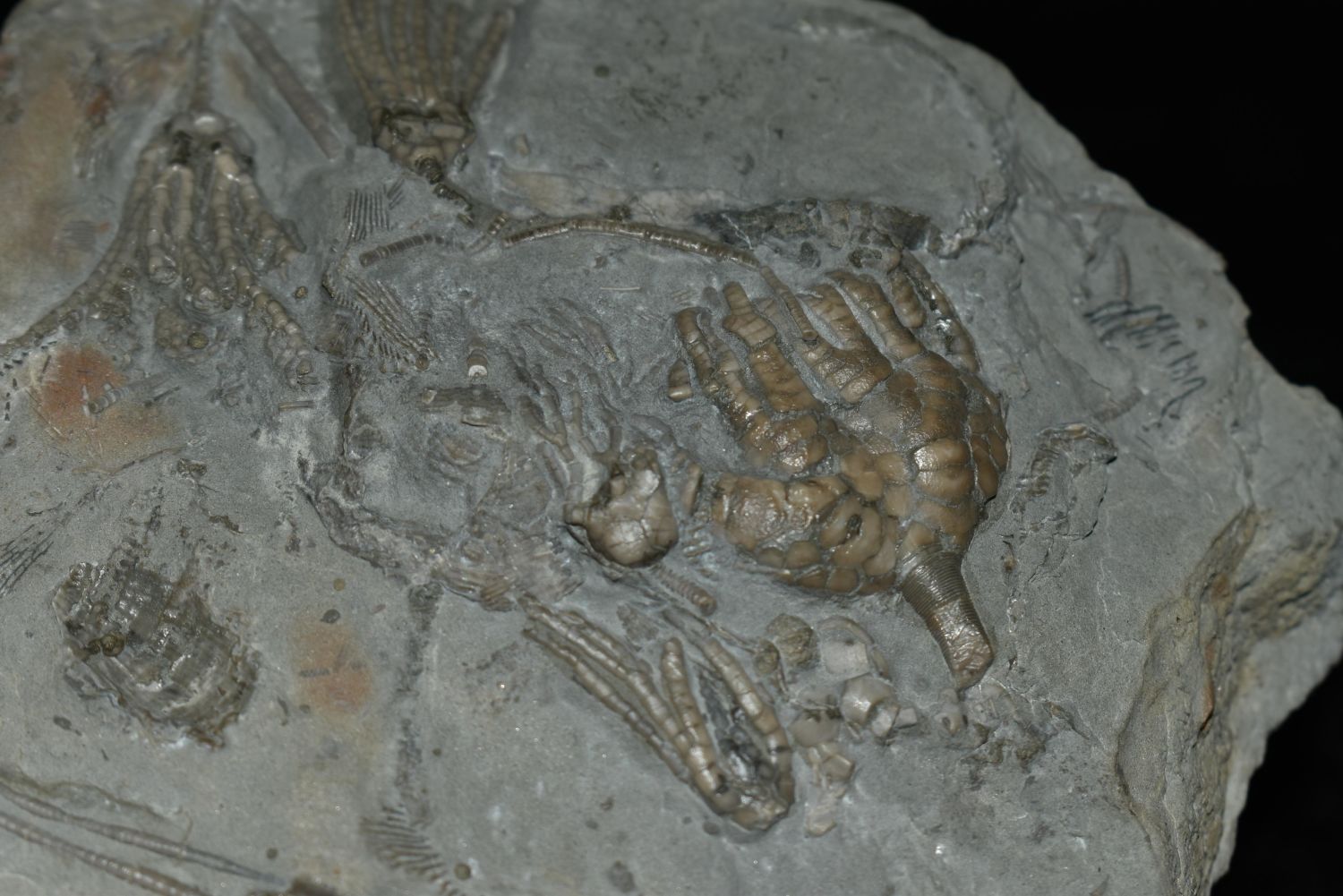 Multiple species crinoid plate. Crawfordsville, IN Nicely prepared by Michael Davis of Nature’s Spectrum. 5" x 4 3/4". Nice, solid specimen