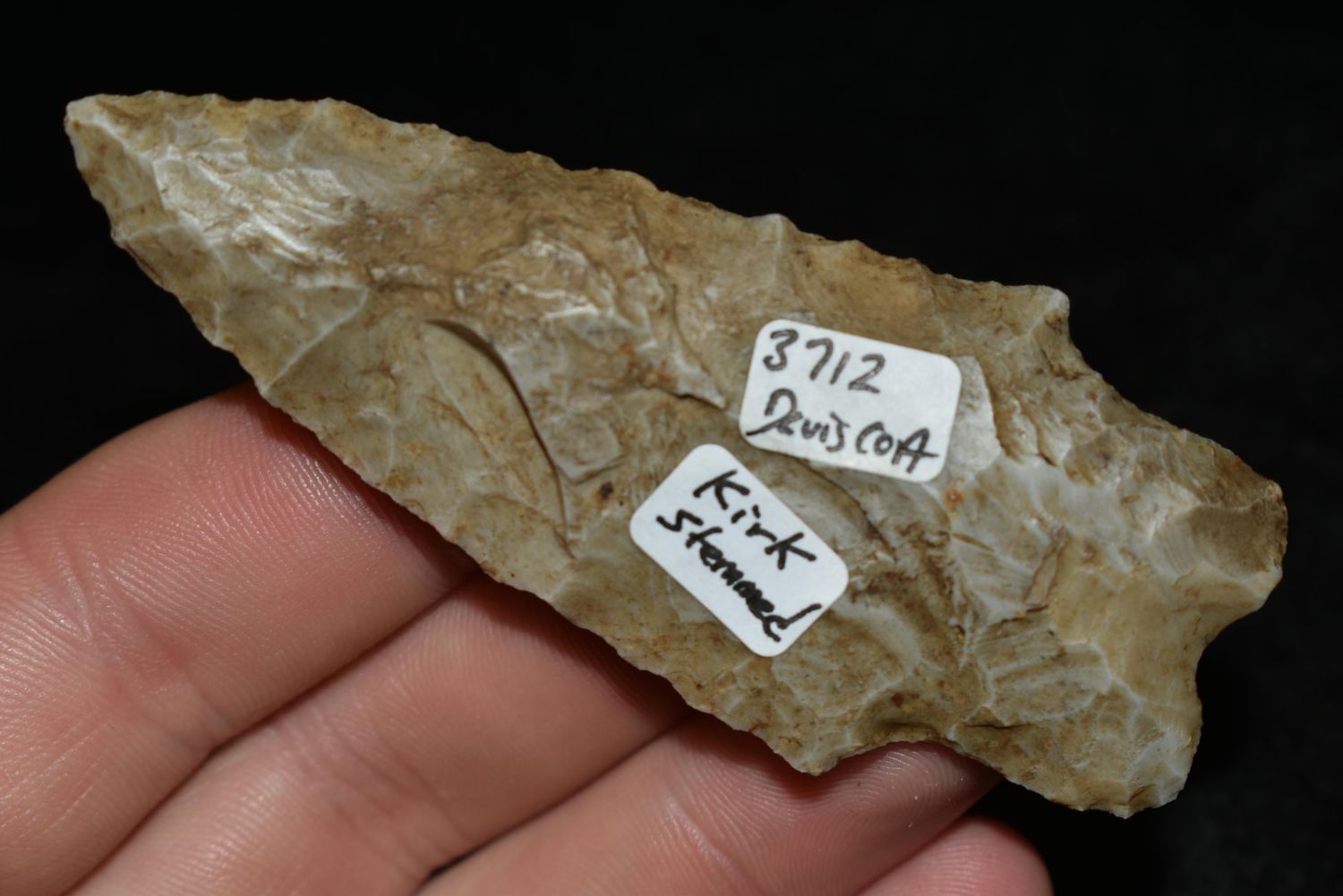 3 1/8" Kirk-Stemmed, Davis COA, found in Kentucky made of Boyle Chert, Authentic Native American Arrowhead