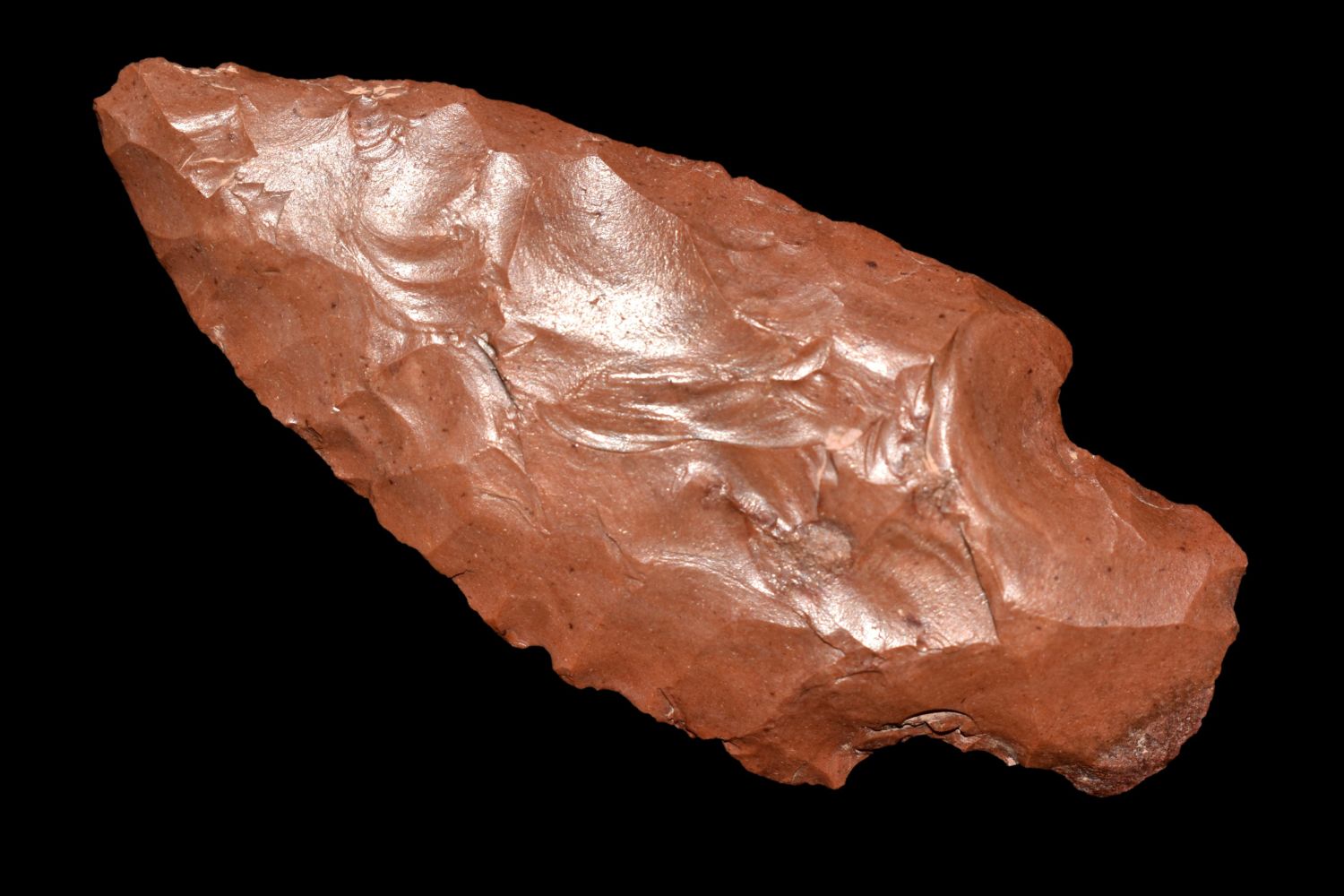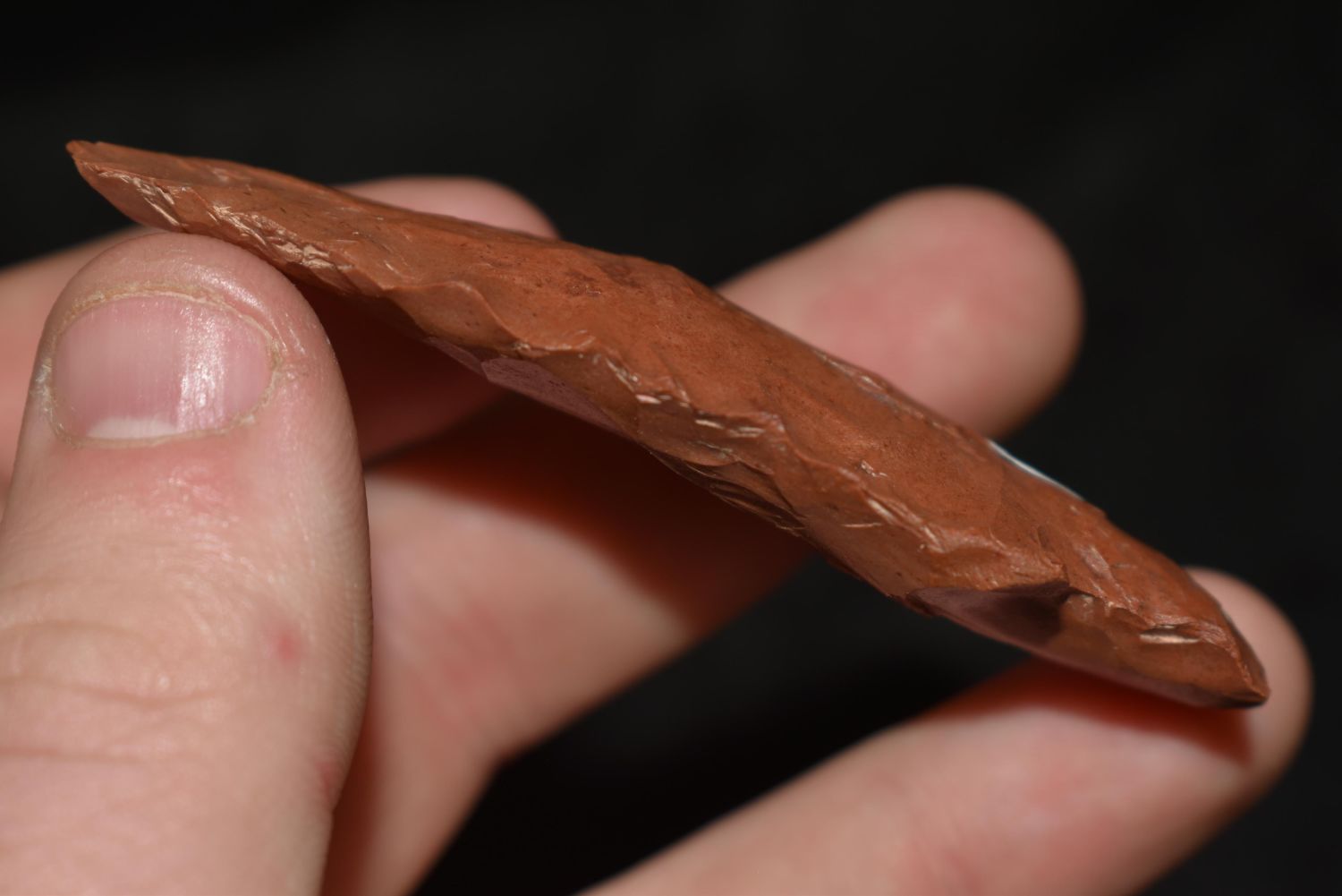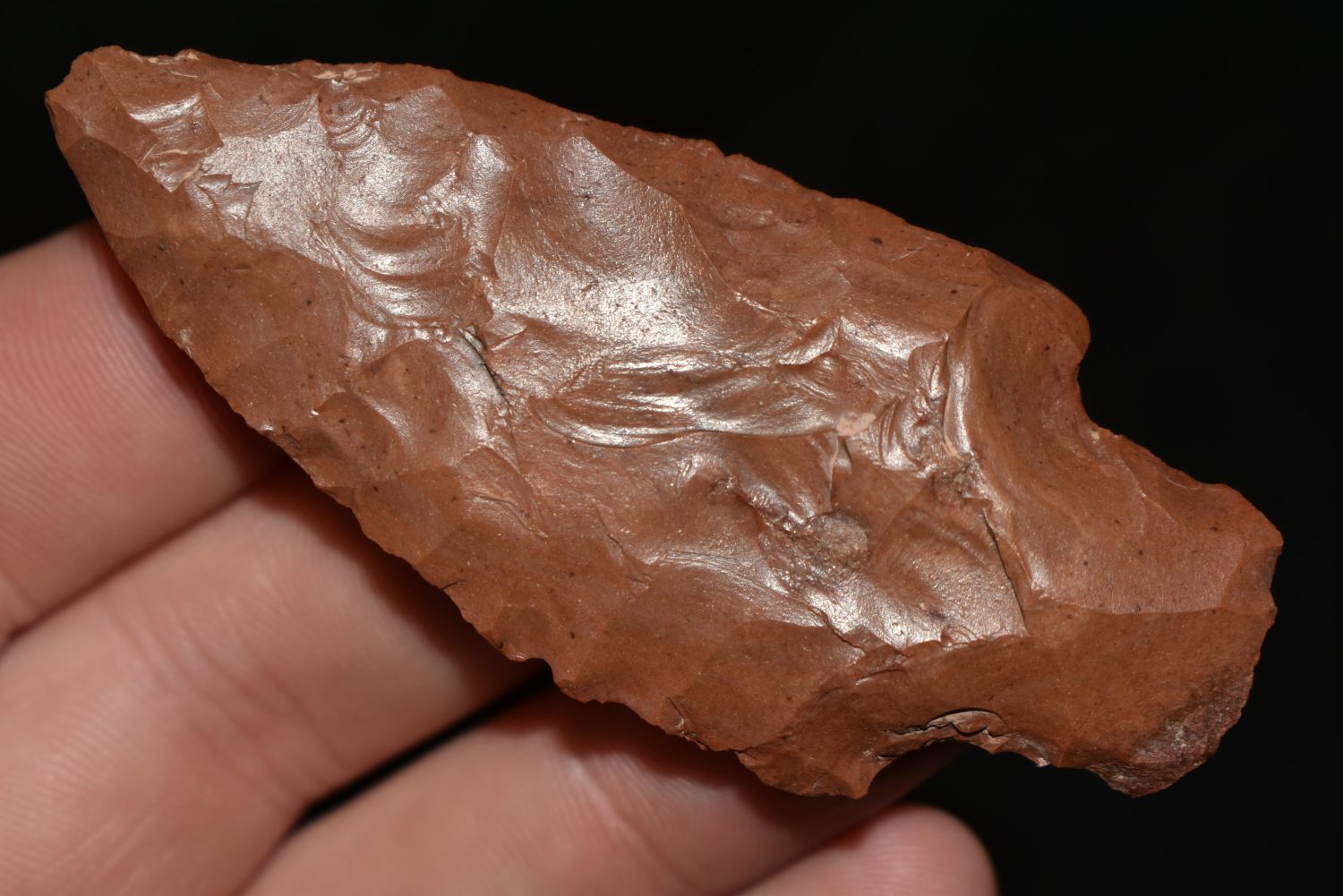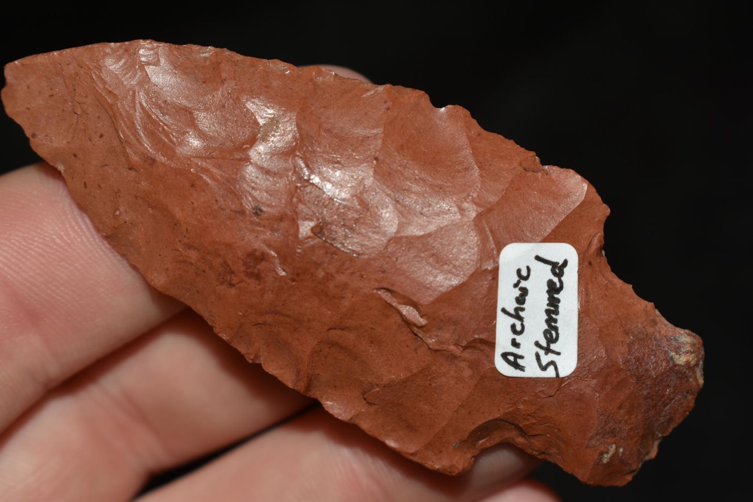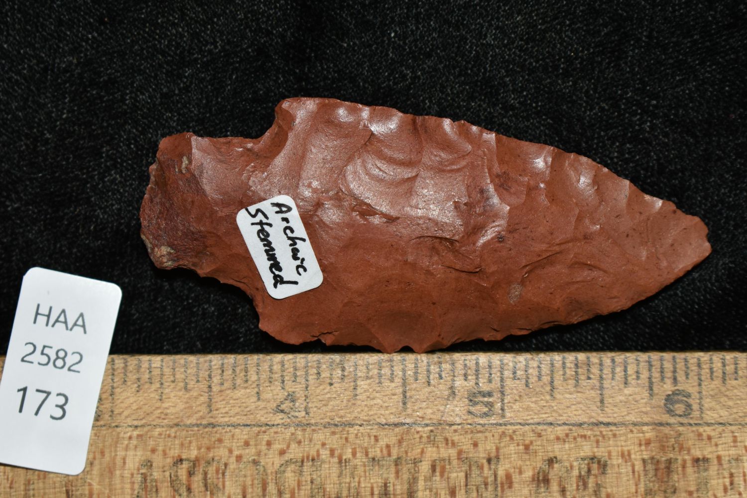 3" Archaic Stemmed Point, Davis COA, made of Jasper, Authentic Native American Arrowhead