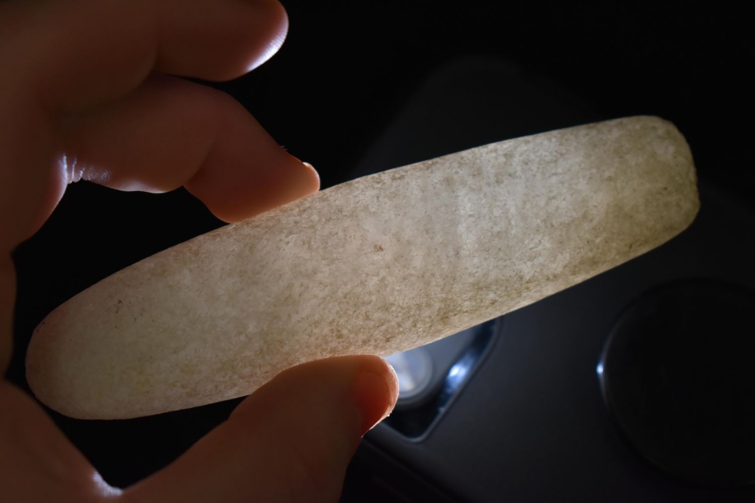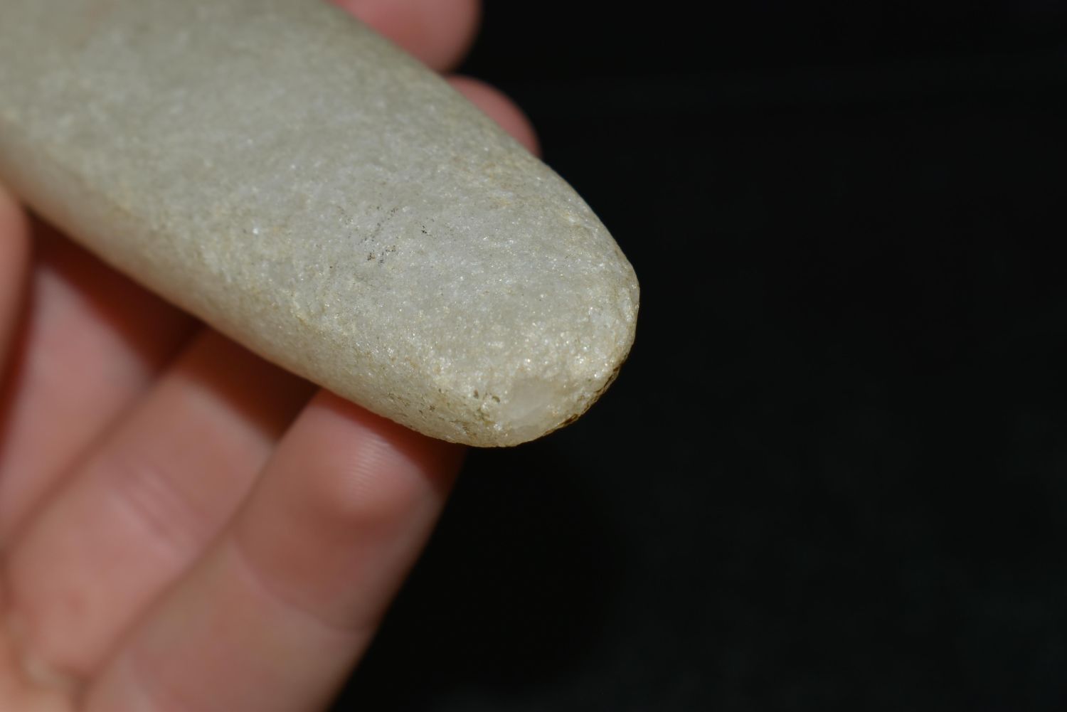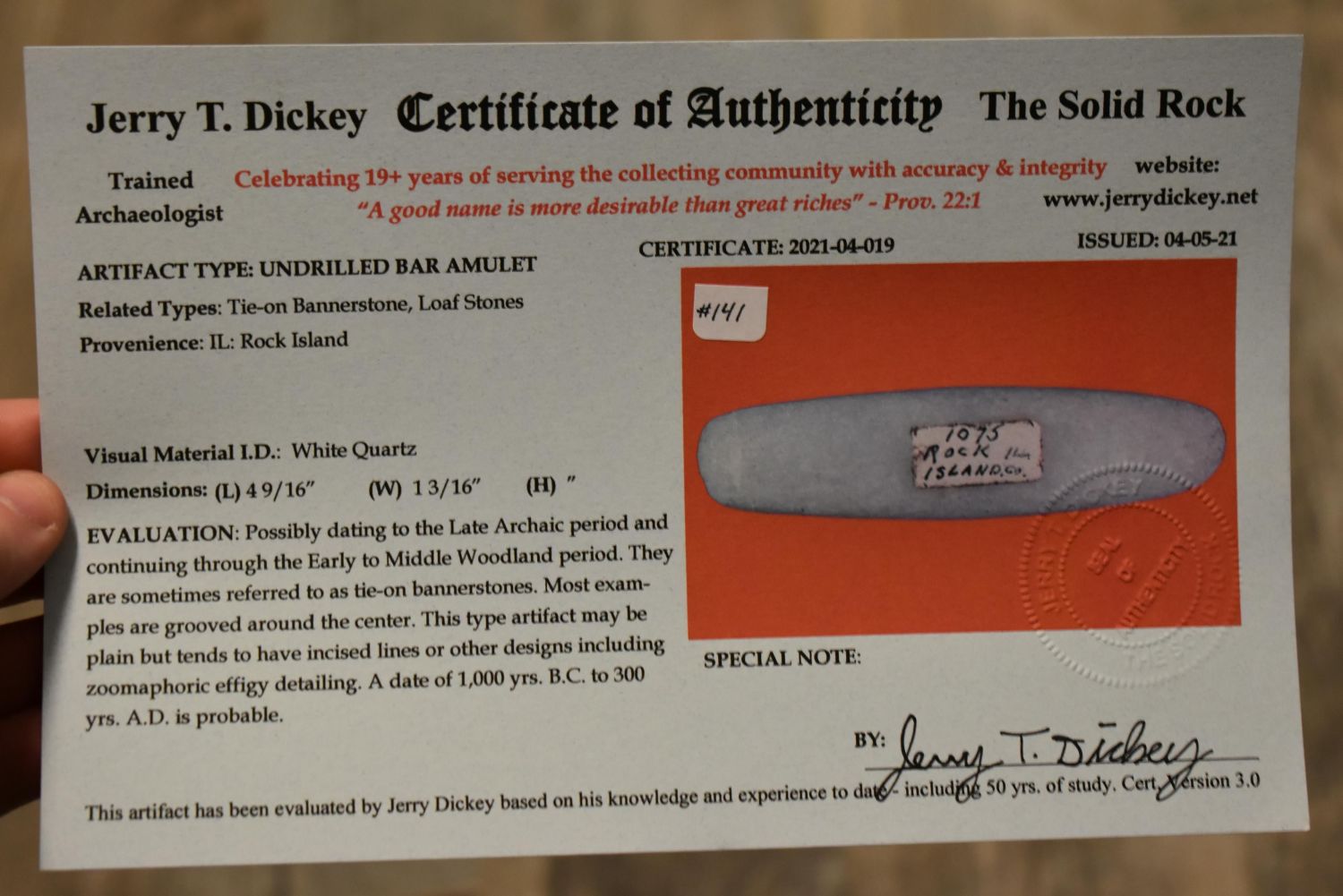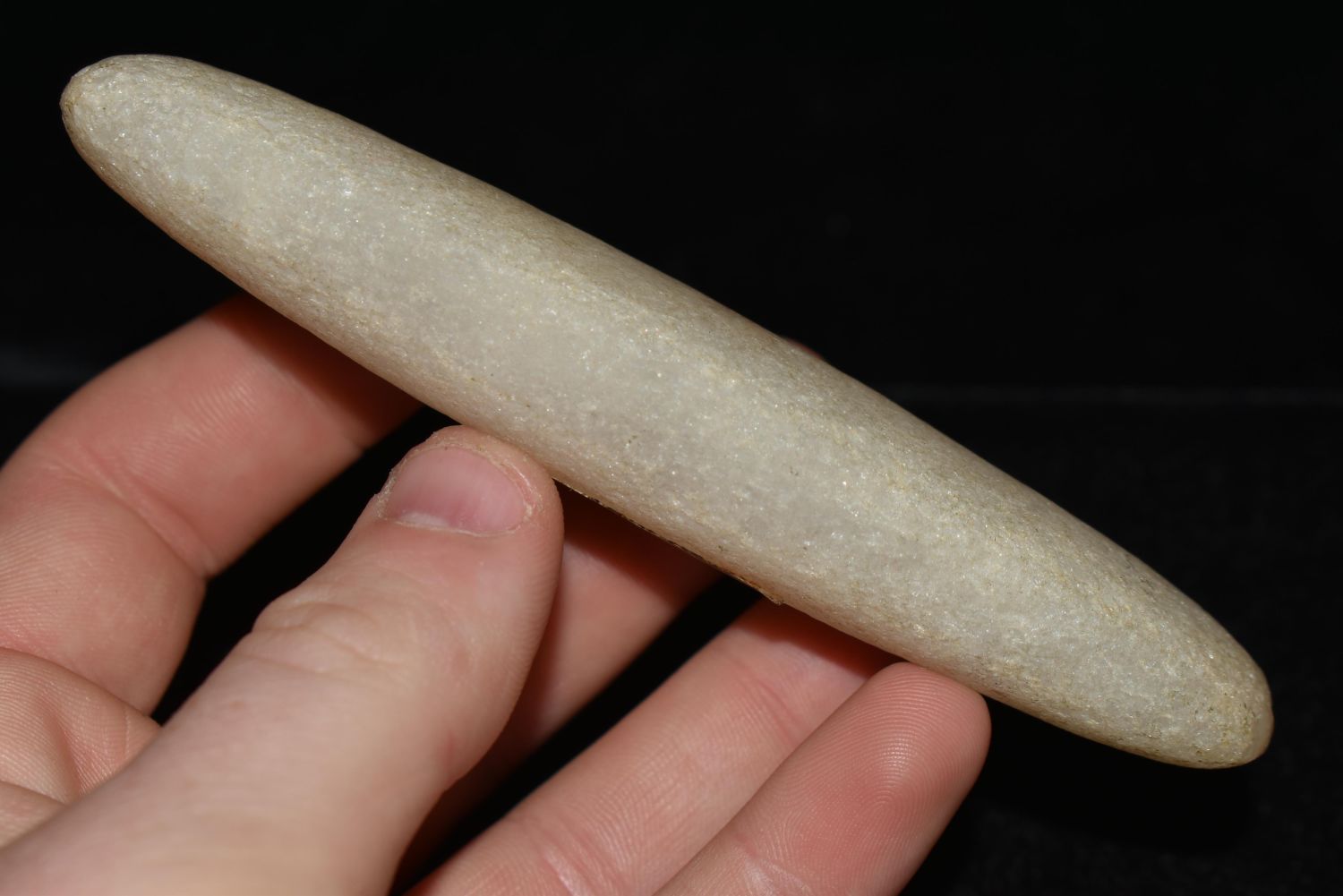 RARE QUARTZ BAR WEIGHT, DICKEY COA, FOUND IN ROCK ISLAND COUNTY ILLINOIS, 4 9/16" LONG, VERY WELL SHAPED AND NICELY POLISHED