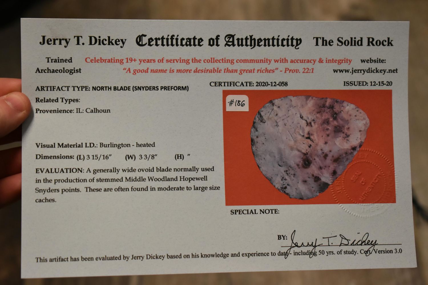 COLORFUL 3 15/16" HOPEWELL NORTH BLADE, DICKEY COA, FOUND IN CALHOUN COUNTY ILLINOIS, GREAT CLASSIC EXAMPLE WITH GREAT COLOR