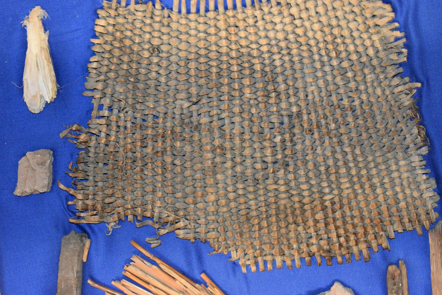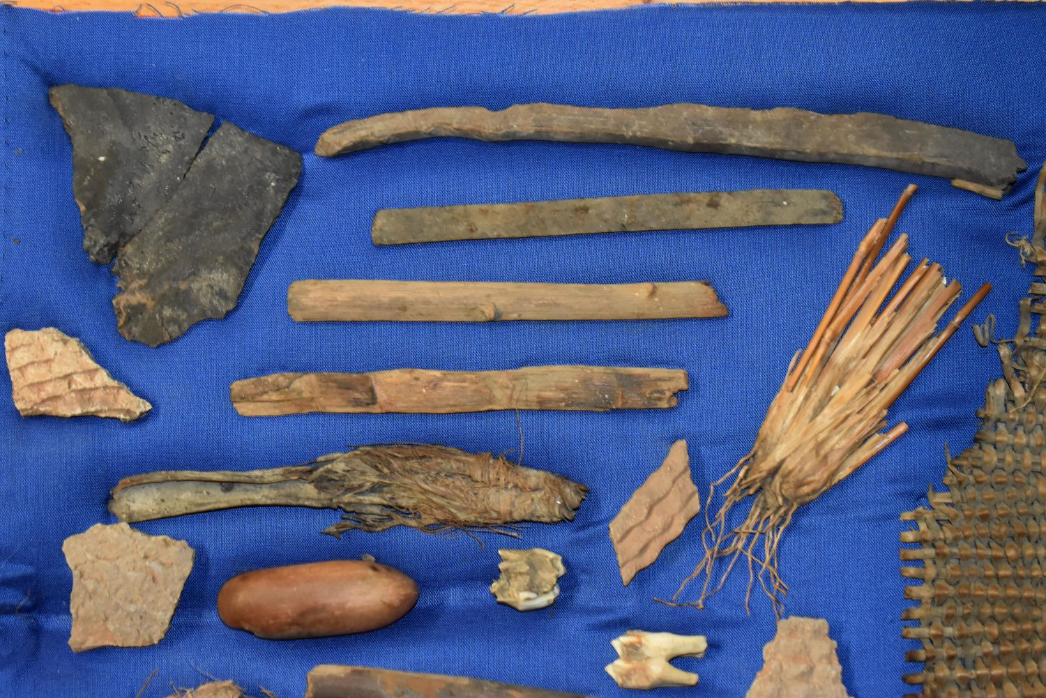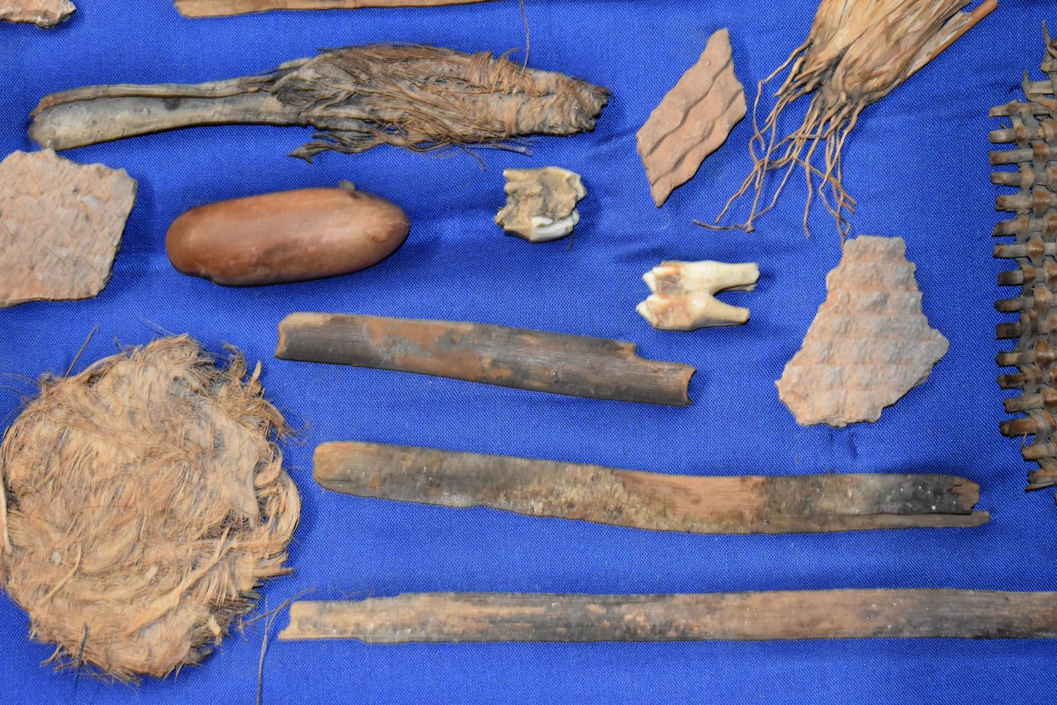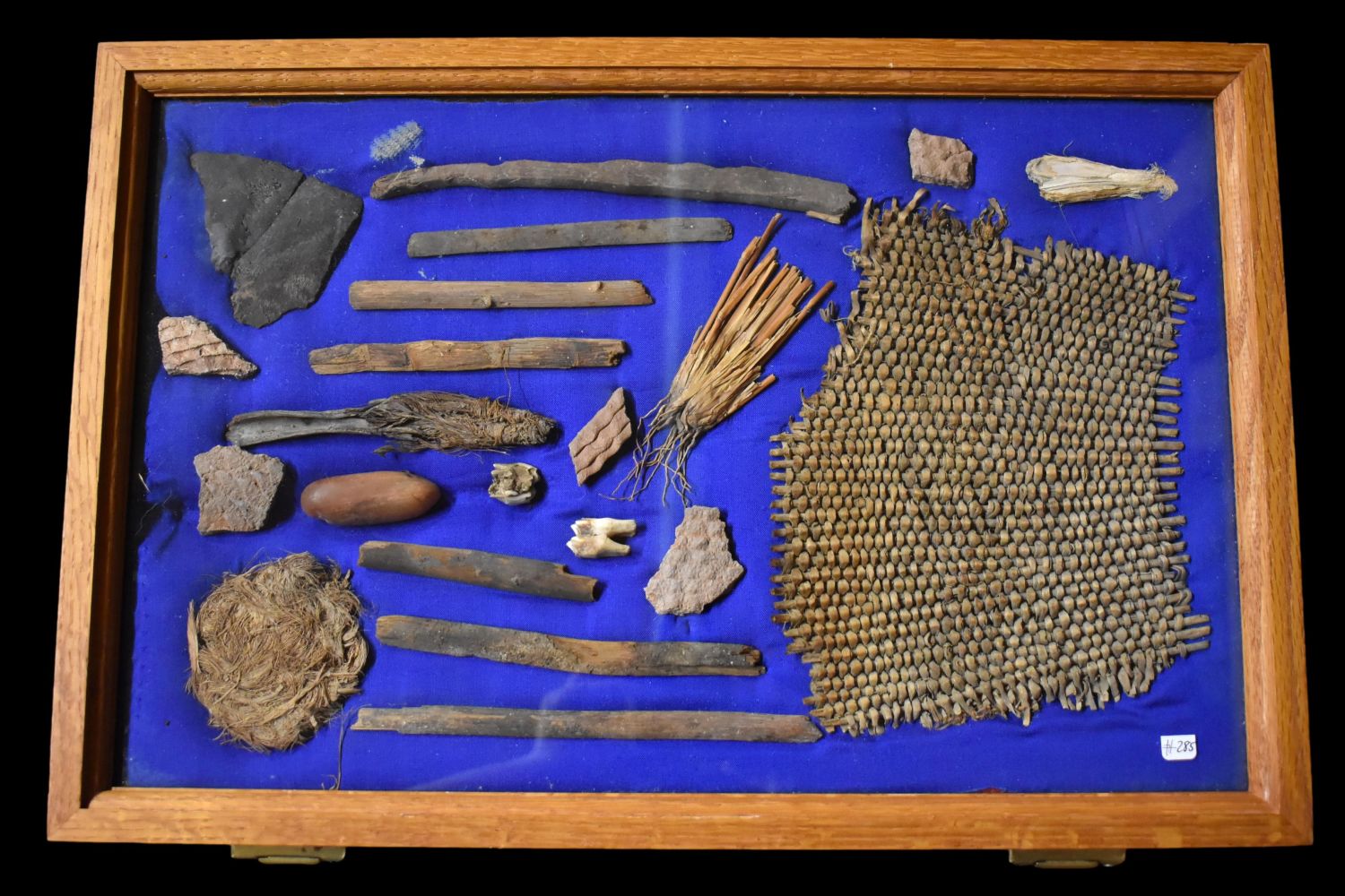 12" X 18" FRAME OF HOHOKAM & ANASAZI PERISHABLE ARTIFACTS FROM THE 4 CORNERS REGION, AUTHENTIC NATIVE AMERICAN ARROWHEAD
