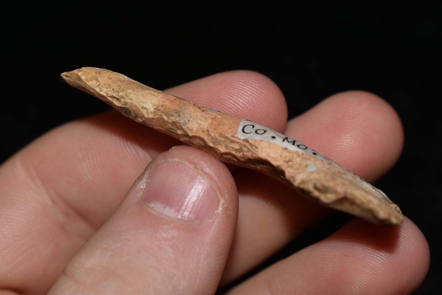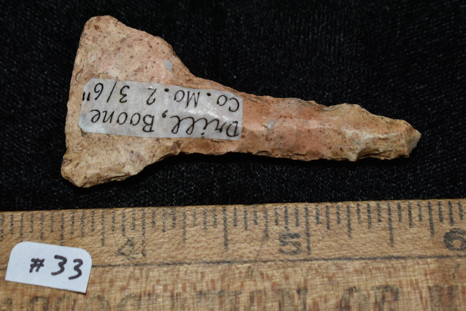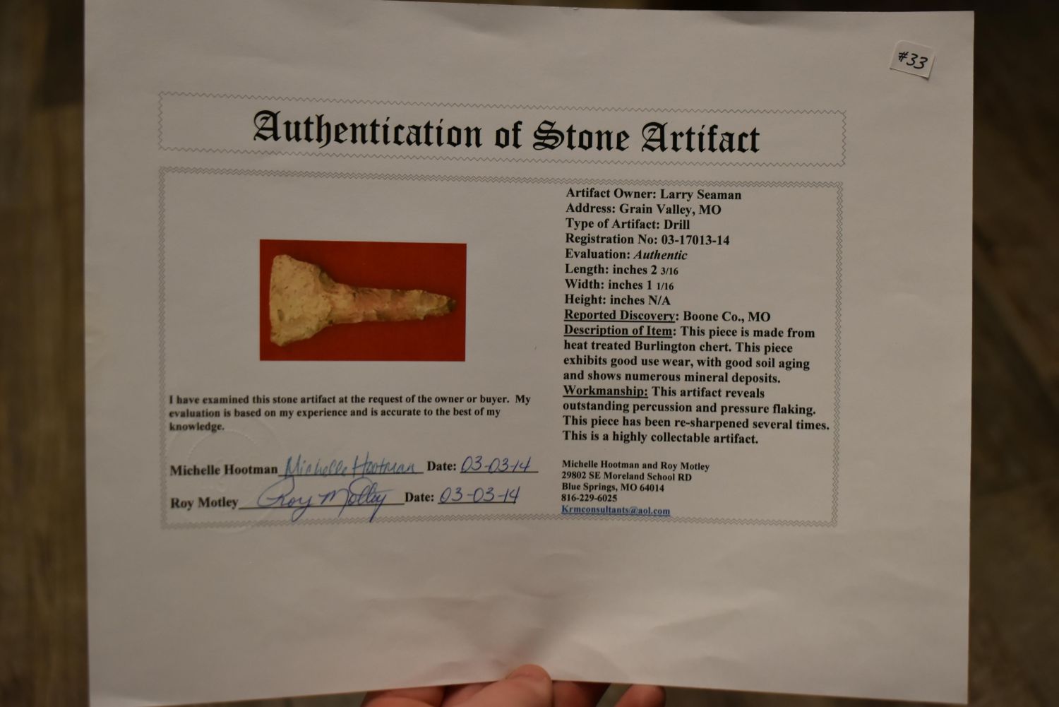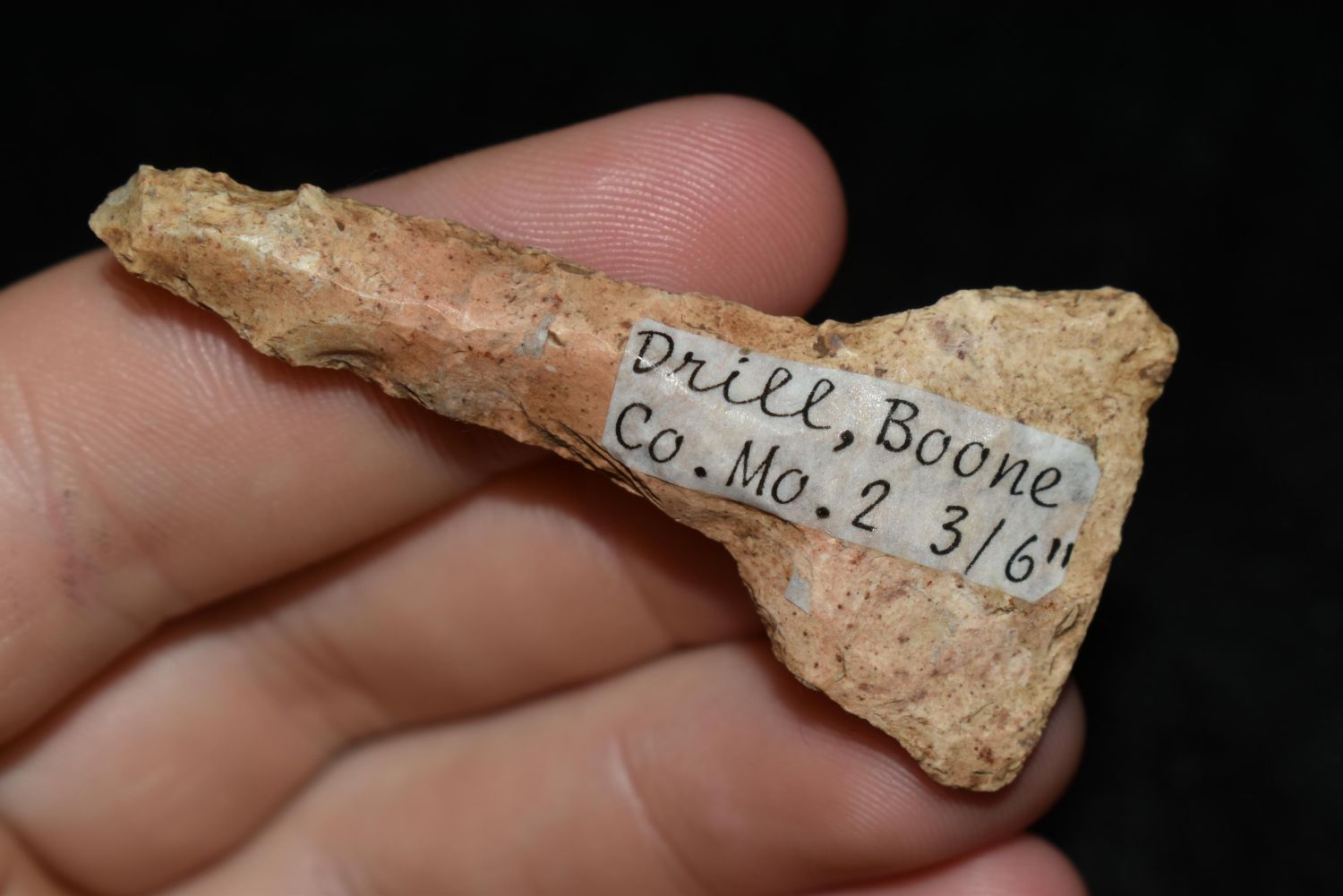 COLORFUL 2 3/16" DRILL, MOTLEY COA, FOUND IN BOONE COUNTY MISSOURI, INDIAN ARROWHEAD ARTIFACT