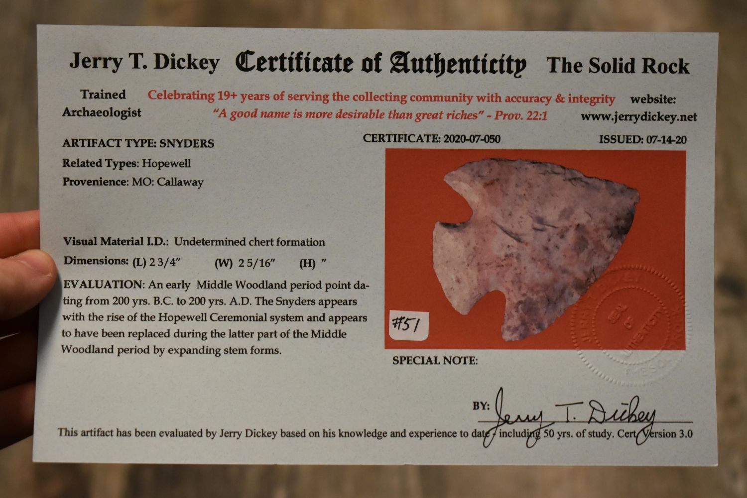 AMAZING 2 3/4" HOPEWELL SNYDERS, DICKEY COA, FOUND IN CALLAWAY COUNTY MISSOURI, INDIAN ARROWHEAD ARTIFACT