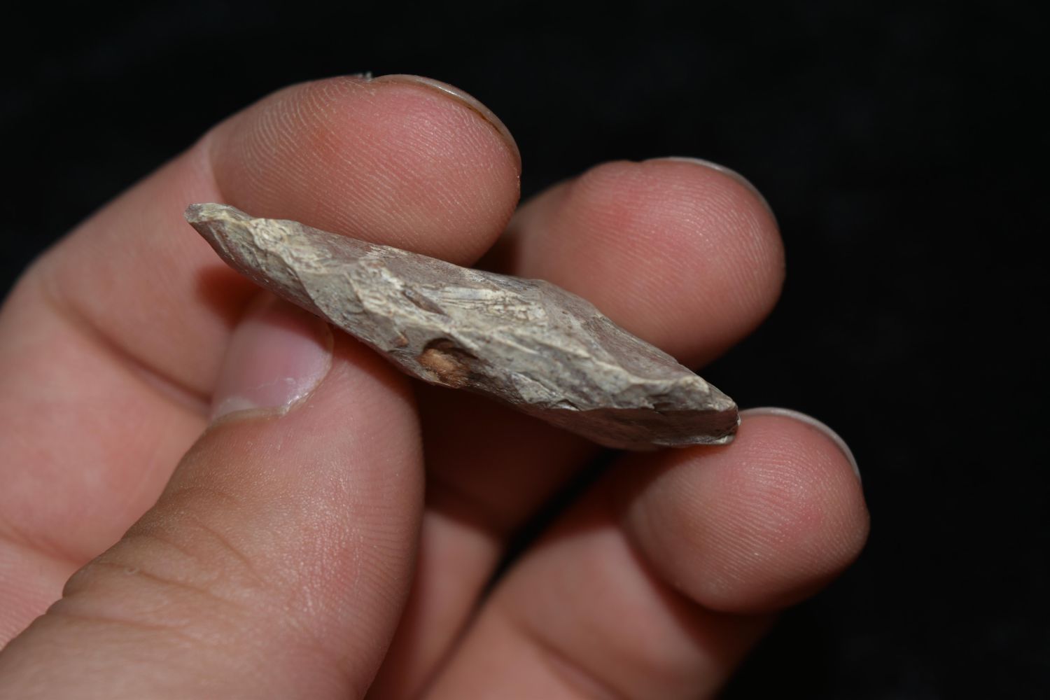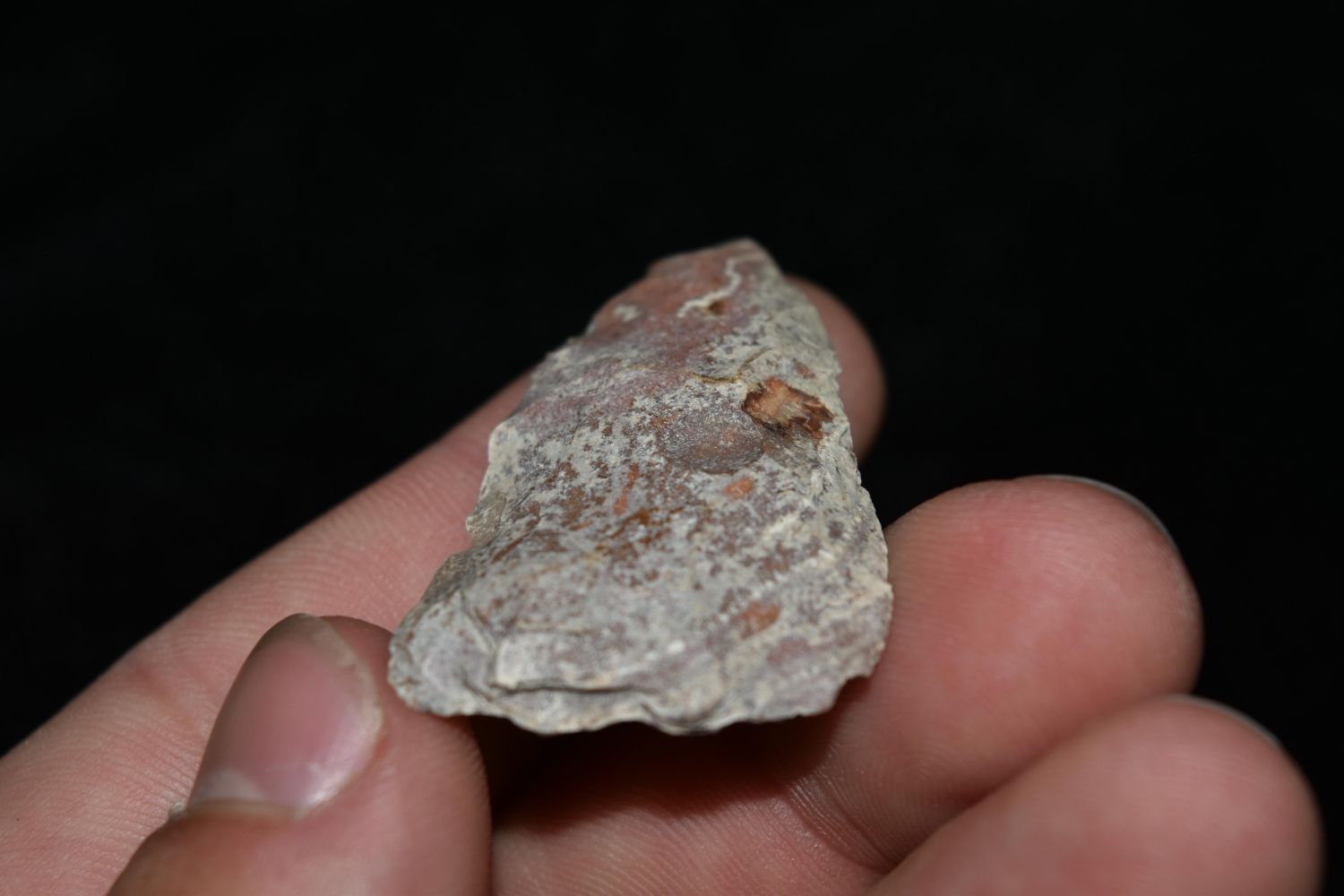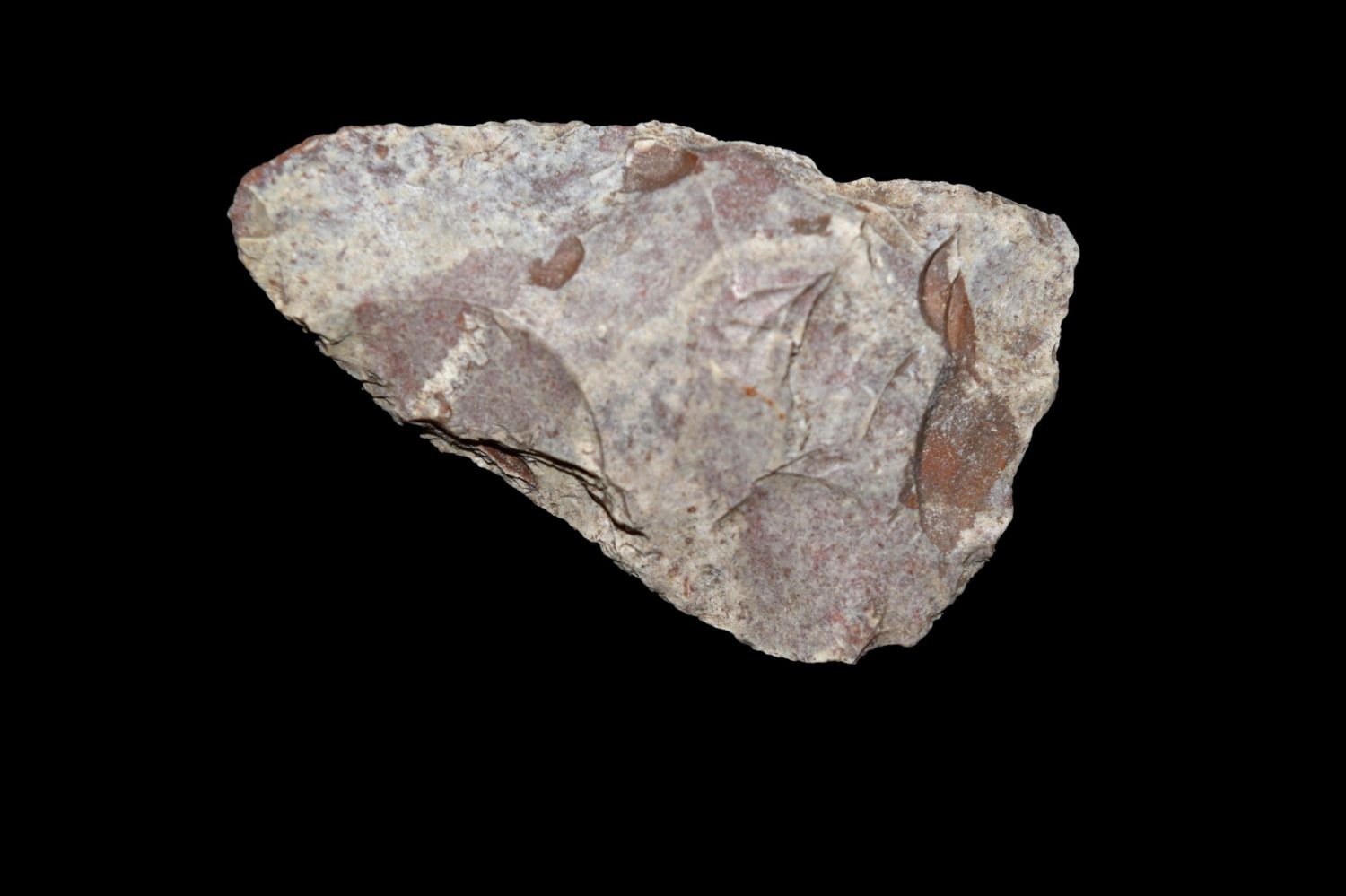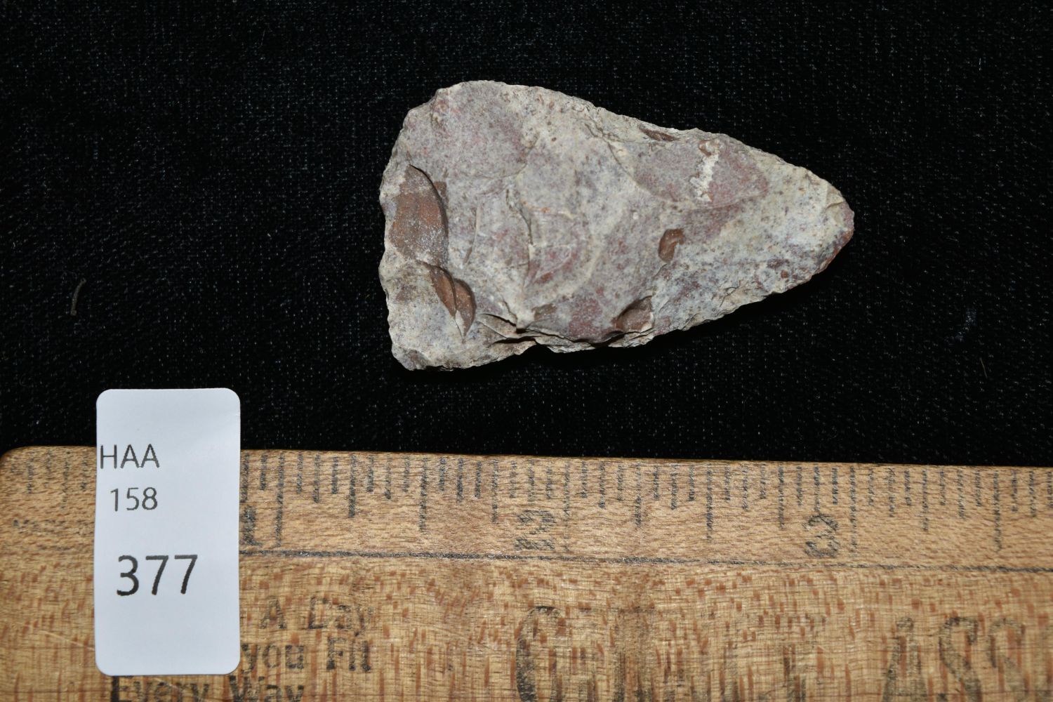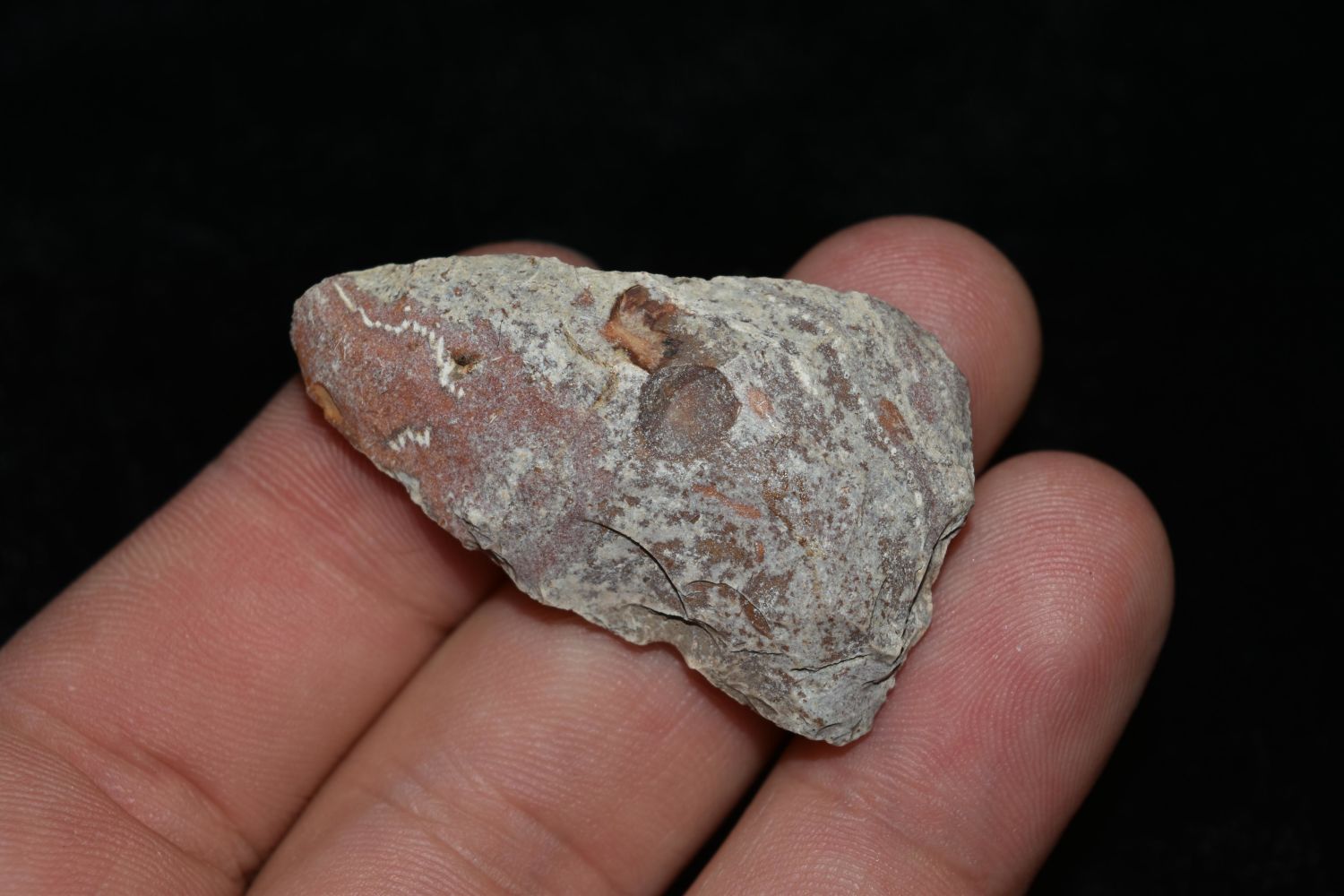 1 3/4" River Stained Triangle. This collection contains the personally found relics of Steve Koch, Winchester Illinois. Steve hunted relics his entire life with family and friends. He mainly hunted in the Scott Co., Illinois area, and the majority of his finds came from the Illinois River Valley.