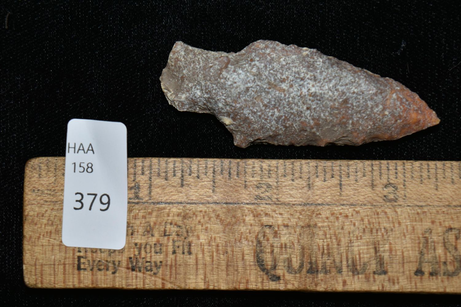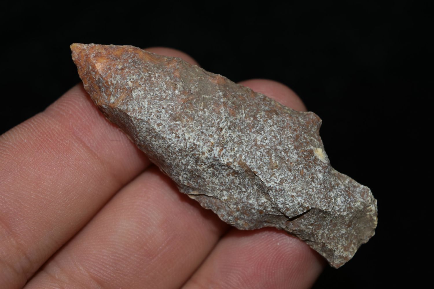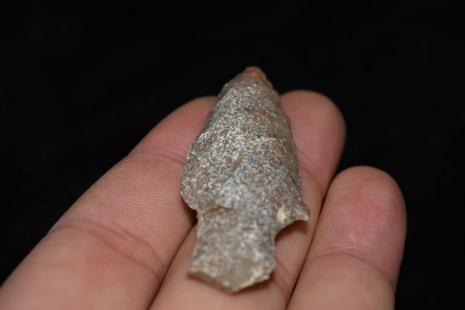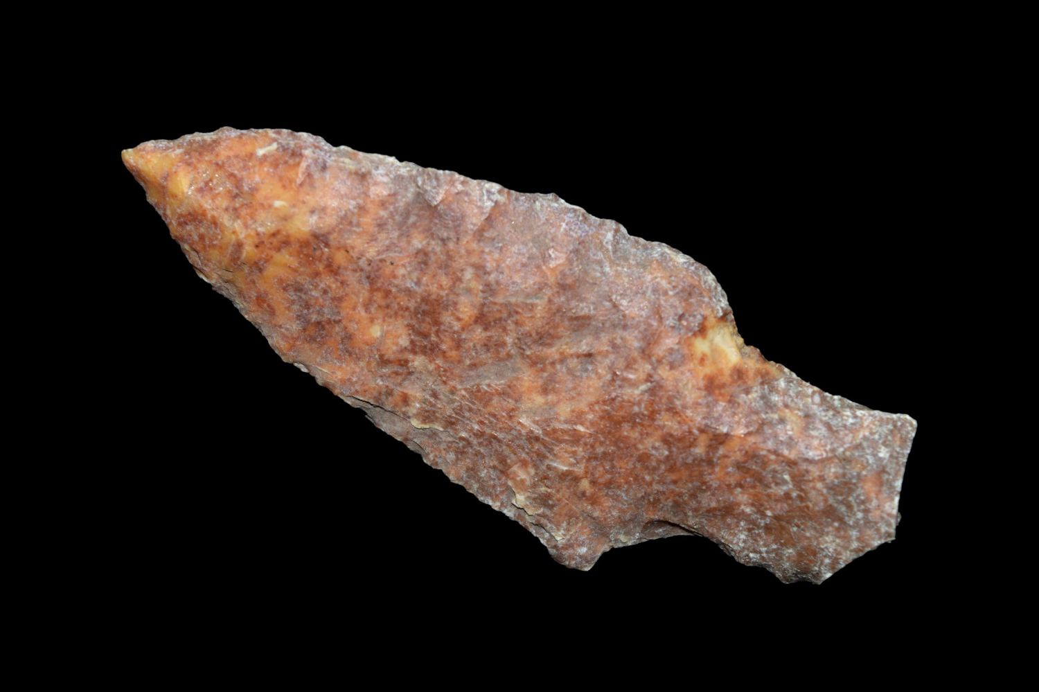 2 1/4" River Stained Stemmed Point. This collection contains the personally found relics of Steve Koch, Winchester Illinois. Steve hunted relics his entire life with family and friends. He mainly hunted in the Scott Co., Illinois area, and the majority of his finds came from the Illinois River Valley.
