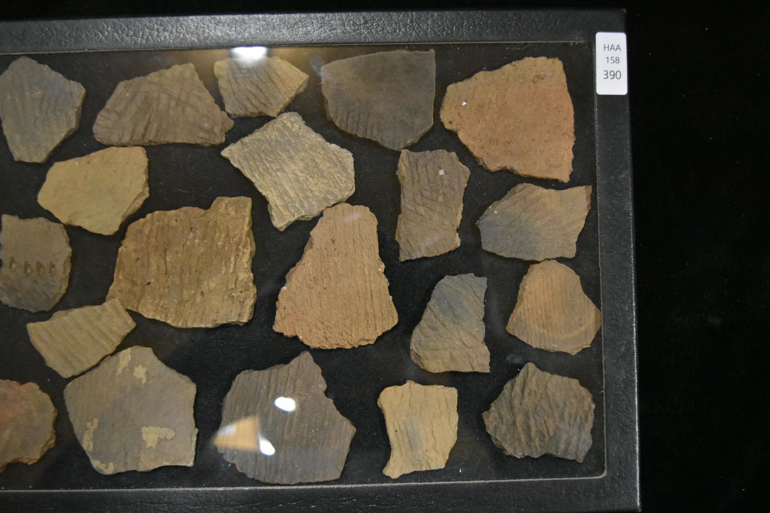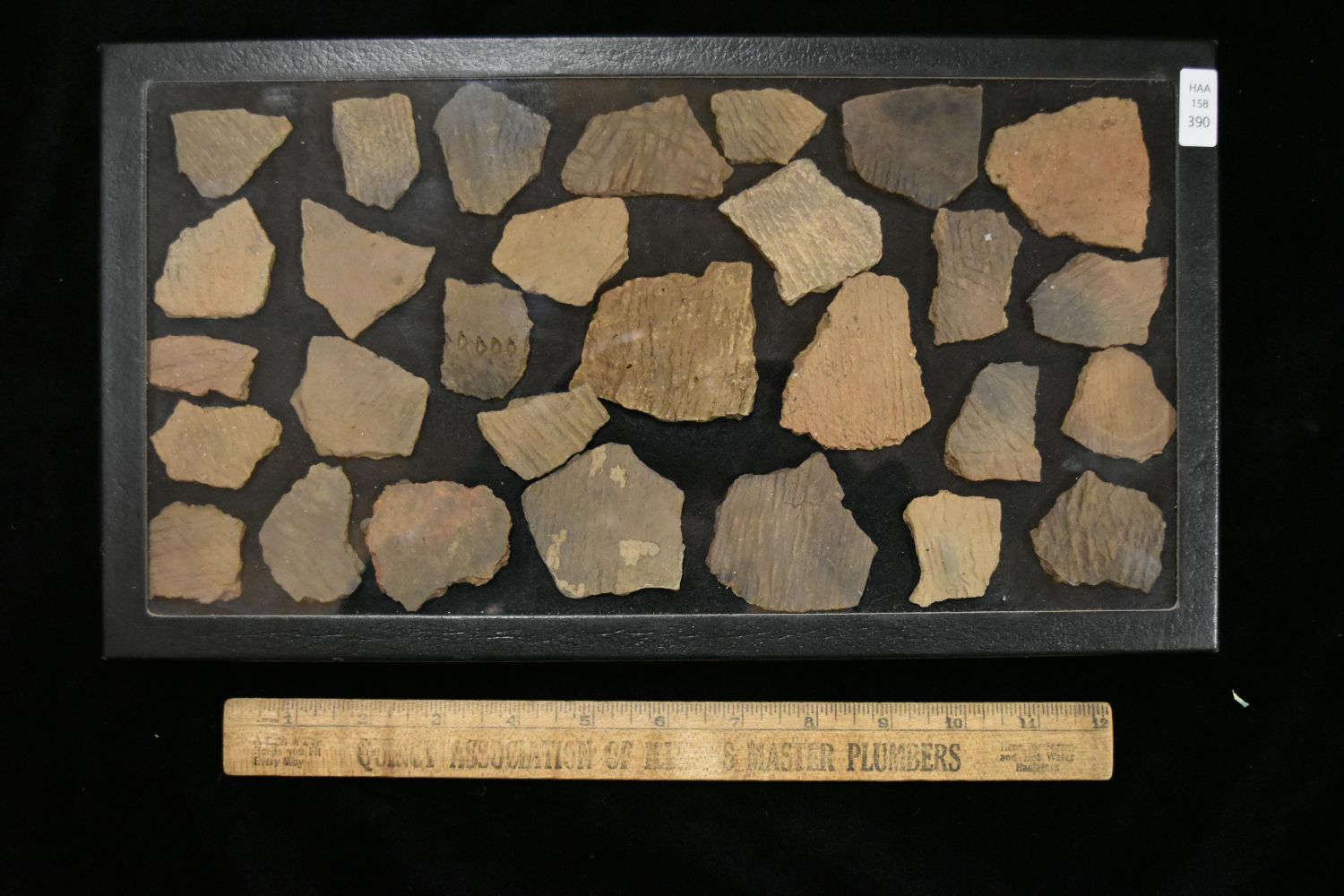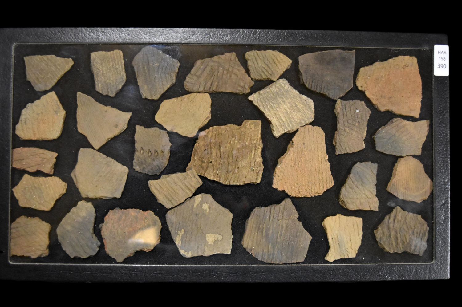 Frame contained 29 Pottery shards. This collection contains the personally found relics of Steve Koch, Winchester Illinois. Steve hunted relics his entire life with family and friends. He mainly hunted in the Scott Co., Illinois area, and the majority of his finds came from the Illinois River Valley.