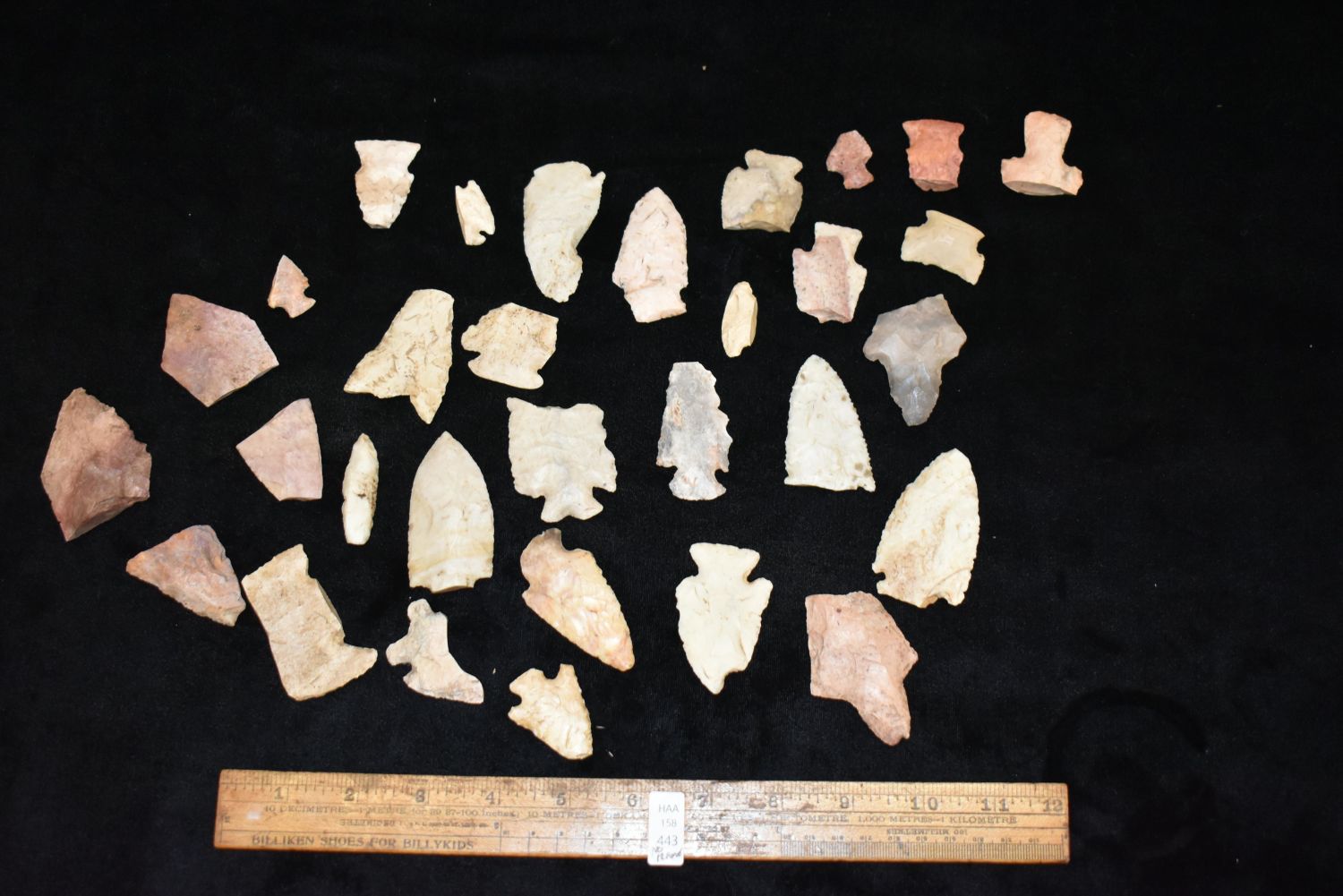 Frame containing 32 heartbreaker Arrowheads. This collection contains the personally found relics of Steve Koch, Winchester Illinois. Steve hunted relics his entire life with family and friends. He mainly hunted in the Scott Co., Illinois area, and the majority of his finds came from the Illinois River Valley.