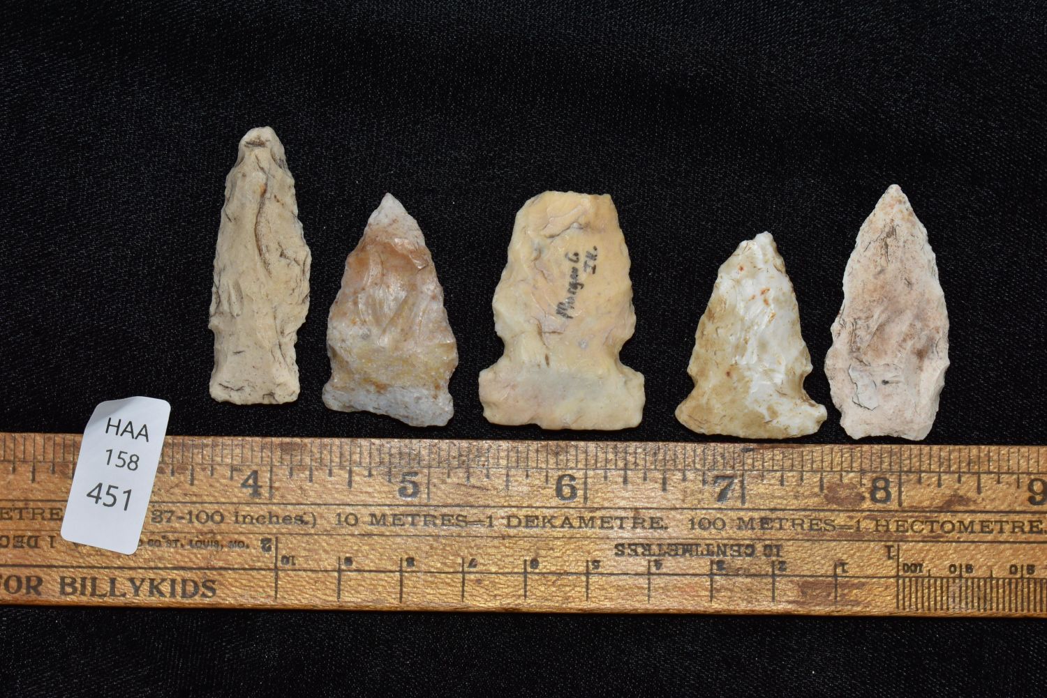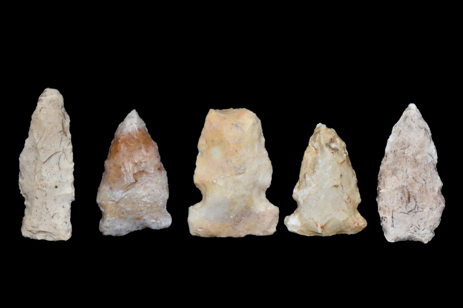 Lot of 5 Arrowheads. This collection contains the personally found relics of Steve Koch, Winchester Illinois. Steve hunted relics his entire life with family and friends. He mainly hunted in the Scott Co., Illinois area, and the majority of his finds came from the Illinois River Valley.