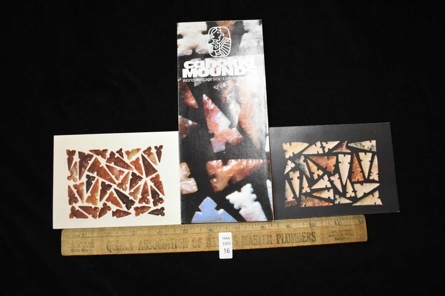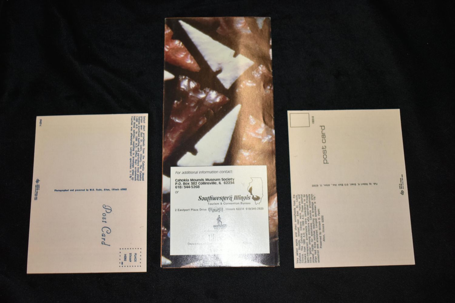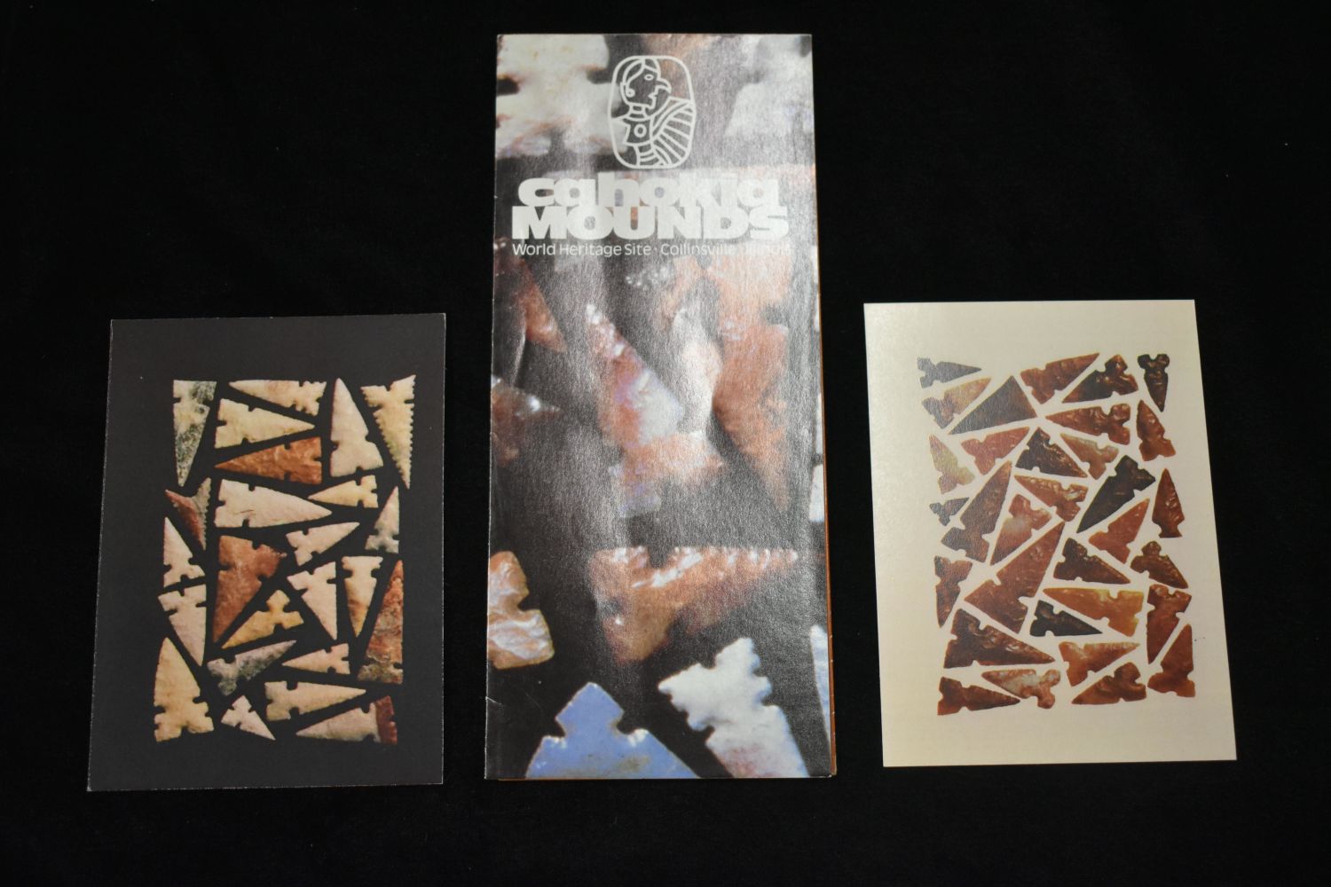 Lot of 2 Vintage Cahokia Mounds Postcards and site pamphlet- Famous Cahokia Gem Points