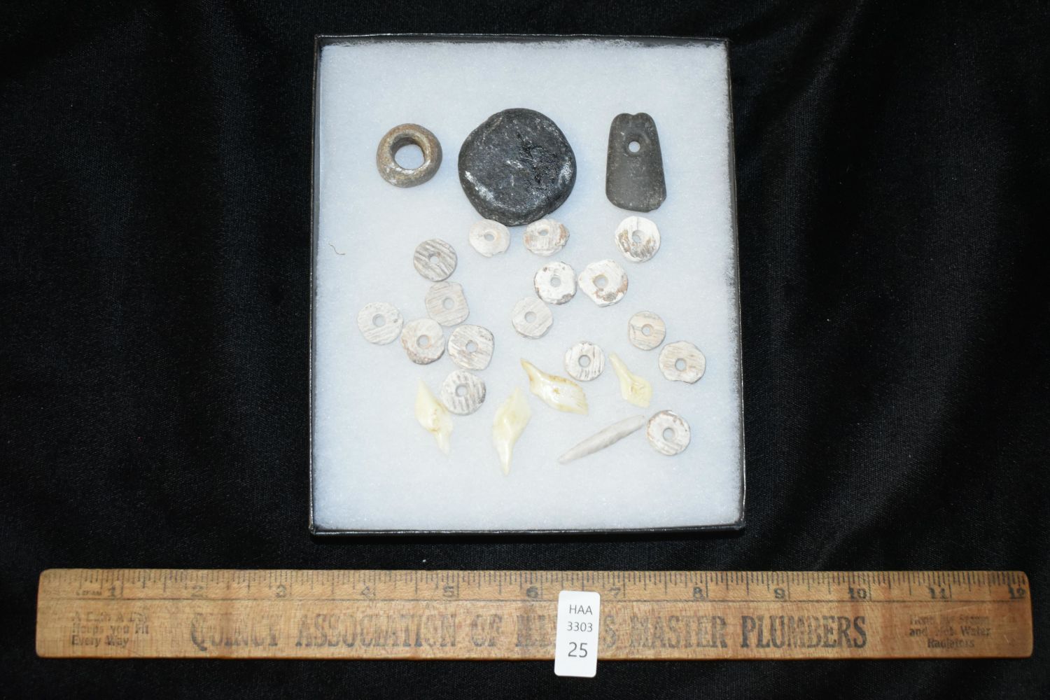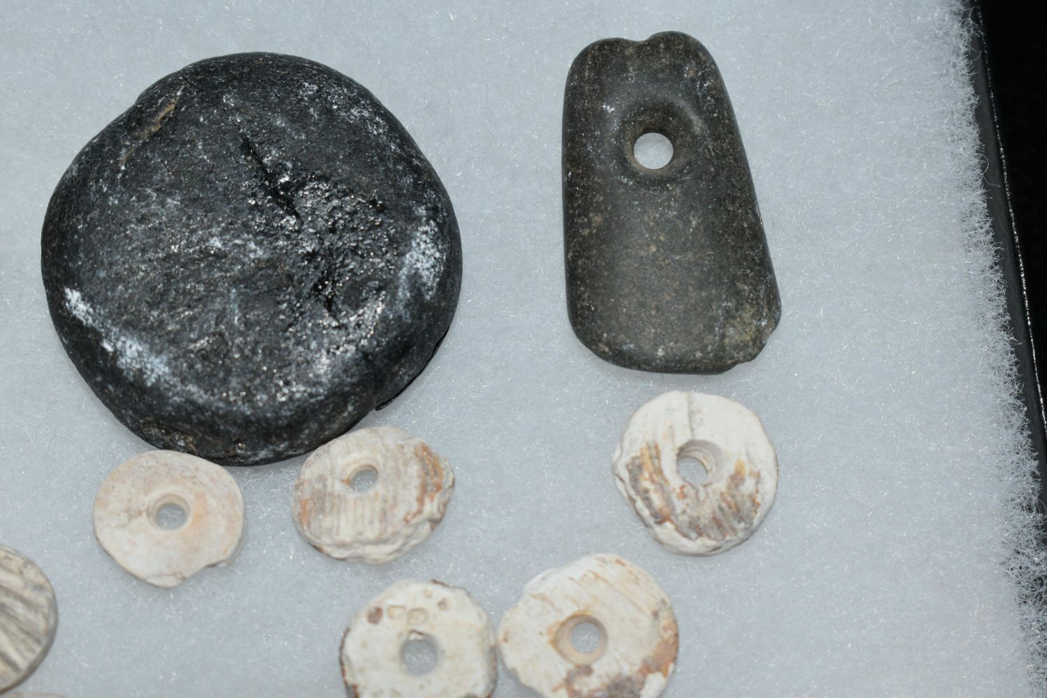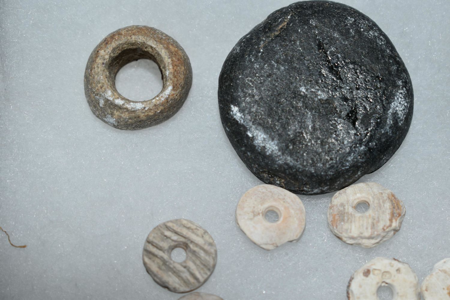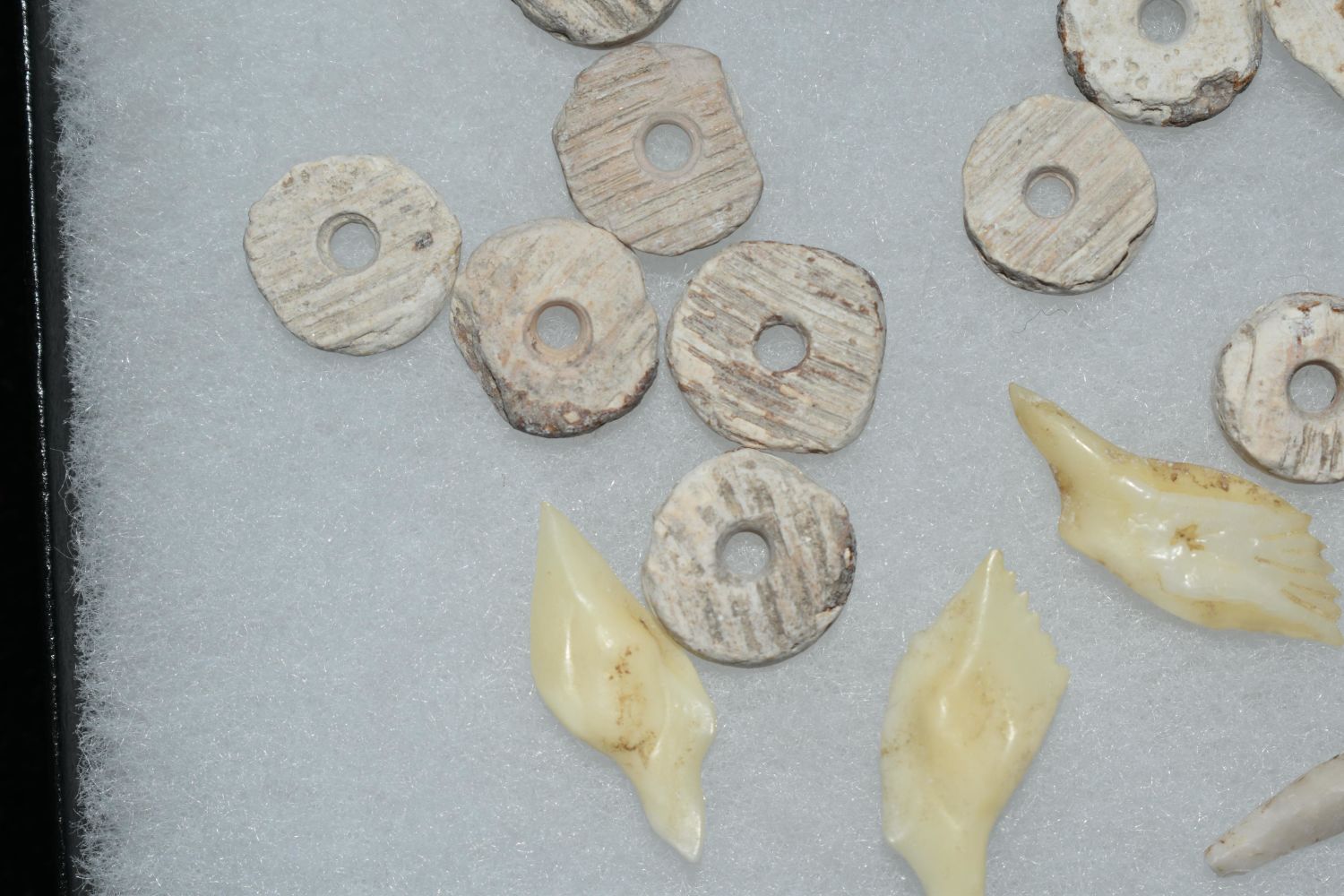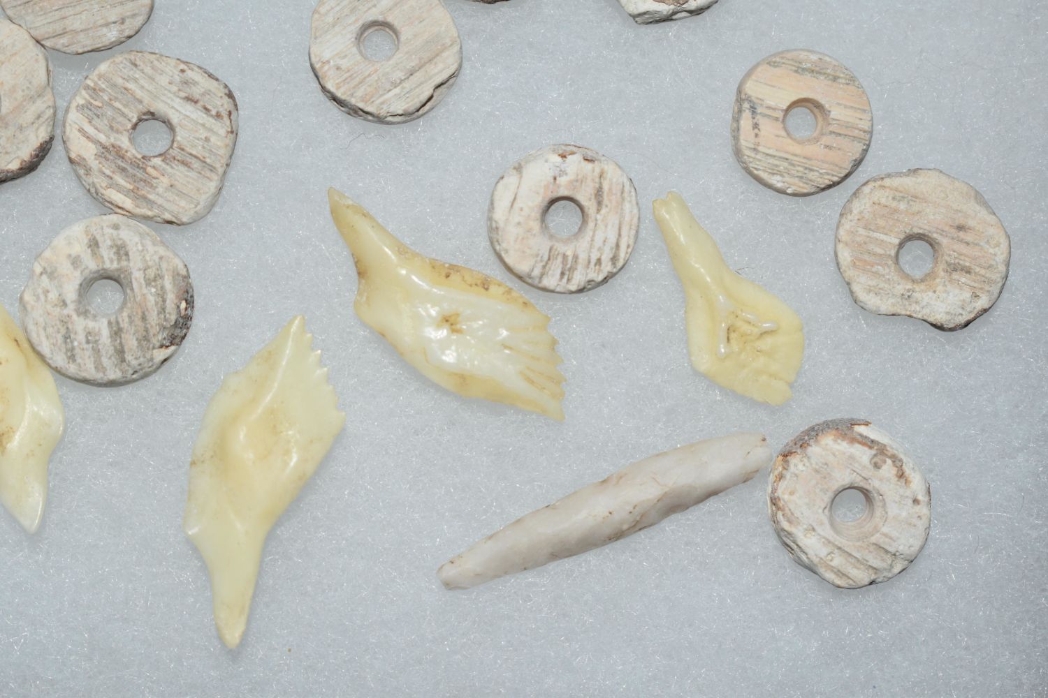 Grouping of Artifacts found by Clarence Evans at the Old Grandpas location at Cahokia Mounds- includes large bead, pendant, finished shell beads and gar scalepoints, really nice micro-drill