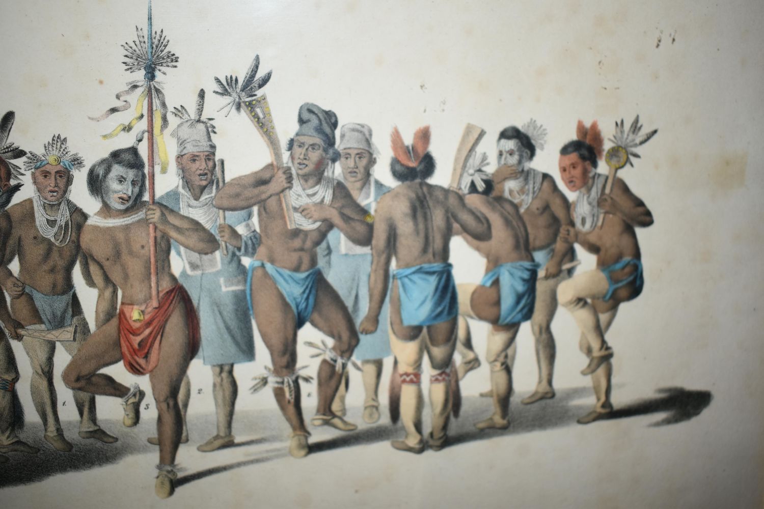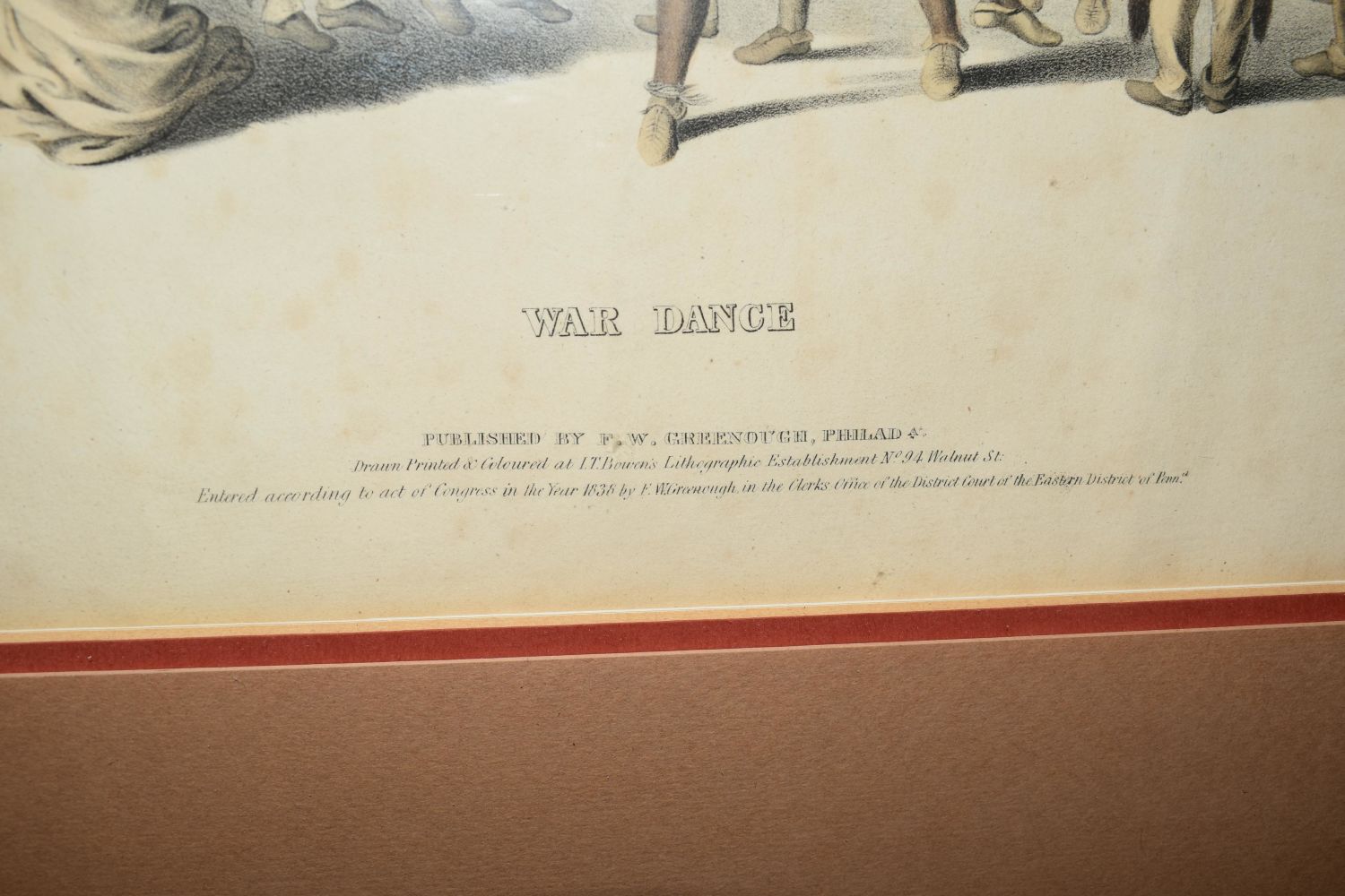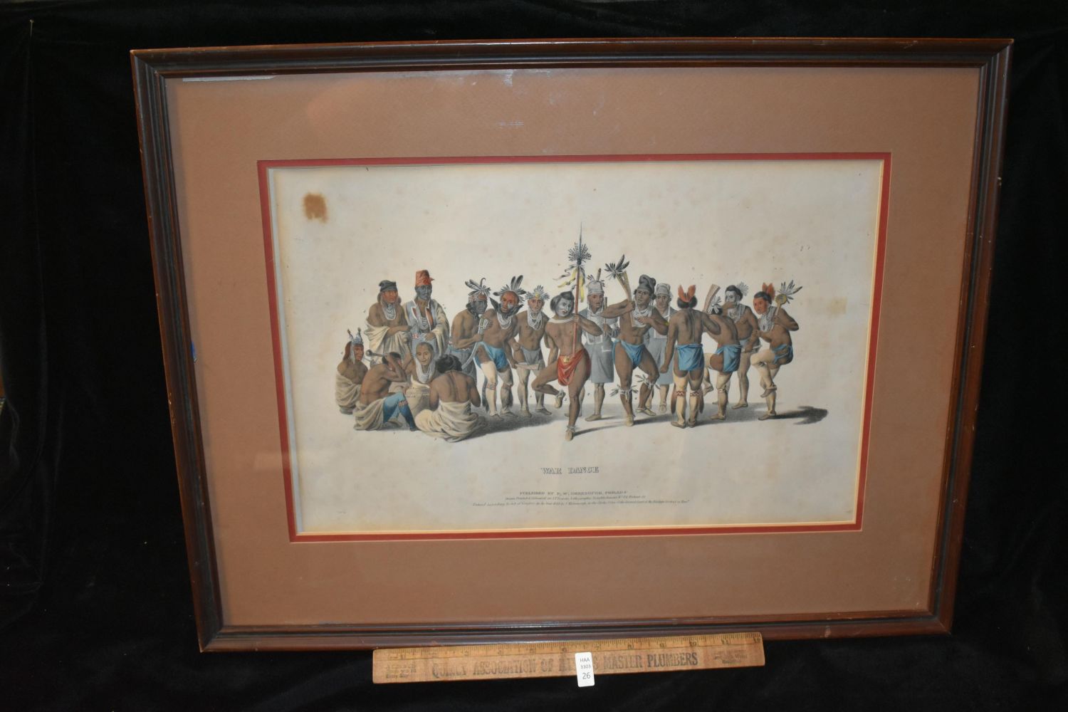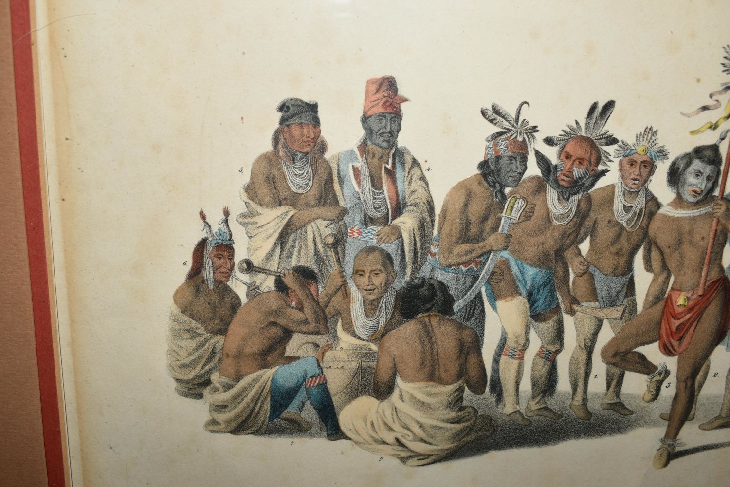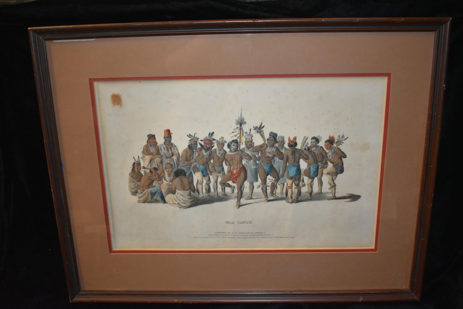 McKenney & Hall "War Dance of the Sauk & Fox", hand colored lithograph by J. J. Bowen 1838, from The History of the Indian Tribes of North America – framed 13.95 x19.5"