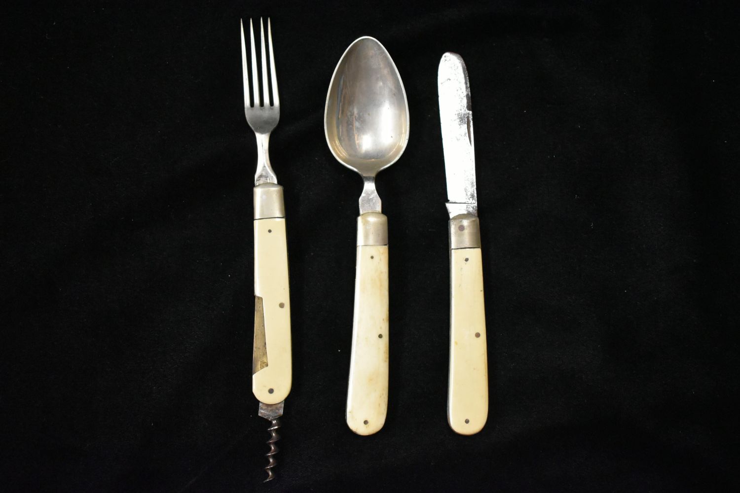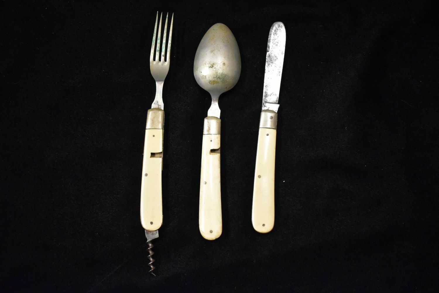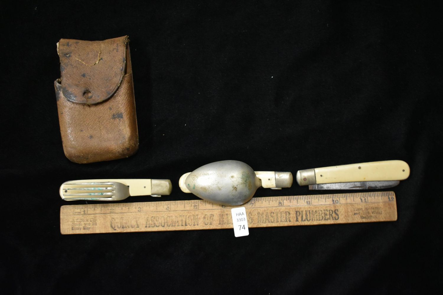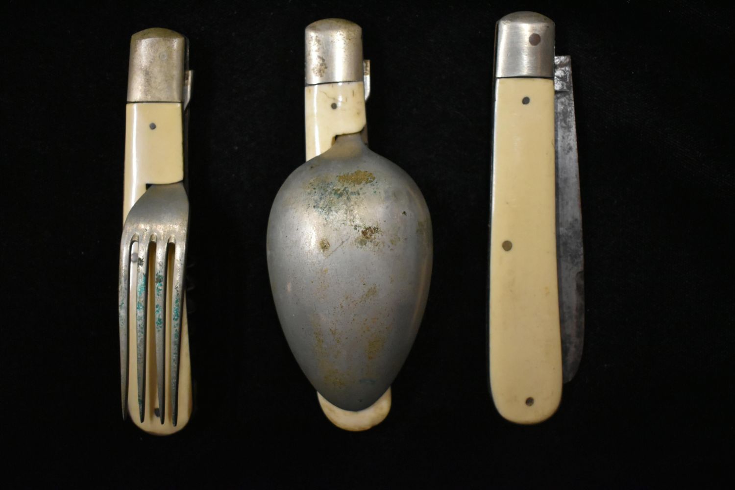 Antique European Pocket knife plus utensil Set with leather Pouch Bone handle WWI- WWII field Cutlery Set