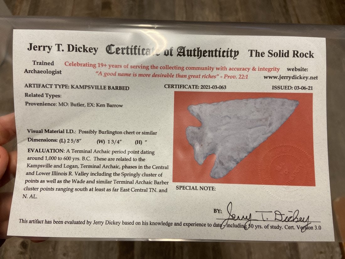 2 5/8" Barbed Kampsville Butler Co MO Jerry Dickey COA Ex Nick Gatses