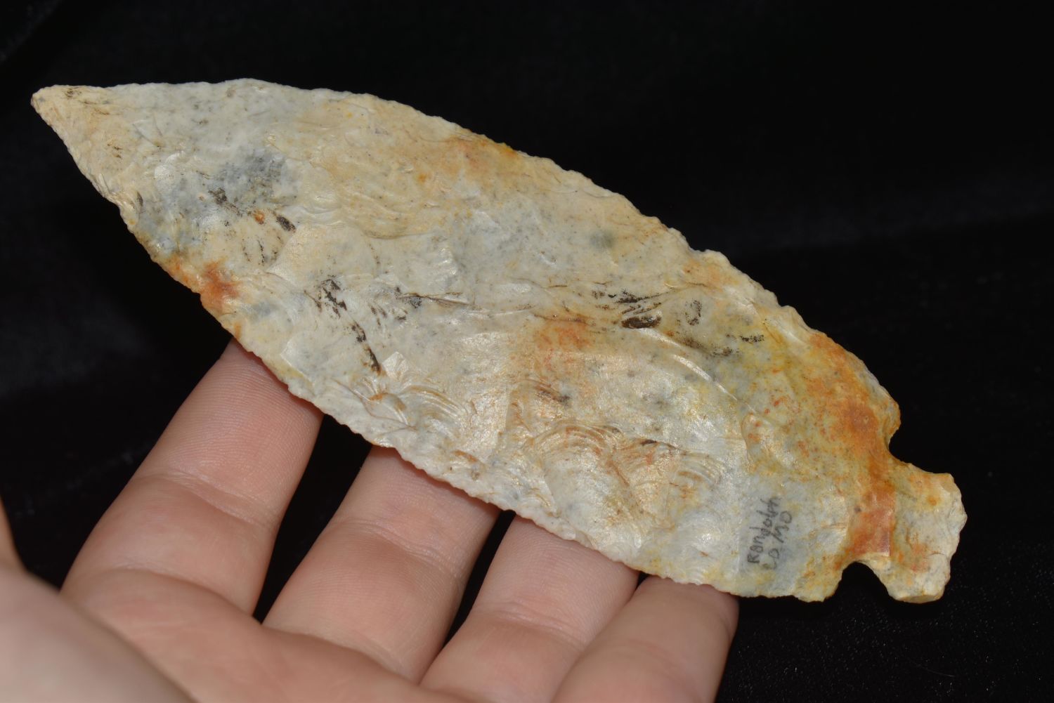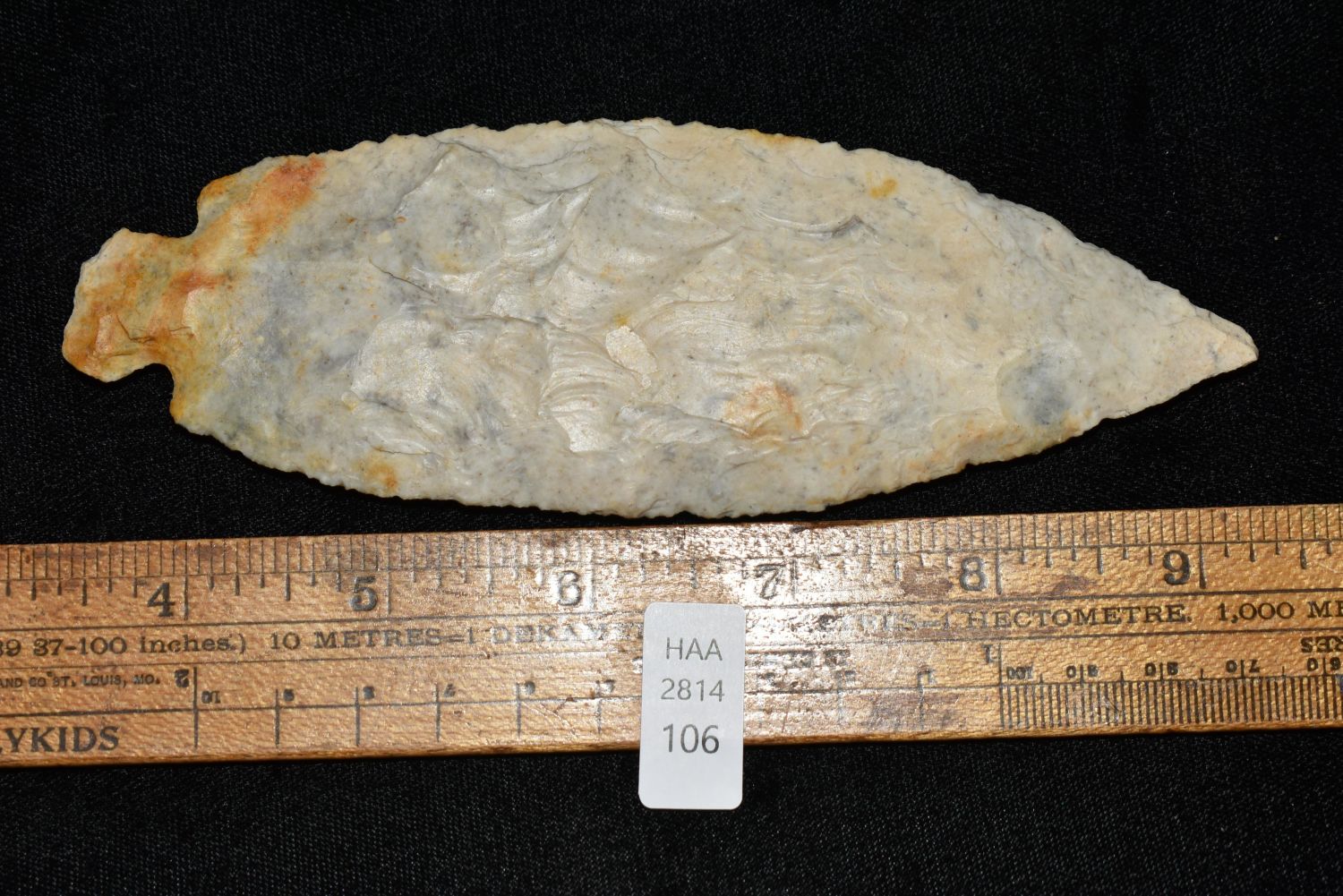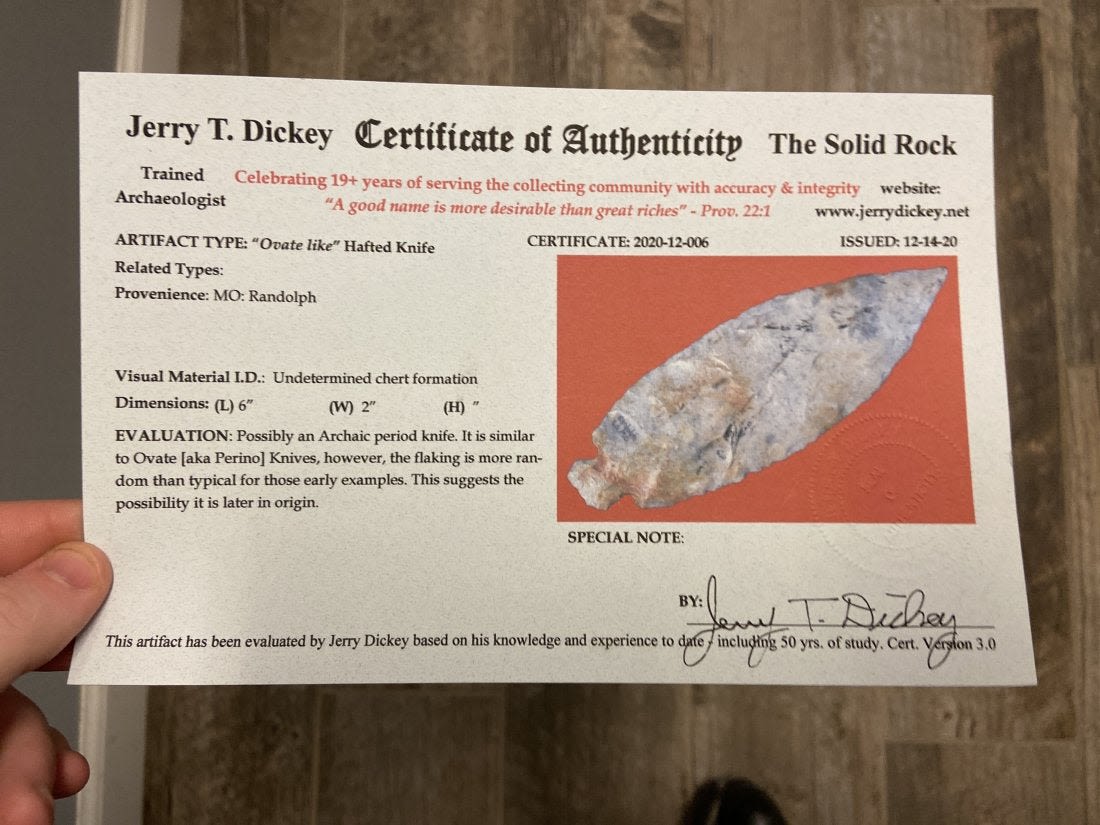 Phenomenal 6" Paleo Notched Ovoid Knife found in Randolph County, MO. Dickey COA , Authentic Native American Arrowhead