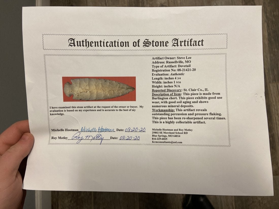 Outstanding and Super Well Made 4 3/4" Dovetail found in St Clair County, IL Ex. Steve Lee Motley COA, Authentic Native American Arrowhead