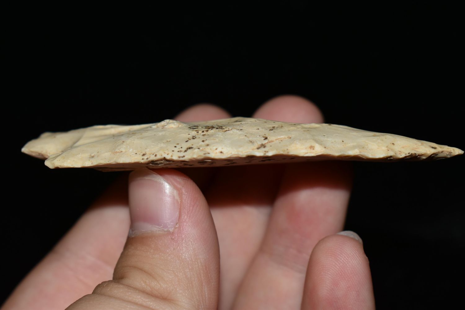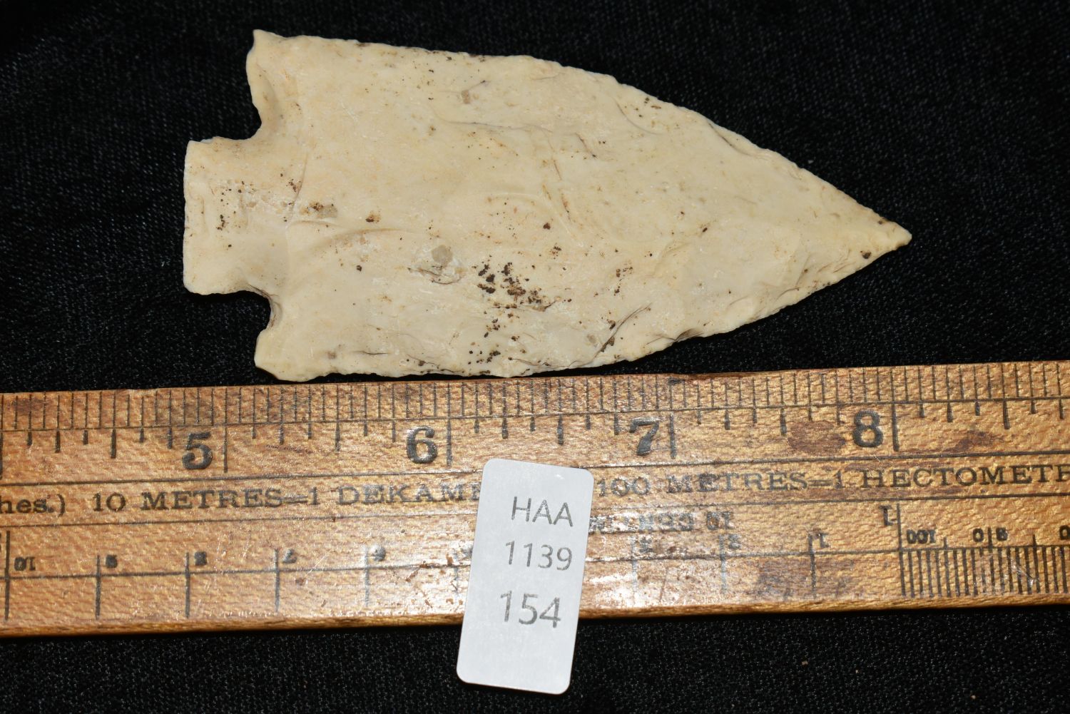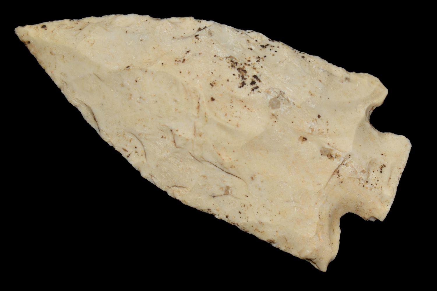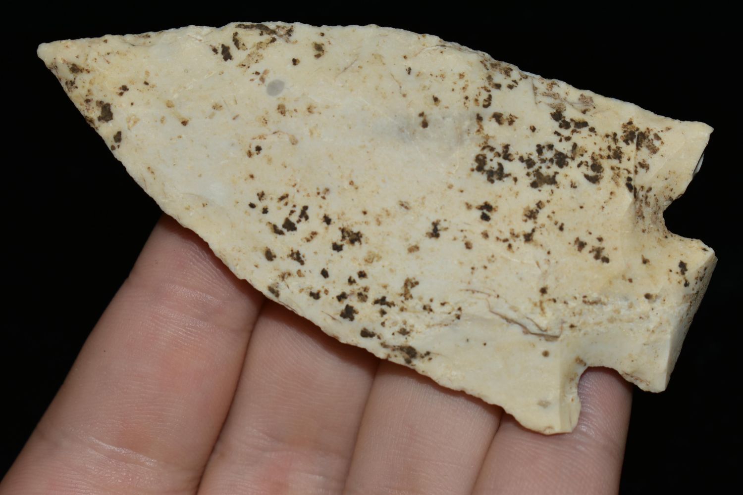 3 3/8" Etley found in Jefferson County, MO made of heavily patinated Burlington, Authentic Native American Arrowhead