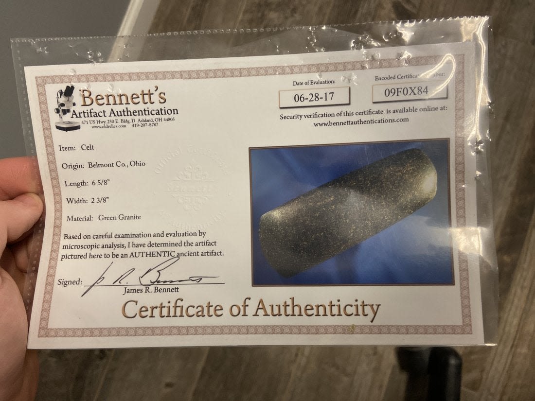 6 7/8" Hardstone Celt found in Belmont County, Ohio, Authentic Native American Arrowhead