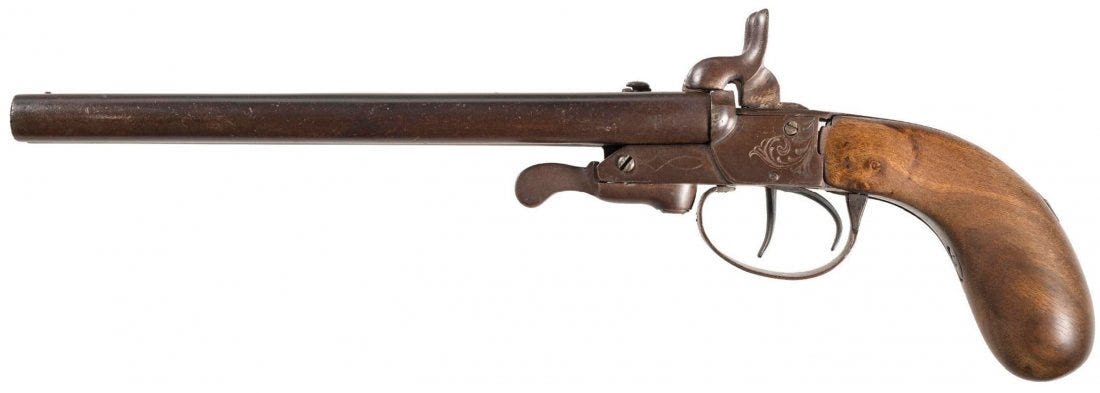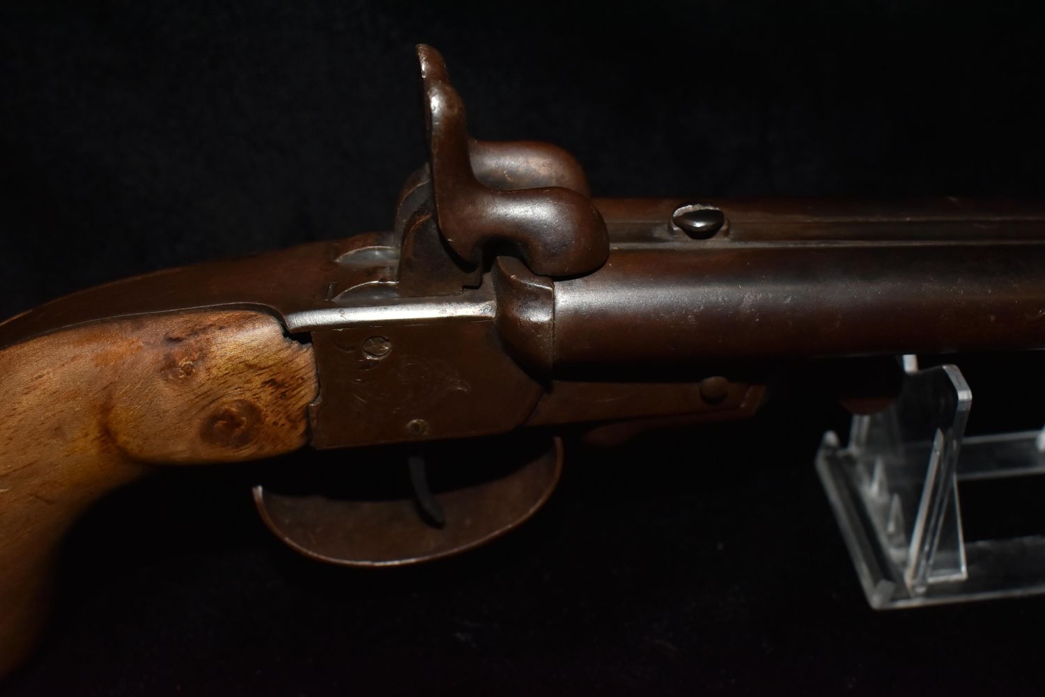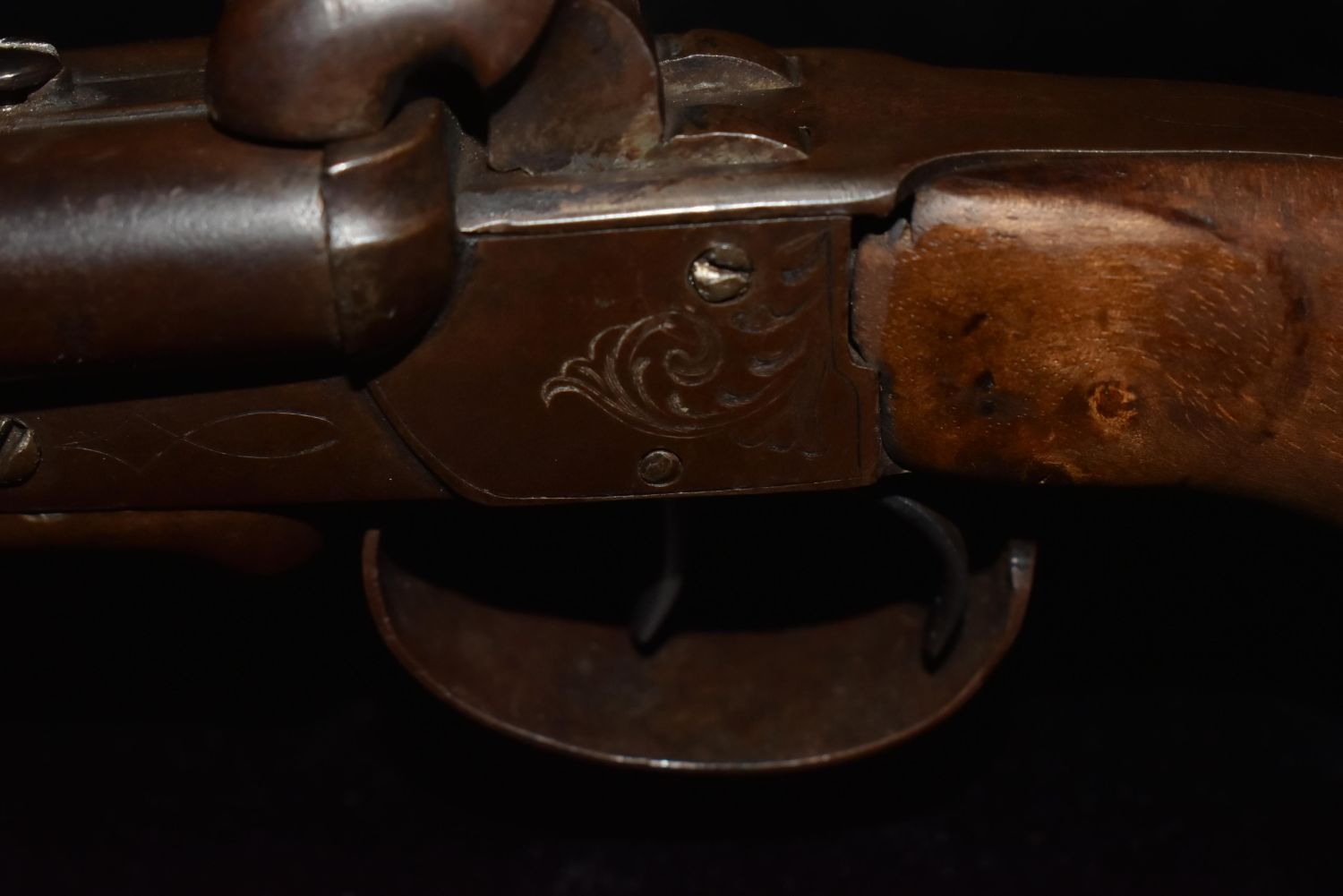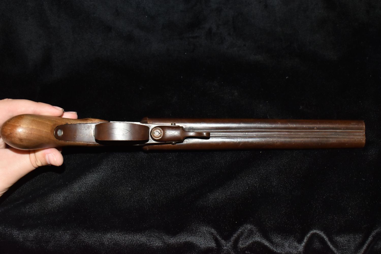 Unusual engraved long double barrel target pistol. 1840 to 1860 pin fire 42 gauge.