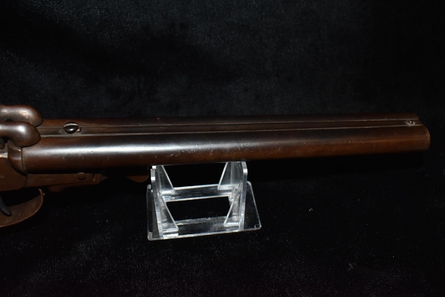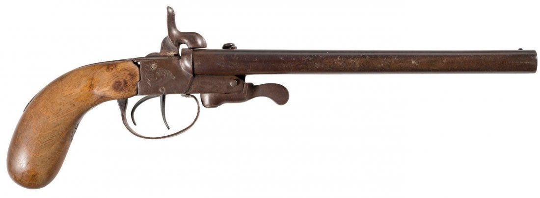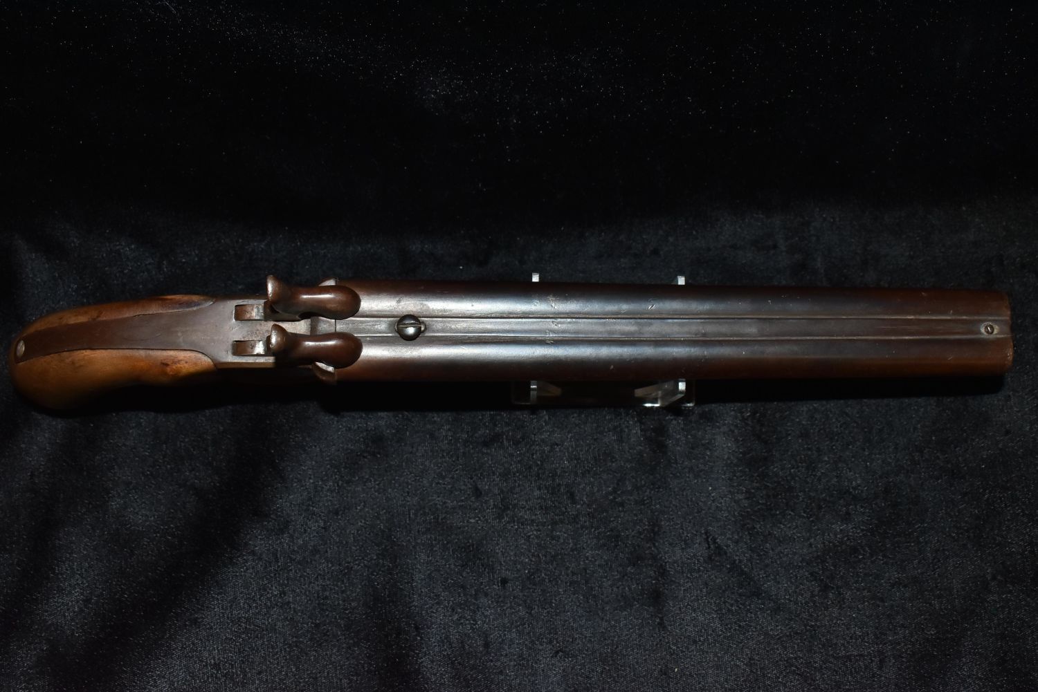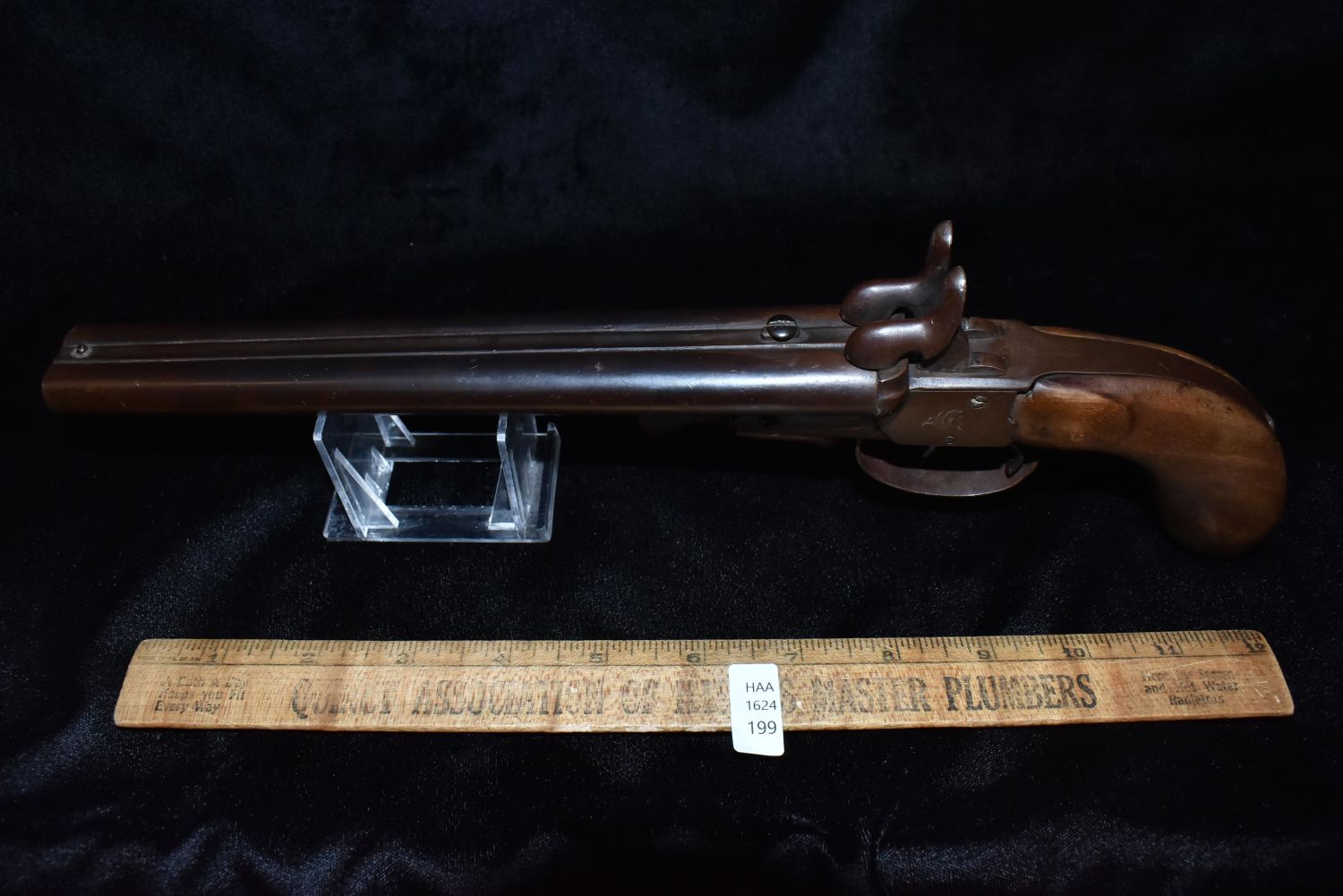 Unusual engraved long double barrel target pistol. 1840 to 1860 pin fire 42 gauge.