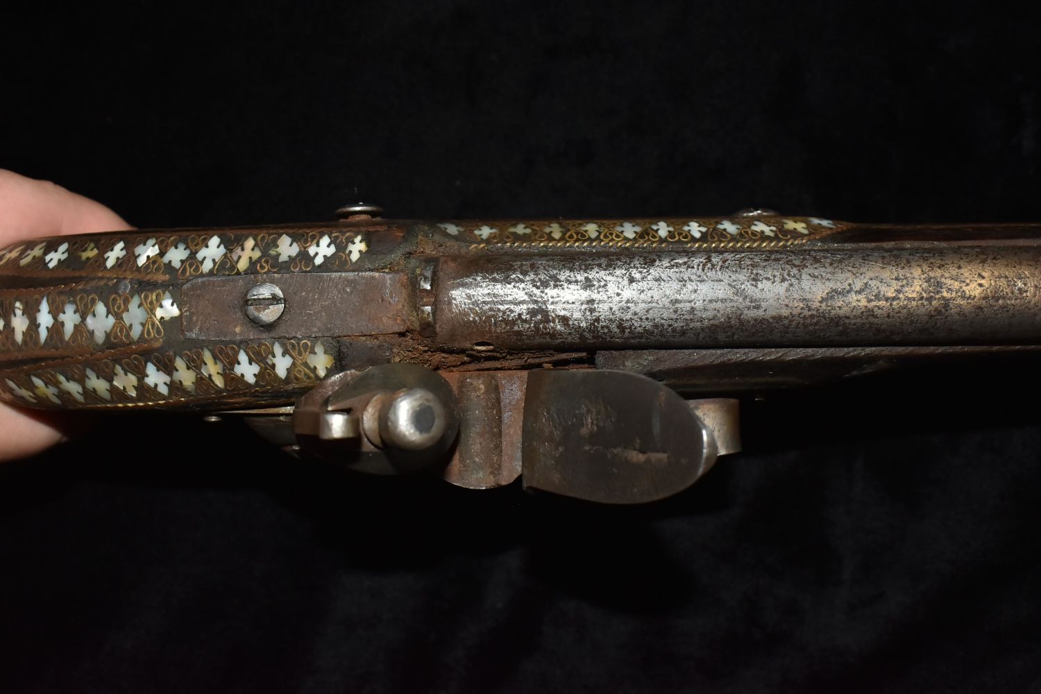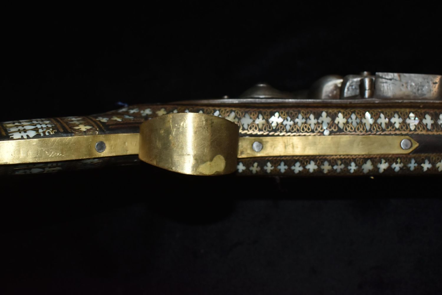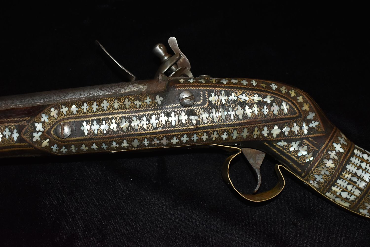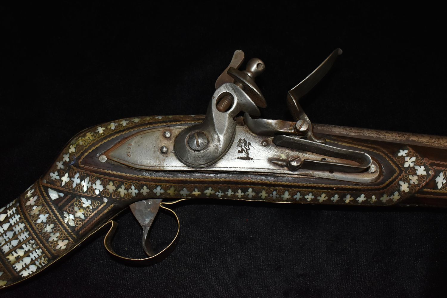 Ornate Mother of Pearl Inlaid Flintlock – Ornamental Only!Trigger guard is cracked. Makers mark of rampant lion on side also.This type of gun originated in the Middle East- possible Turkish-to be carried as status symbols by tribesman, and later to be sold to tourists.