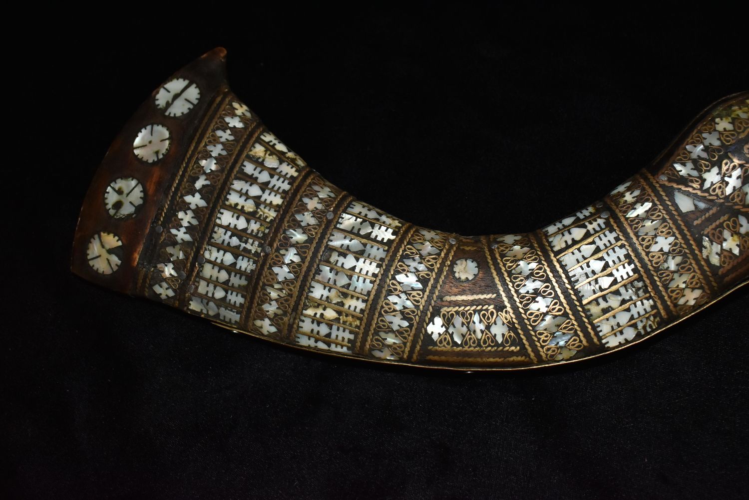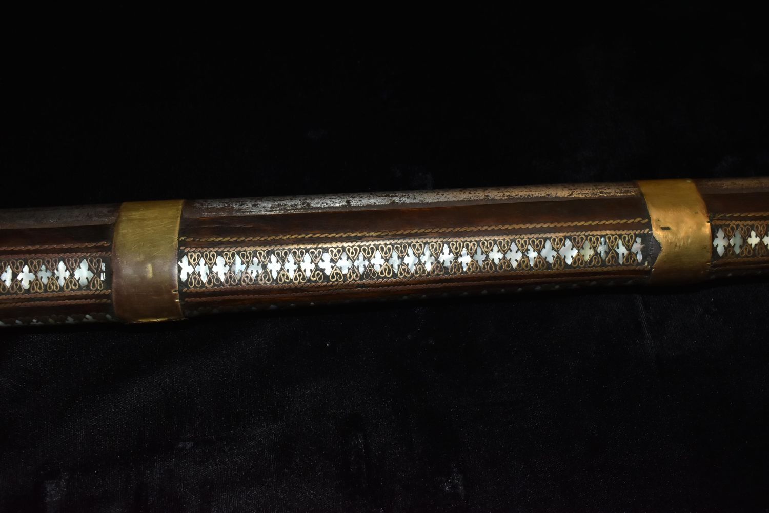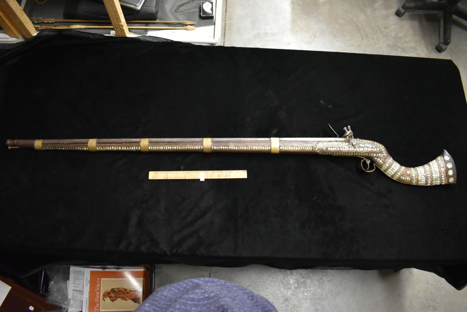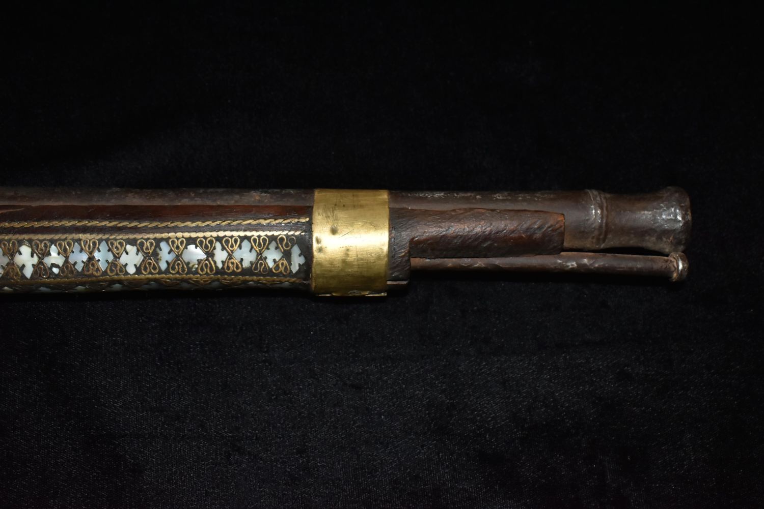 Ornate Mother of Pearl Inlaid Flintlock – Ornamental Only!Trigger guard is cracked. Makers mark of rampant lion on side also.This type of gun originated in the Middle East- possible Turkish-to be carried as status symbols by tribesman, and later to be sold to tourists.