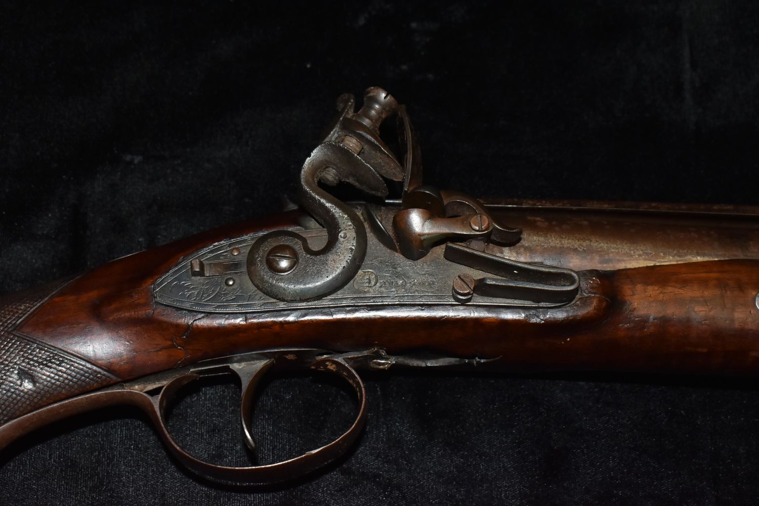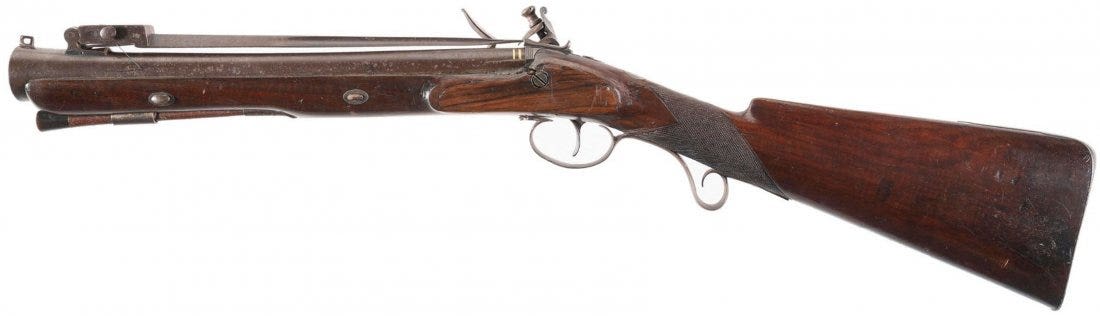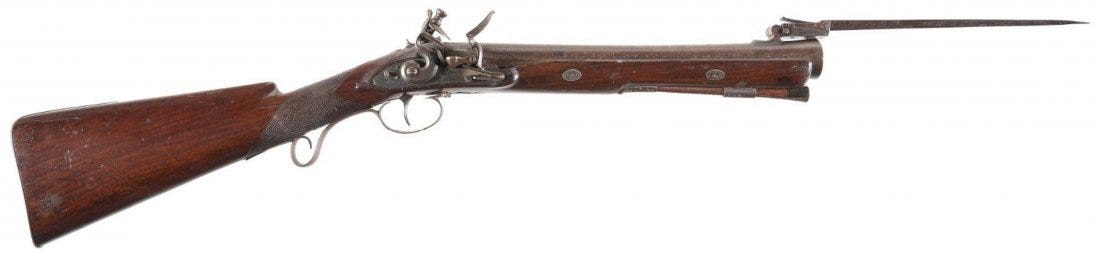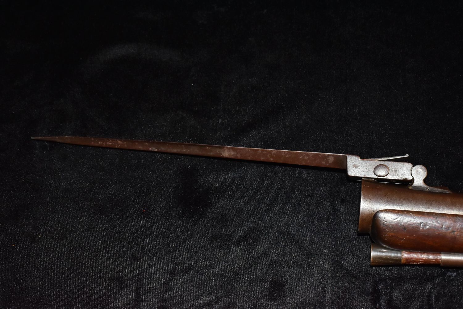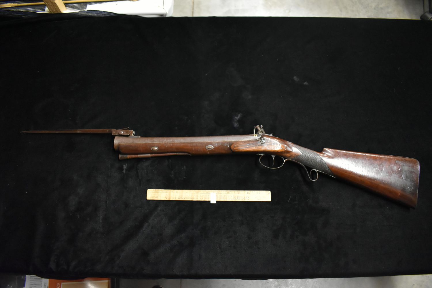 Rare Flintlock Blunderbuss with snap bayonet. Made by Davidson. 75 gauge with 14 inch barrel. Carved walnut stock