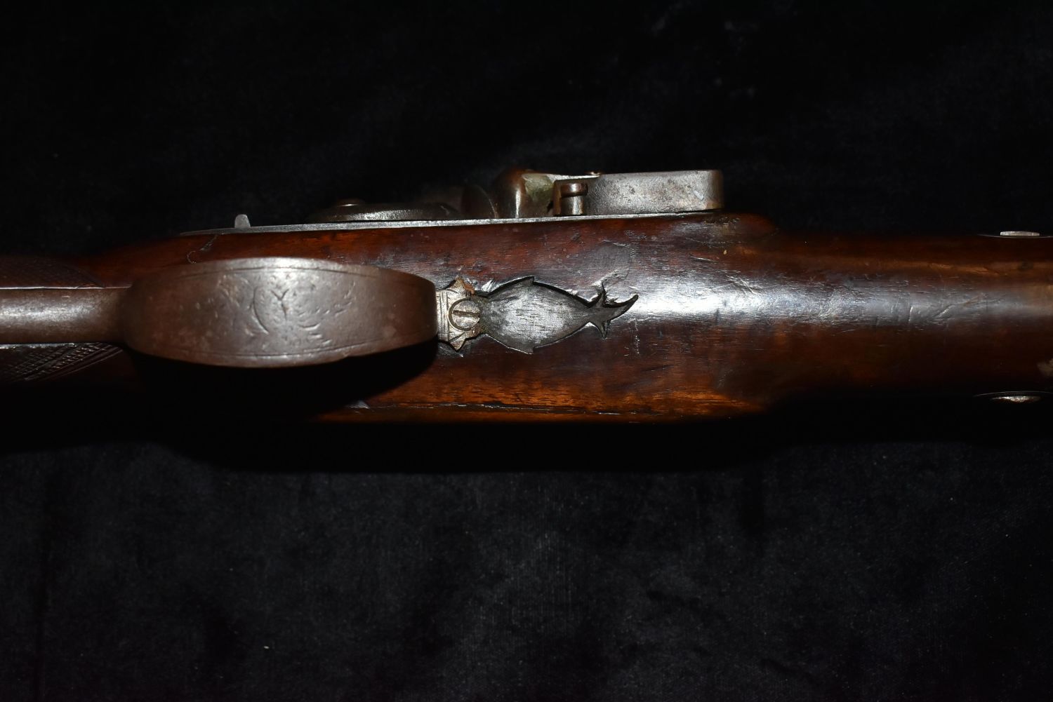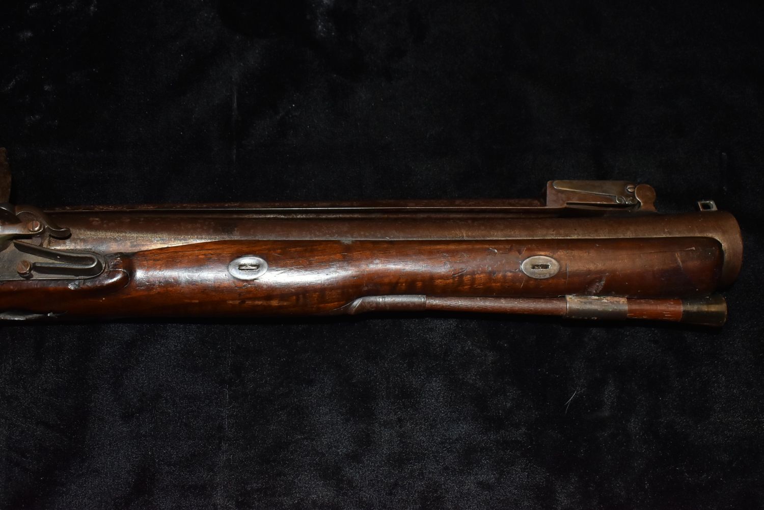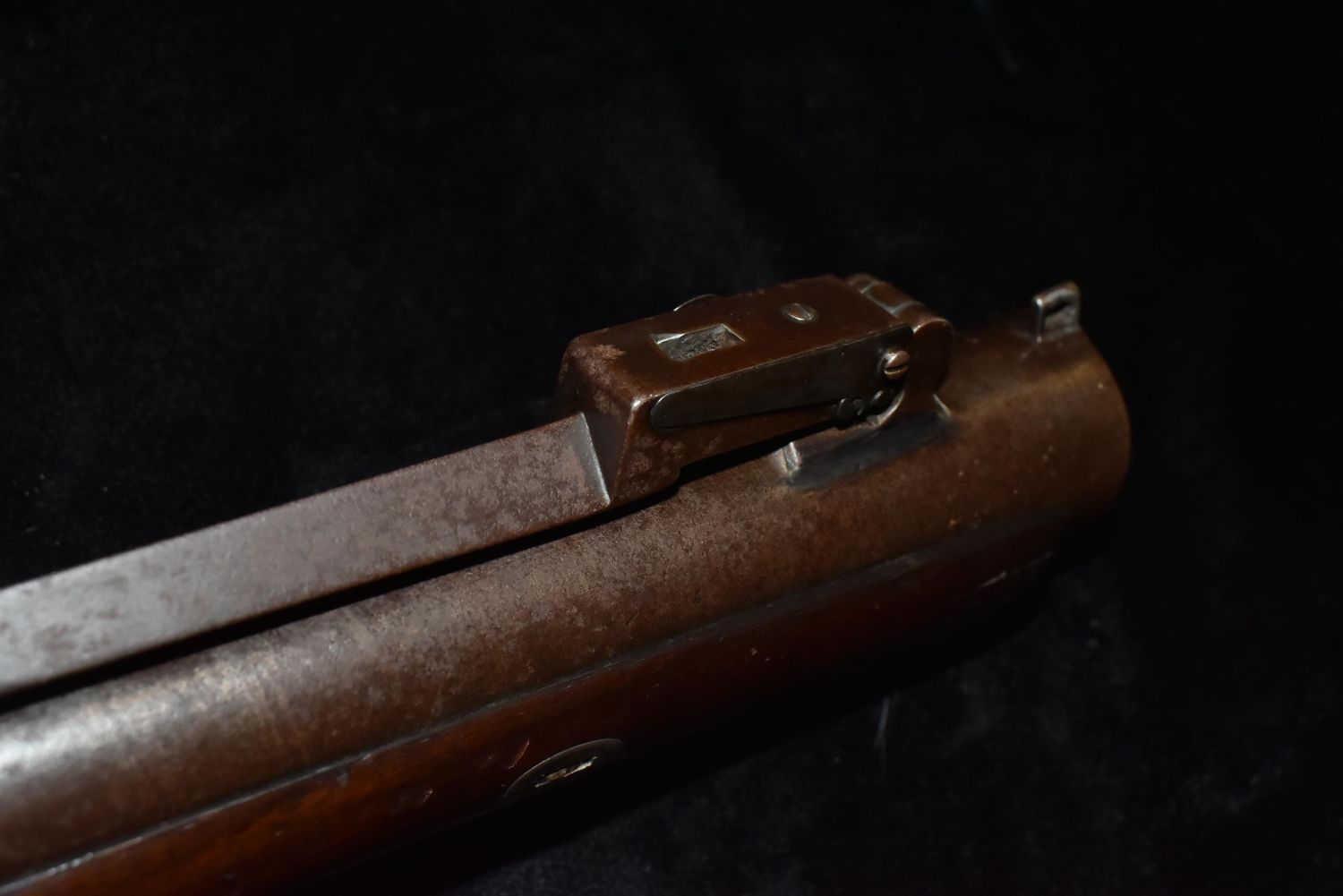 Rare Flintlock Blunderbuss with snap bayonet. Made by Davidson. 75 gauge with 14 inch barrel. Carved walnut stock