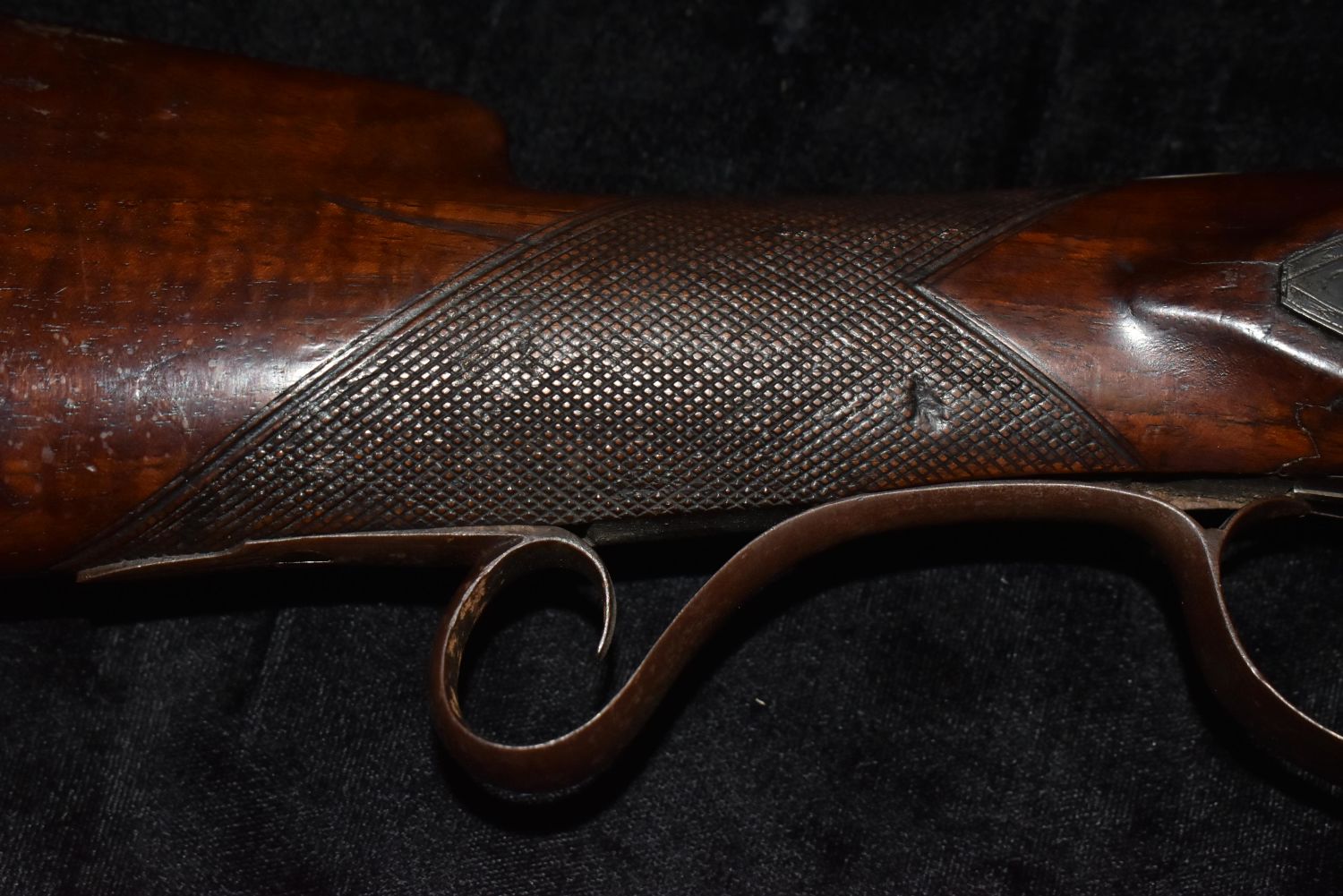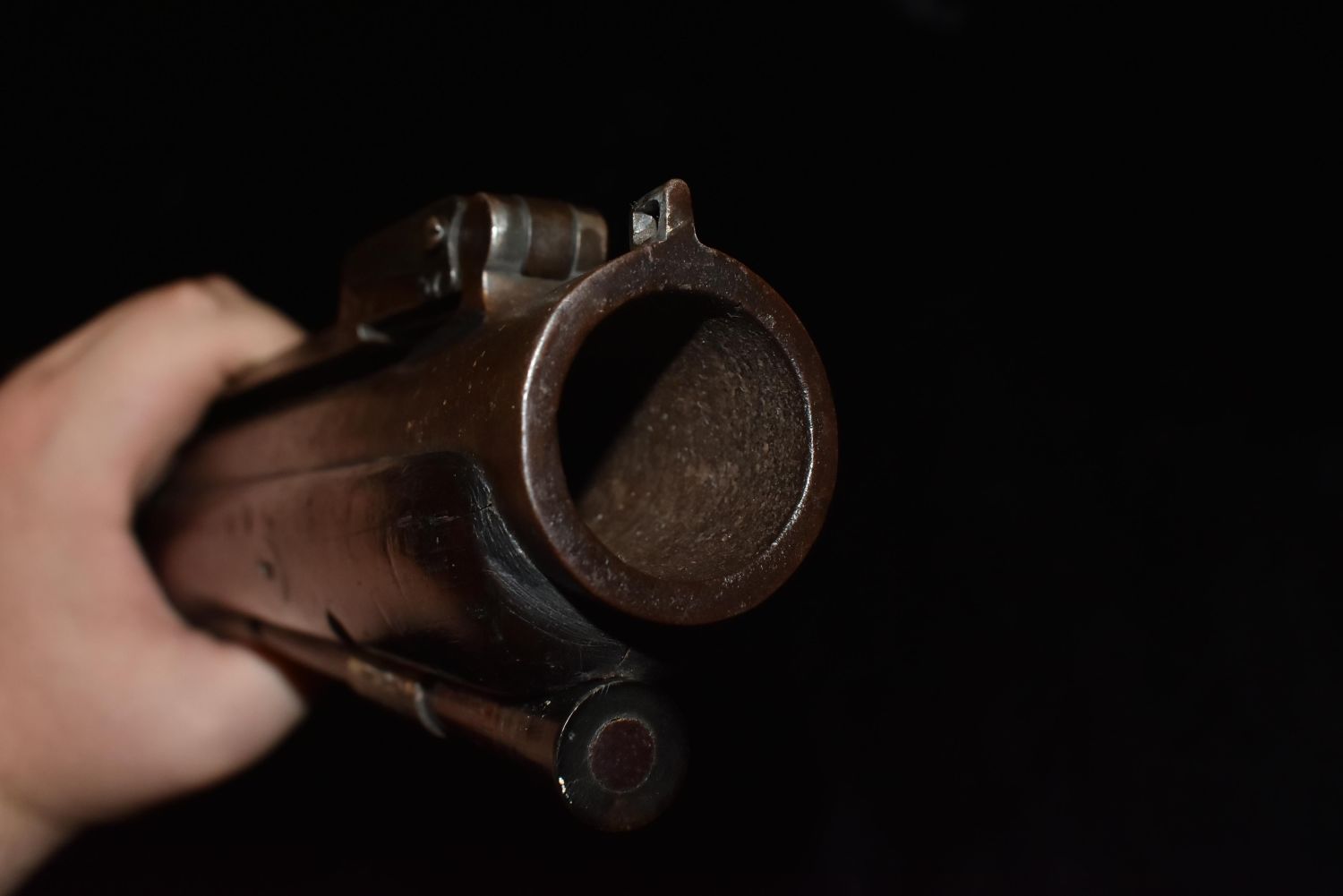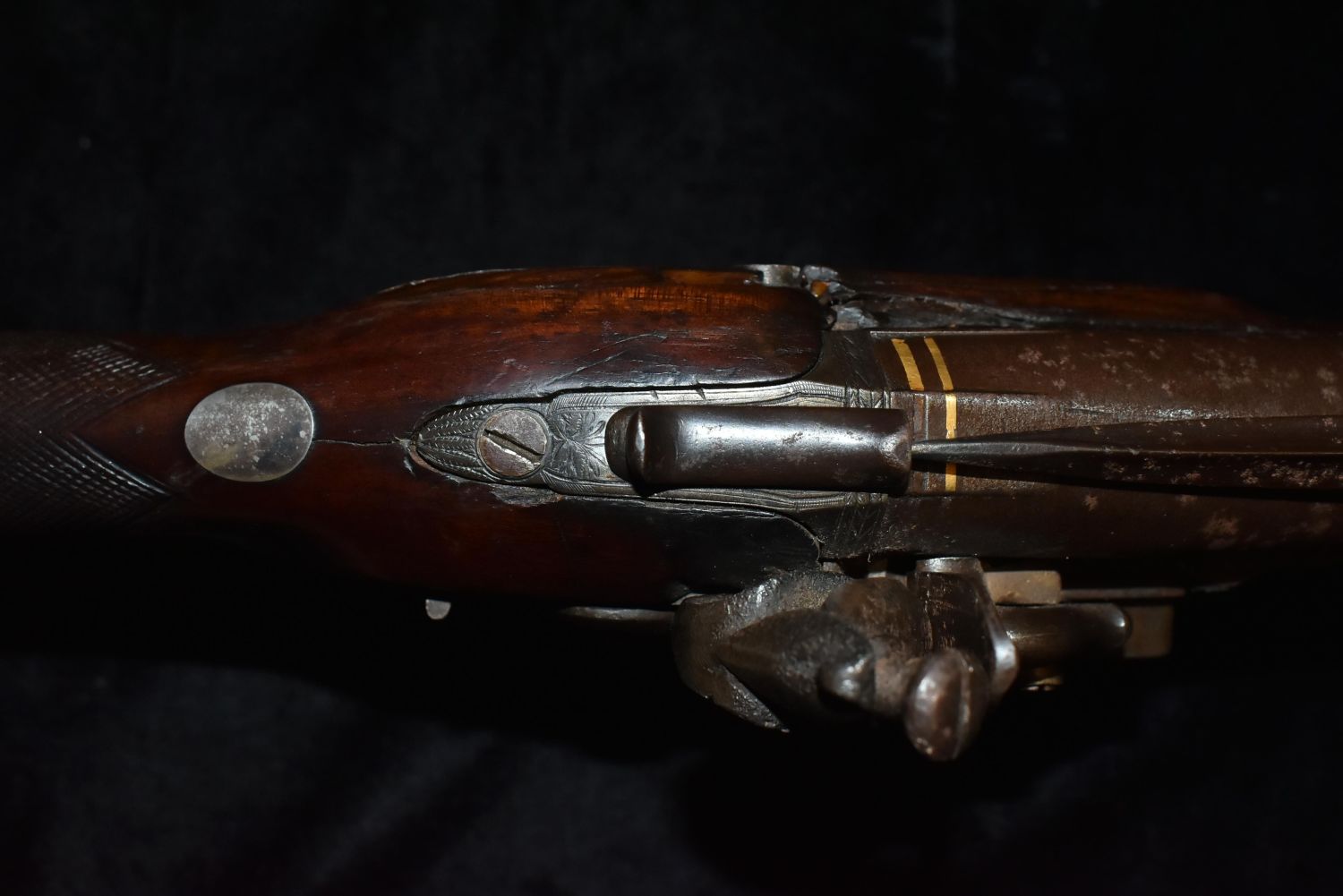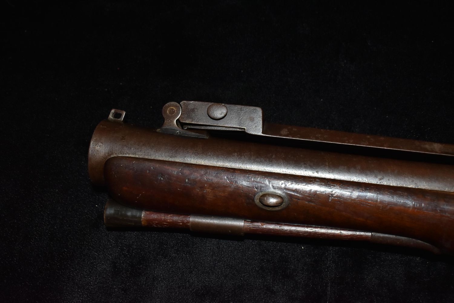 Rare Flintlock Blunderbuss with snap bayonet. Made by Davidson. 75 gauge with 14 inch barrel. Carved walnut stock